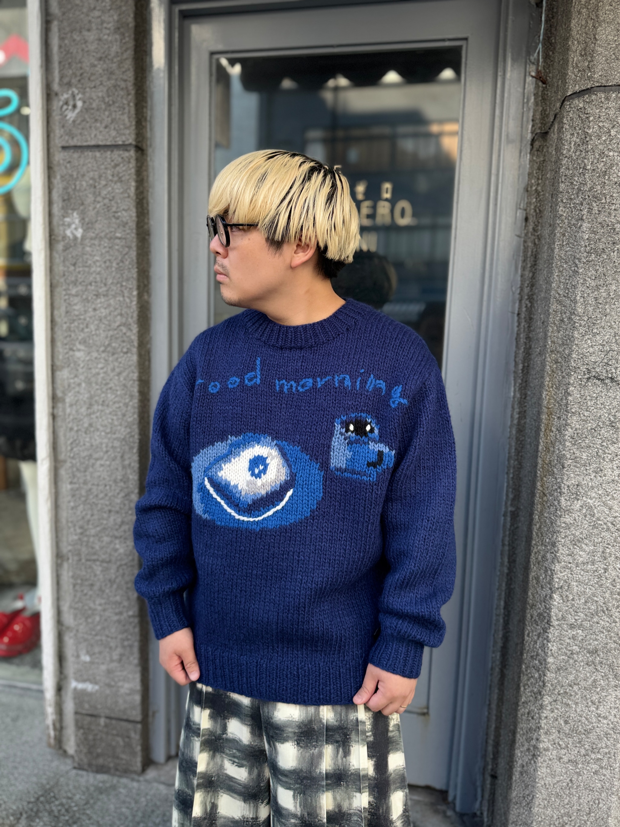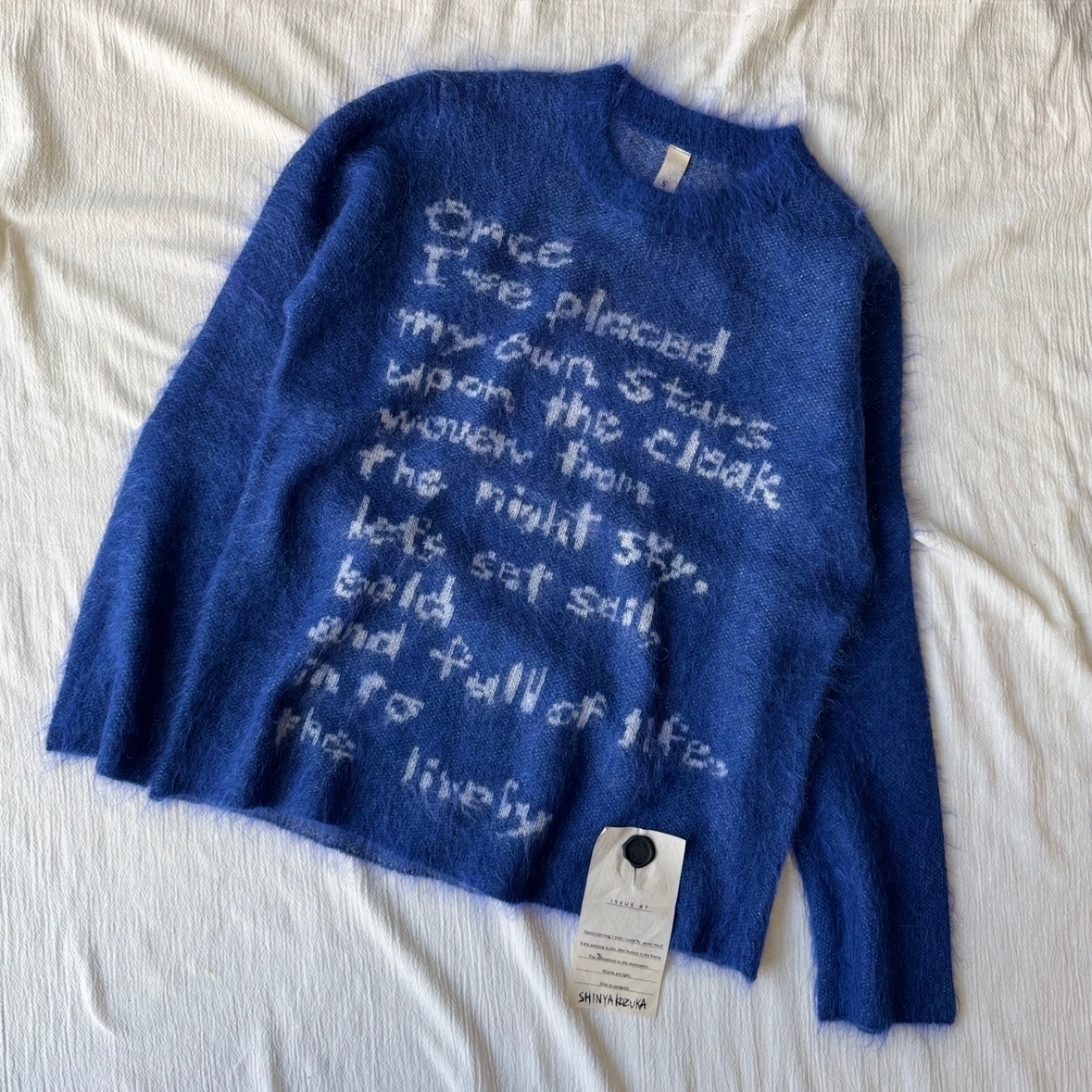 小塚さんが今回のコレクション製作にあたってのリサーチの時に読んだ「フンボルトの決意」という本の中のフレーズを手書きで書いたデザインのモヘアニットです