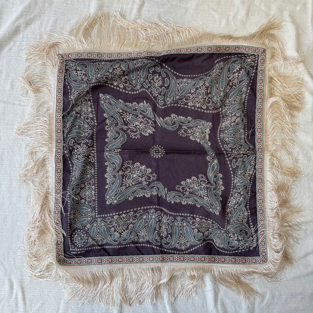 SUGARHILL / FRINGE BANDANA 定番の歪んだペイズリーと色合いが特徴的なバンダナにフリンジを施したスペシャルなバンダナ デニムと相性抜群です 【注意事項】 ※撮影時の光の加減やページの閲覧環境により、商品画像と実物とで色味が異なる場合がございます。あらかじめご了承ください。 ※お客様都合による返品はお受けできません。あらかじめご了承ください。 ブランド SUGARHILL シュガーヒル シーズン 25AW 品番 25331011 素材 BODY : COTTON 100% FRINGE PART : RAYON 100% RIBBON PART : POLYESTER 85% , LYOCELL 15% サイズ 0(フリーサイズ) : 49cm×49cm(バンダナ部分)