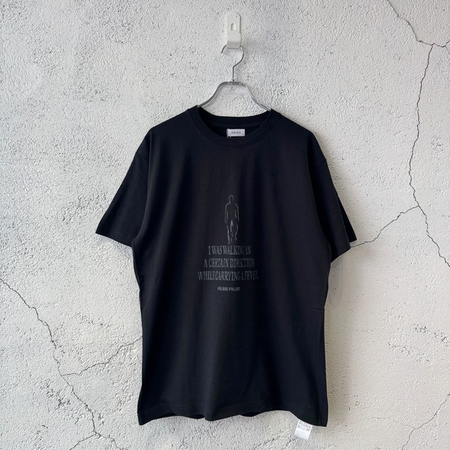 FILME FILLED / Swet T / Black 汗染みをイメージしたステンシルプリントを施したTシャツ ”I WAS WALKING IN A CERTAIN DIRECTION WHILE CARRYING A FEVER.” 「私は熱を抱えながら、ある方向へ歩いていた。」 当店ではsize 3をセレクトしています ブランド FILME FILLED シーズン 26SS 品番 S-FF2F6TS1 素材 100% Cotton サイズ 3 : 肩幅50.5cm 身幅55.5cm 着丈74cm 袖丈22cm FILME FILLED デザイナー:田畑 大地 沖縄生まれ。陸上自衛隊、映像制作を経験ののち独学で”服づくりを始める。 ”coconogacco”、”me”を経て 2023年3月 "FILME FILLED"をAW23よりスタート。 映画の空気感やデザイナー自身が日常で感じたものを、ファッションの現実世界に介入する役割を借りることでファッションデザインに昇華させる。 デザイナー自身のルーツにあるミリタリー要素と感情が揺さぶられた時に生じる非日常な身体感覚を反映した歪みのある変則的なパターン、テキスタイルが特徴。
