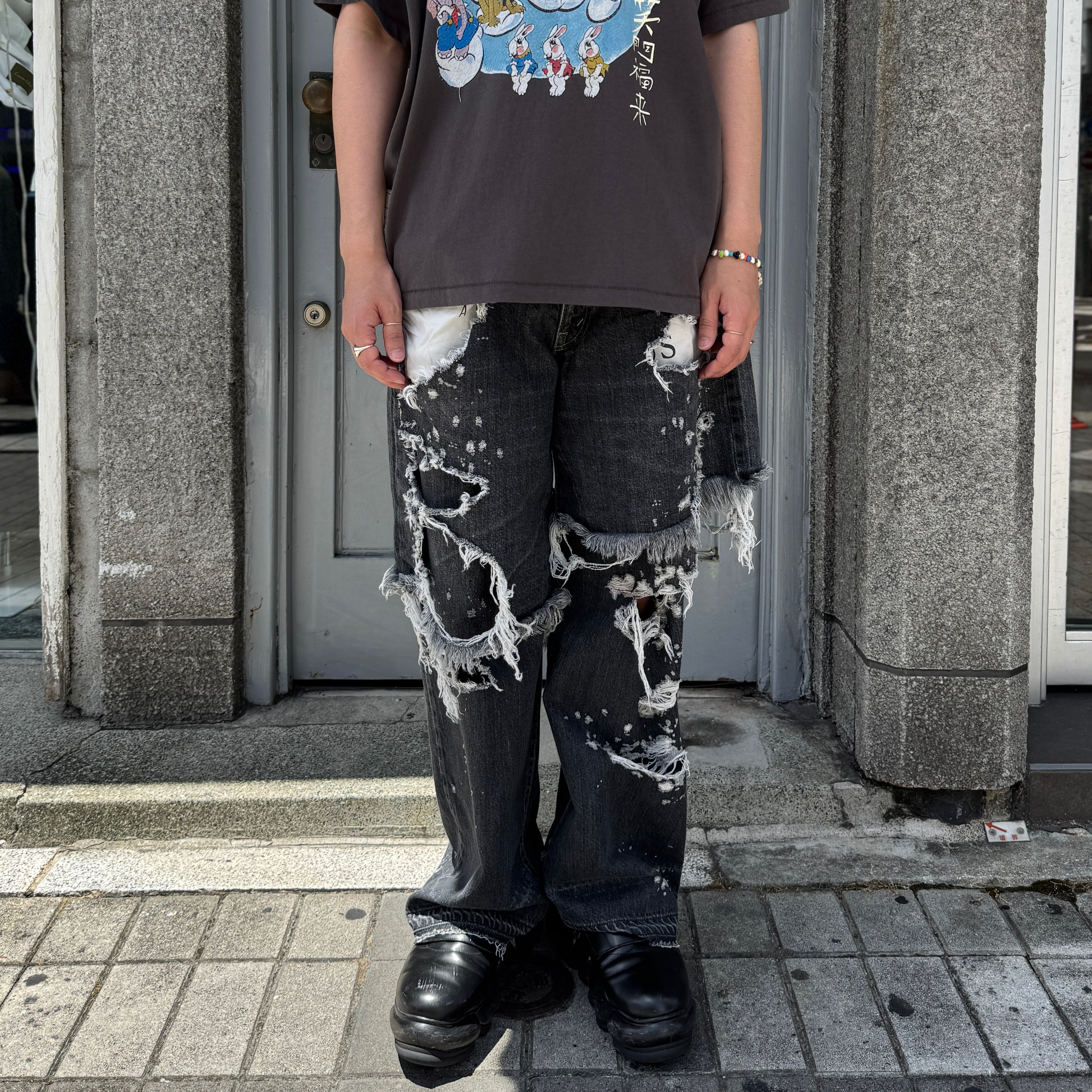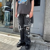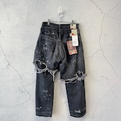 2本のデニムパンツと重ね着したようなデザインと激しいダメージ加工がインパクト抜群の1着です