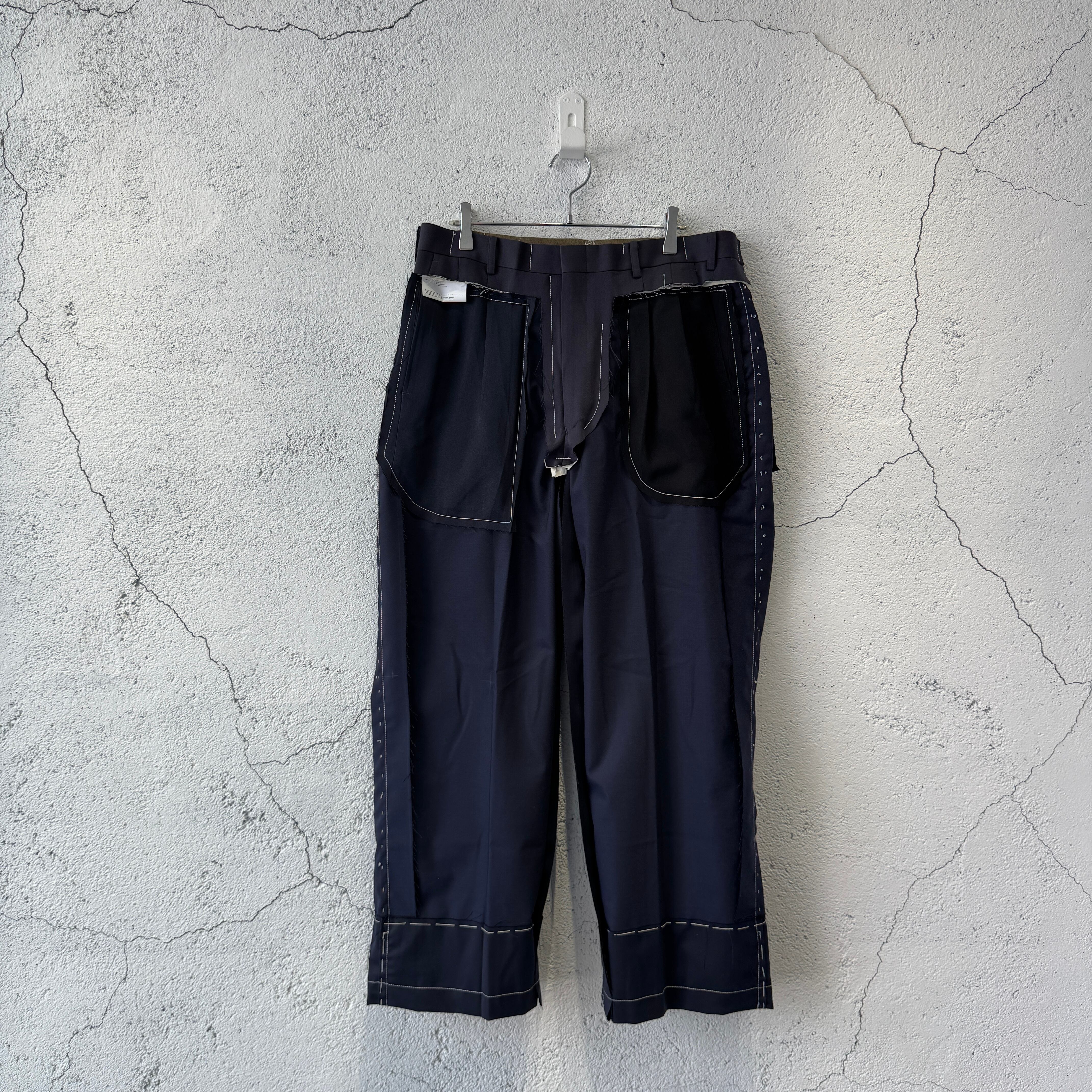 大量生産され余ってしまった新品のスラックスから取ったポケットやベルトを縫い付け、遊び心をプラス。