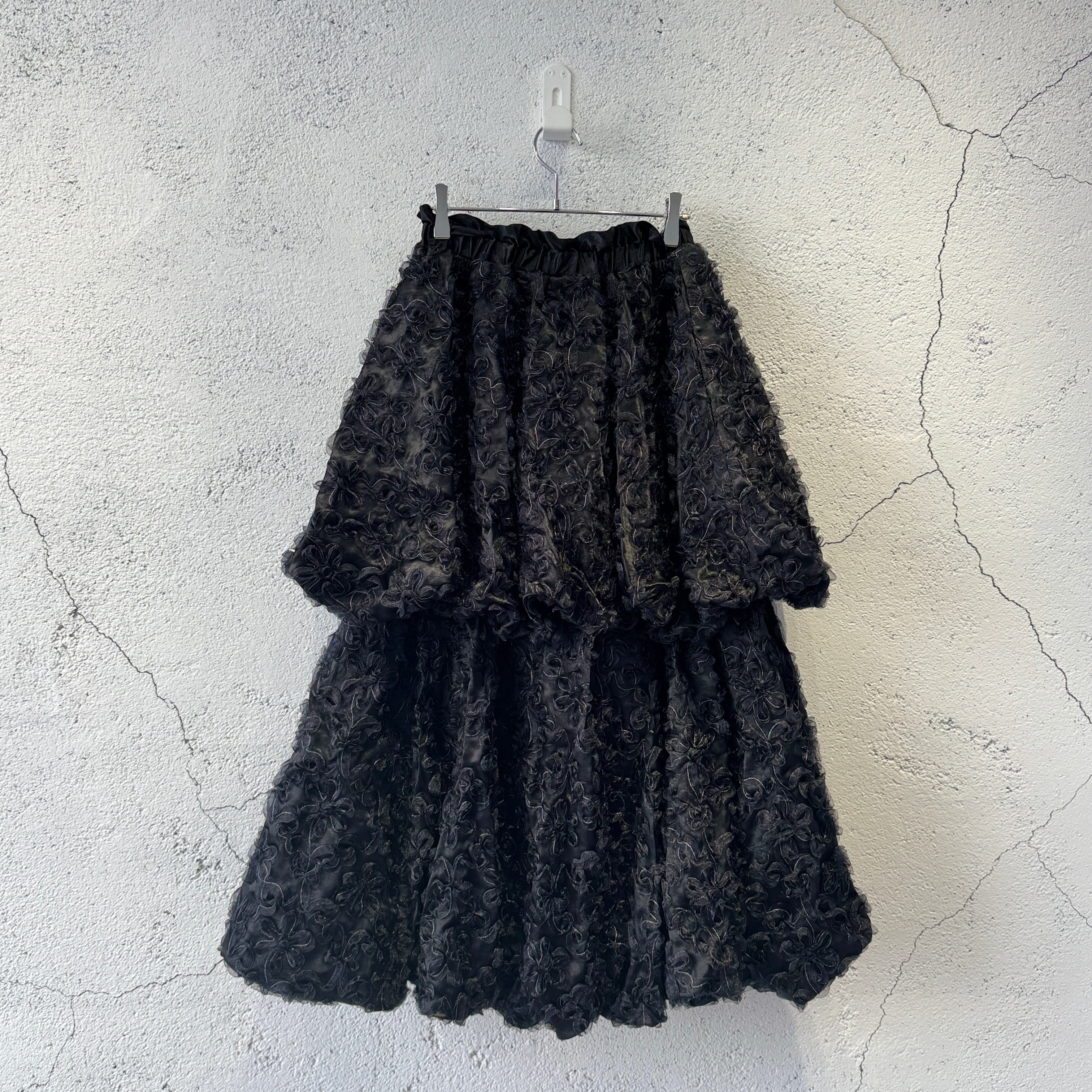 魔法の呪文のように取り巻くオーガンジーテープの刺繍を贅沢に施したアセテートサテン素材を使用した、ボリュームスカート