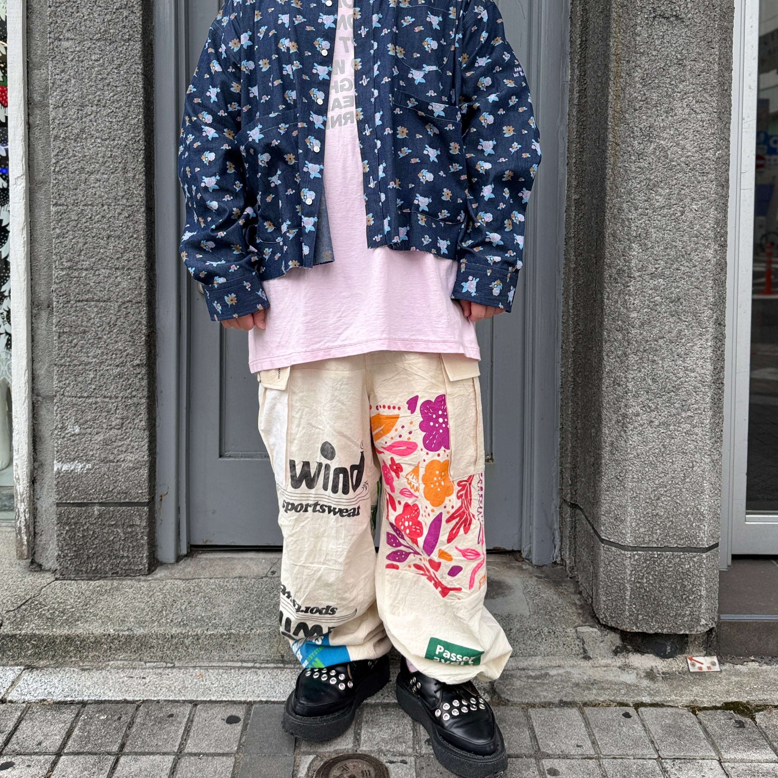 古着のトートバッグを解体し、パッチワークで再構築したアップサイクルカーゴパンツ