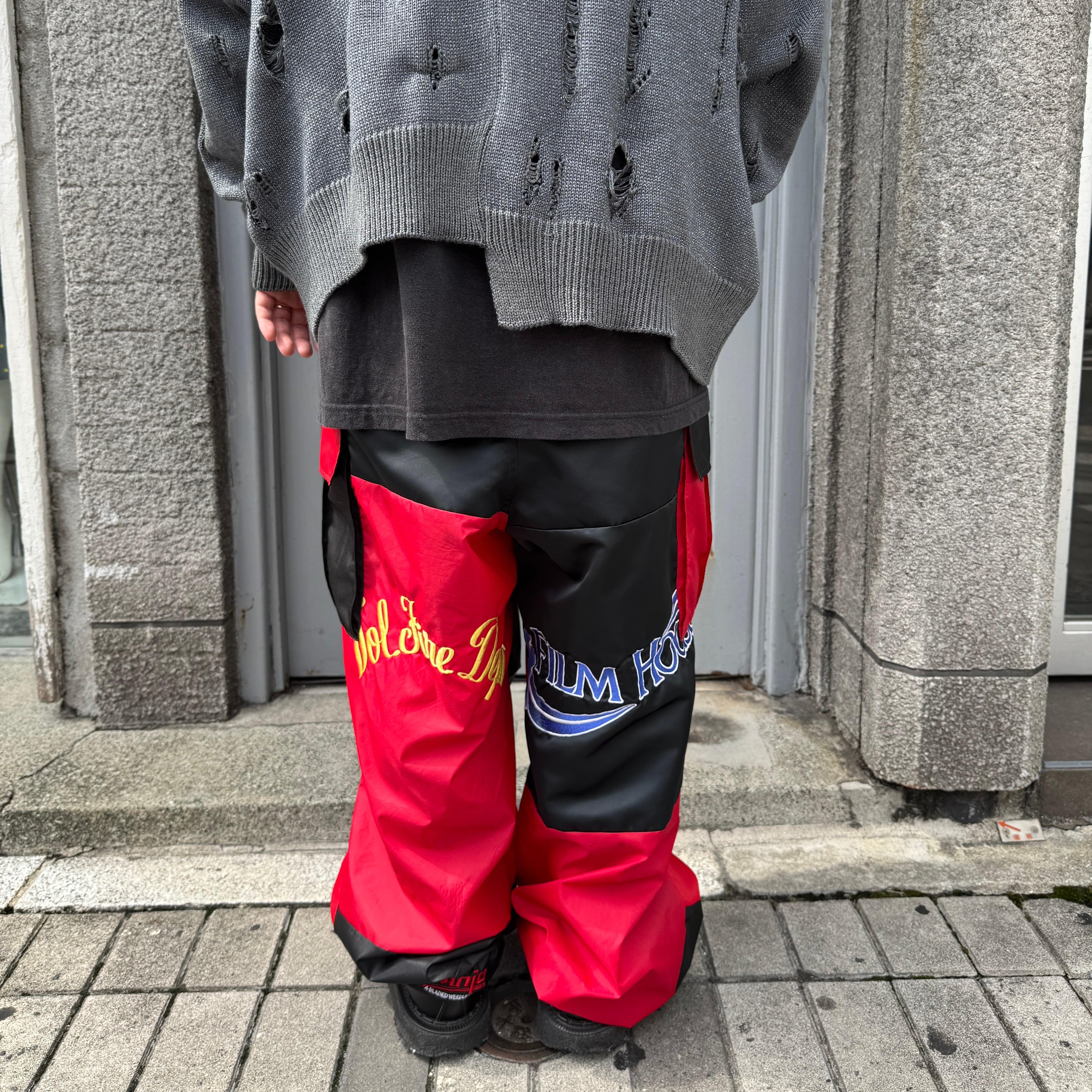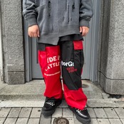 多数の古着コーチジャケット、スポーツジャケットを解体し、ランダムなカラーでパッチワークを施し、アップサイクルカーゴパンツに再構築