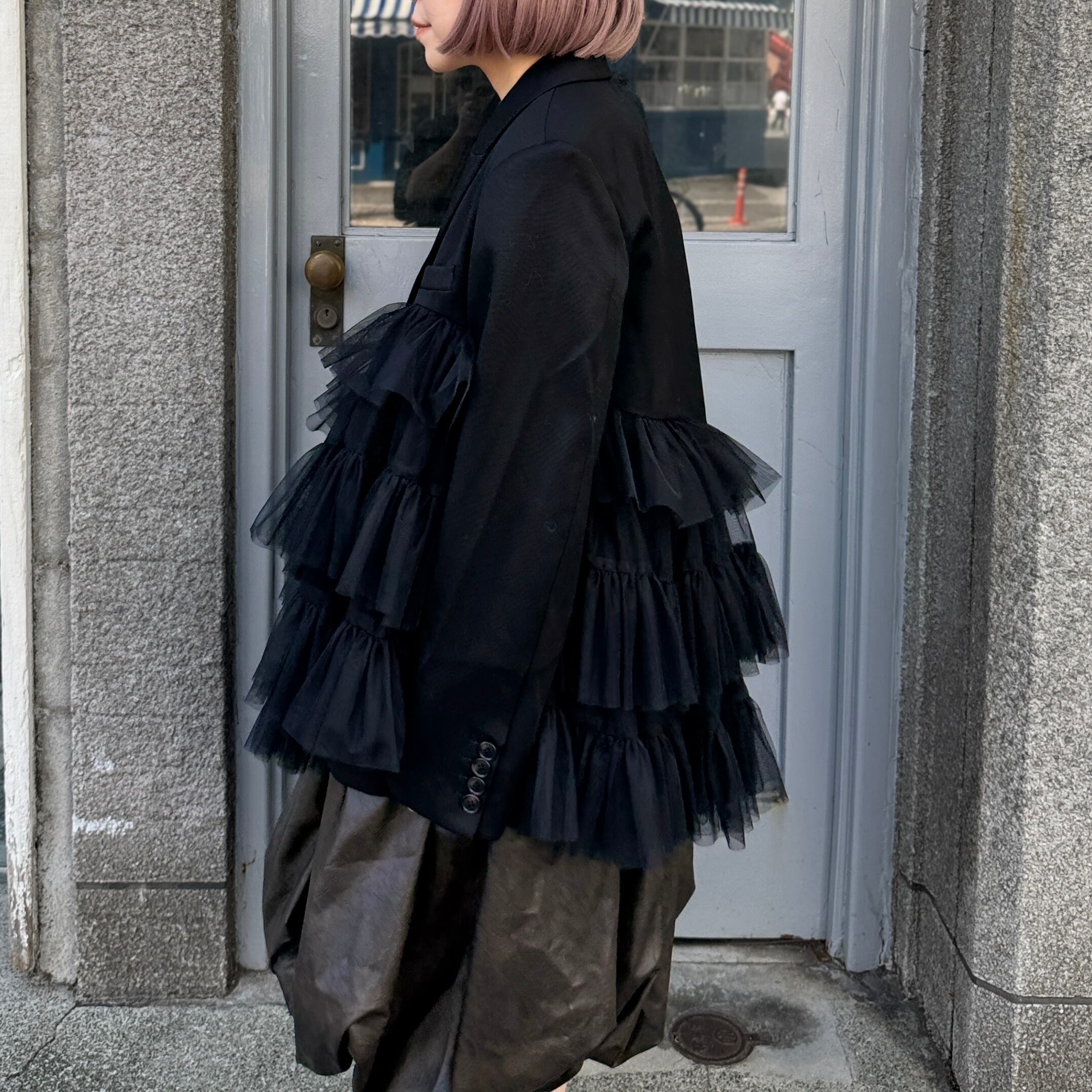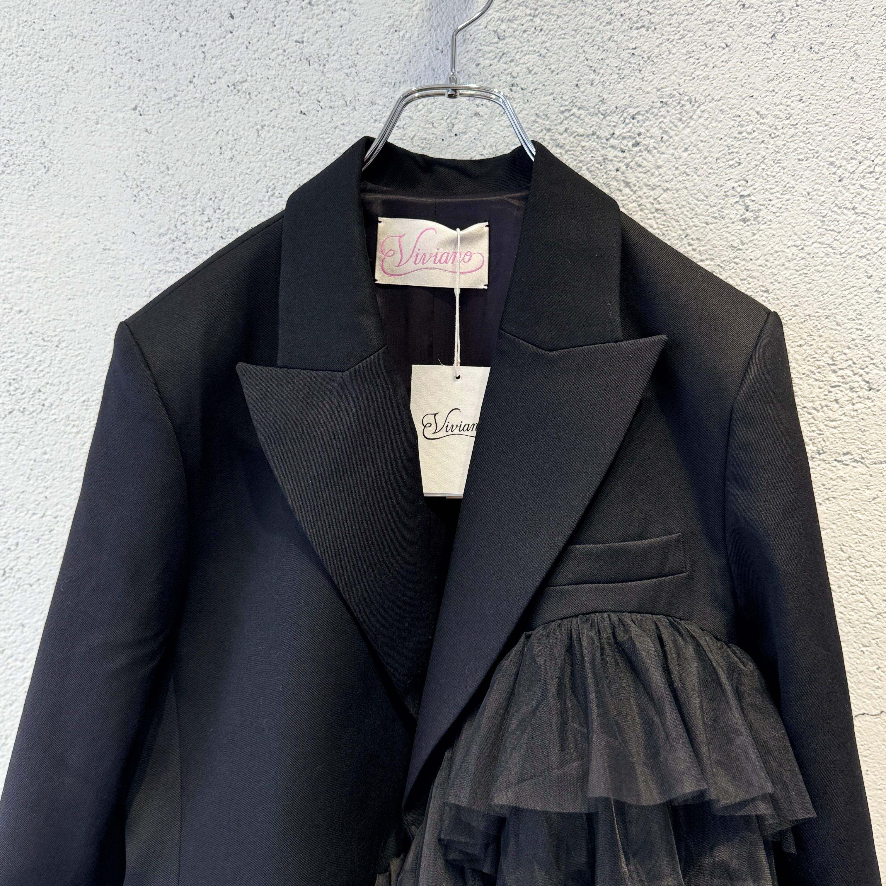 滑らかなソフトチュールがティアード状に左右アシンメトリーに施されたテーラードジャケット