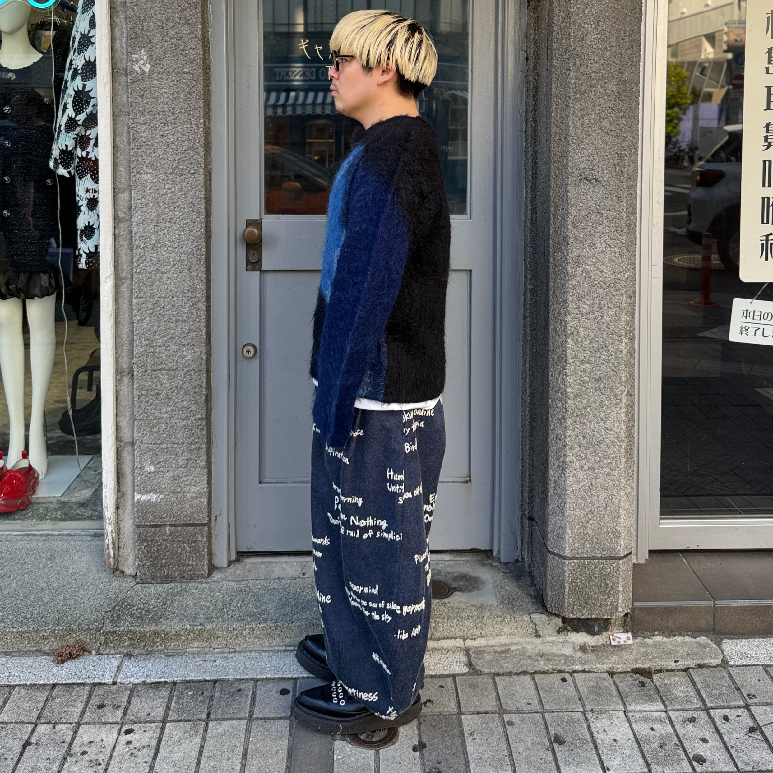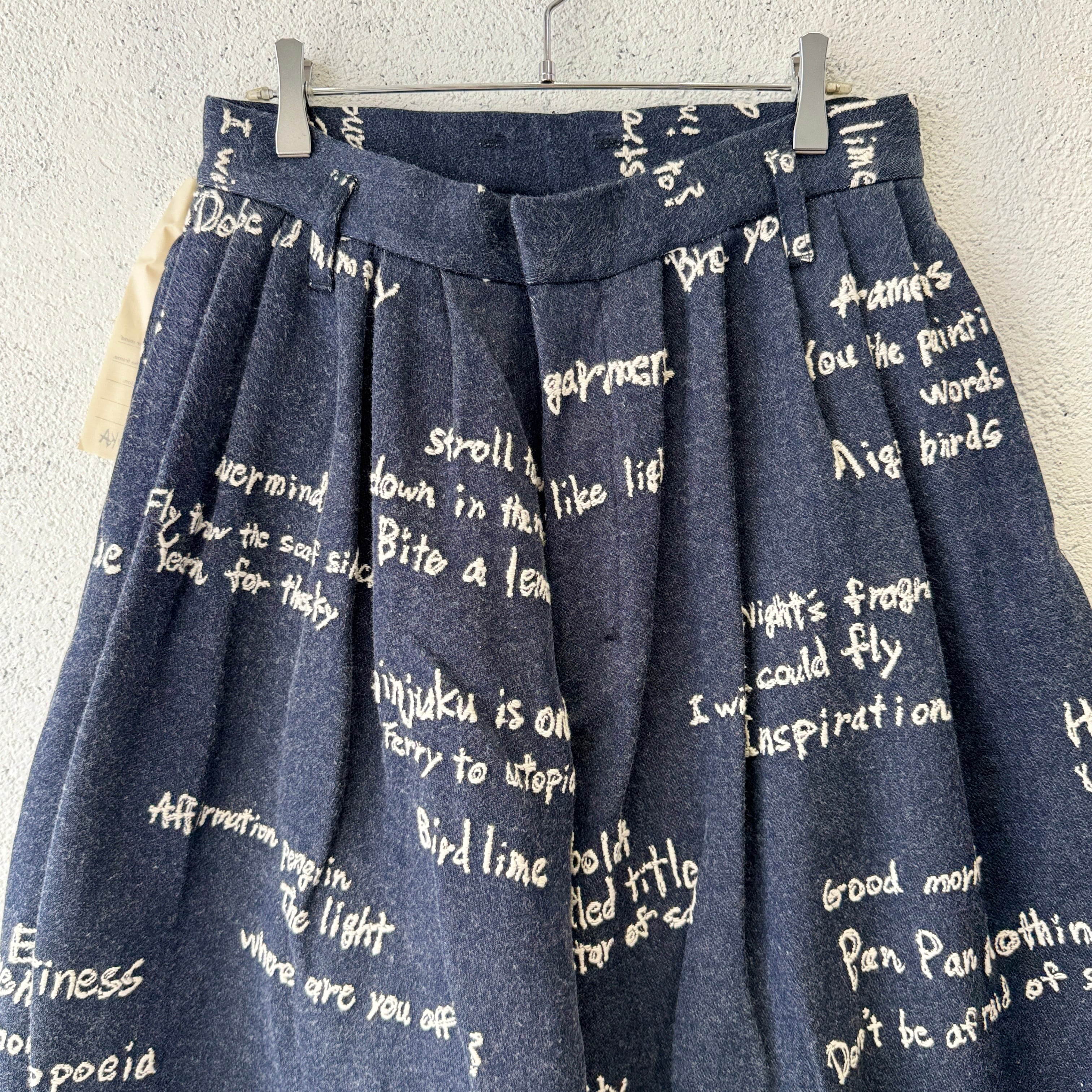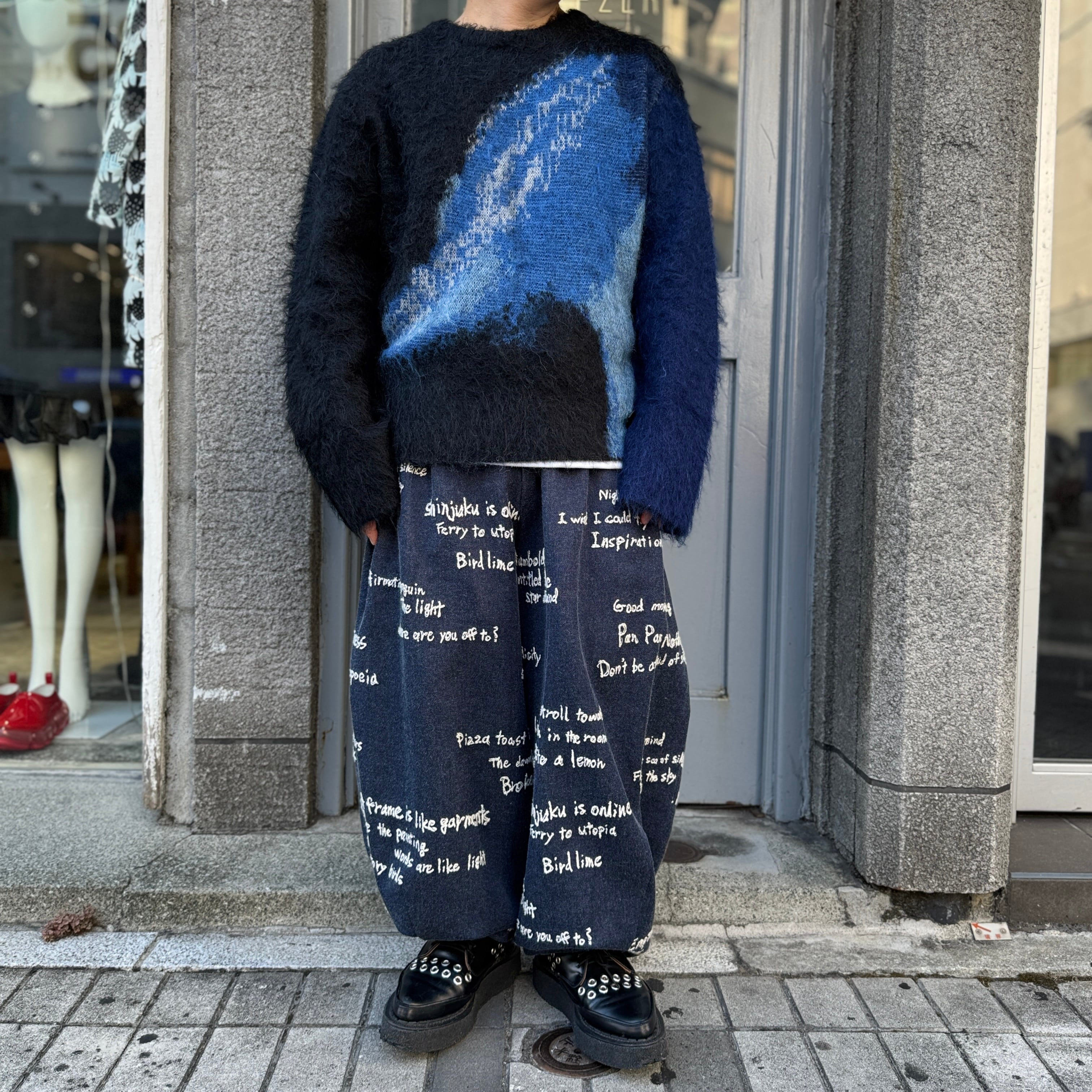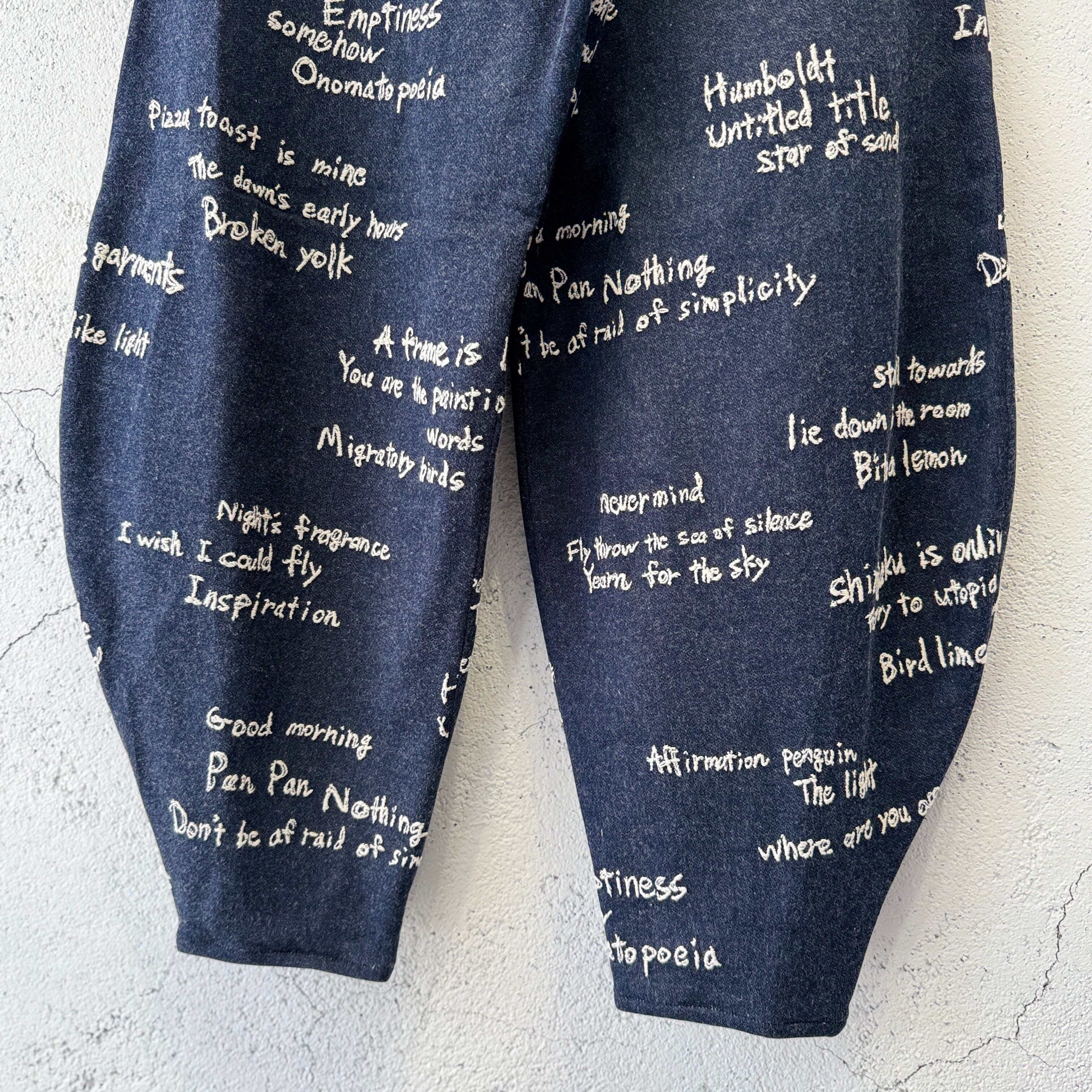 デザイナーによる手描きのテキストをジャカードで表現した柄がインパクト抜群です