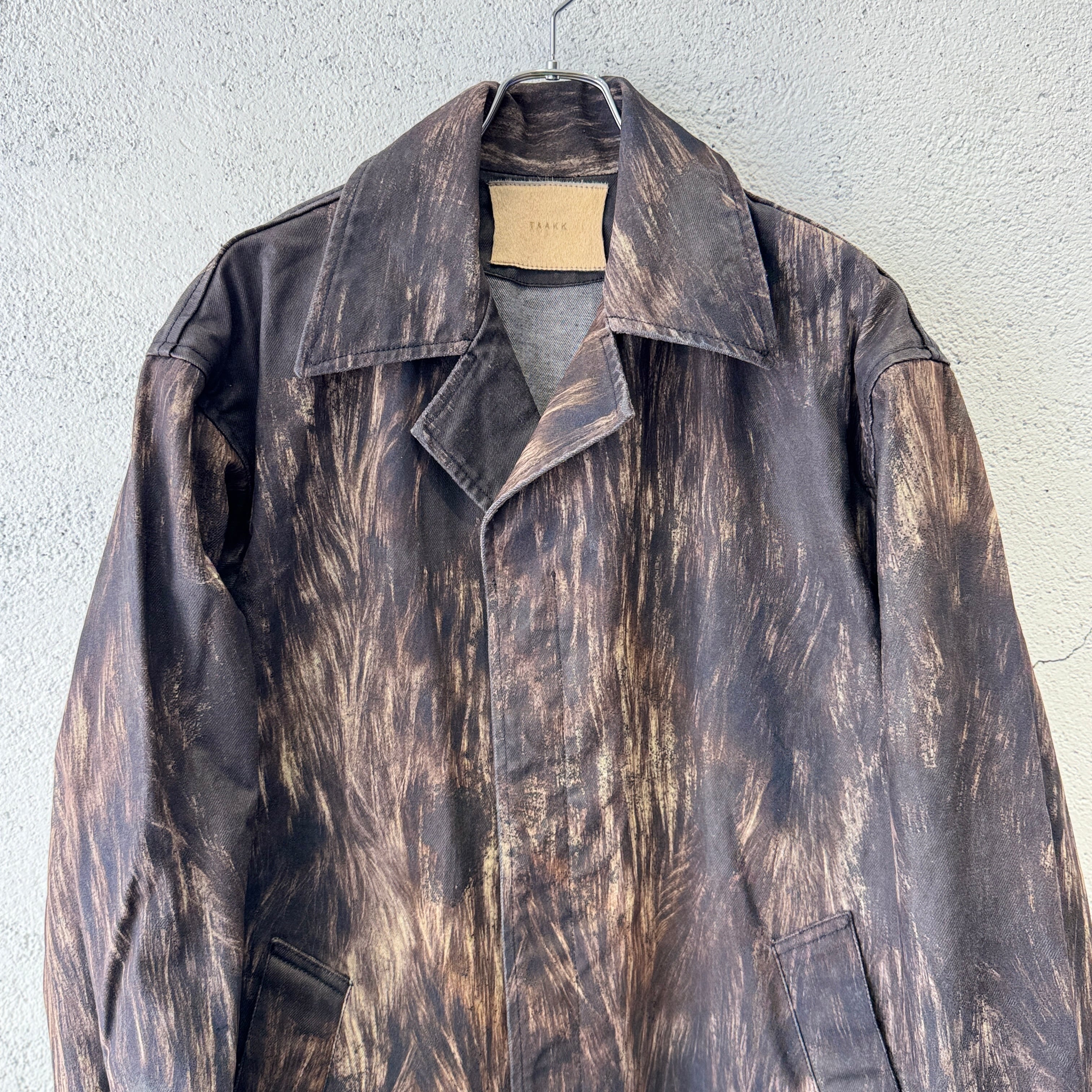 TAAKKの新しい技術キメラテクニックを使用して、デニムの中に組織の違うファーの柄を埋め込んだようなファブリックを用いて作ったデニムコート