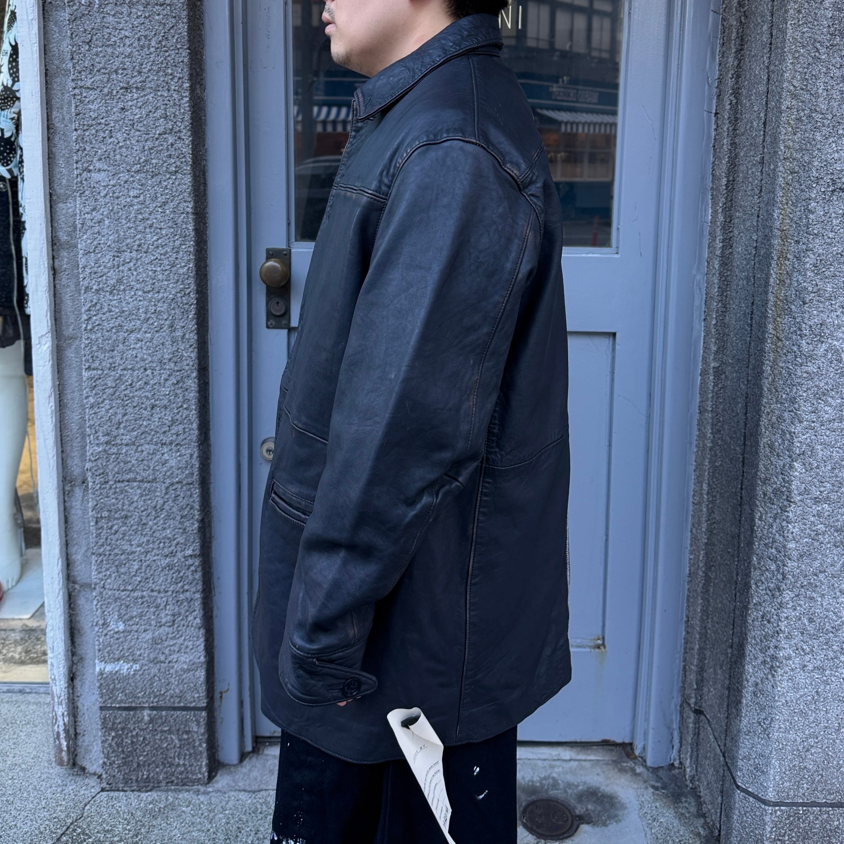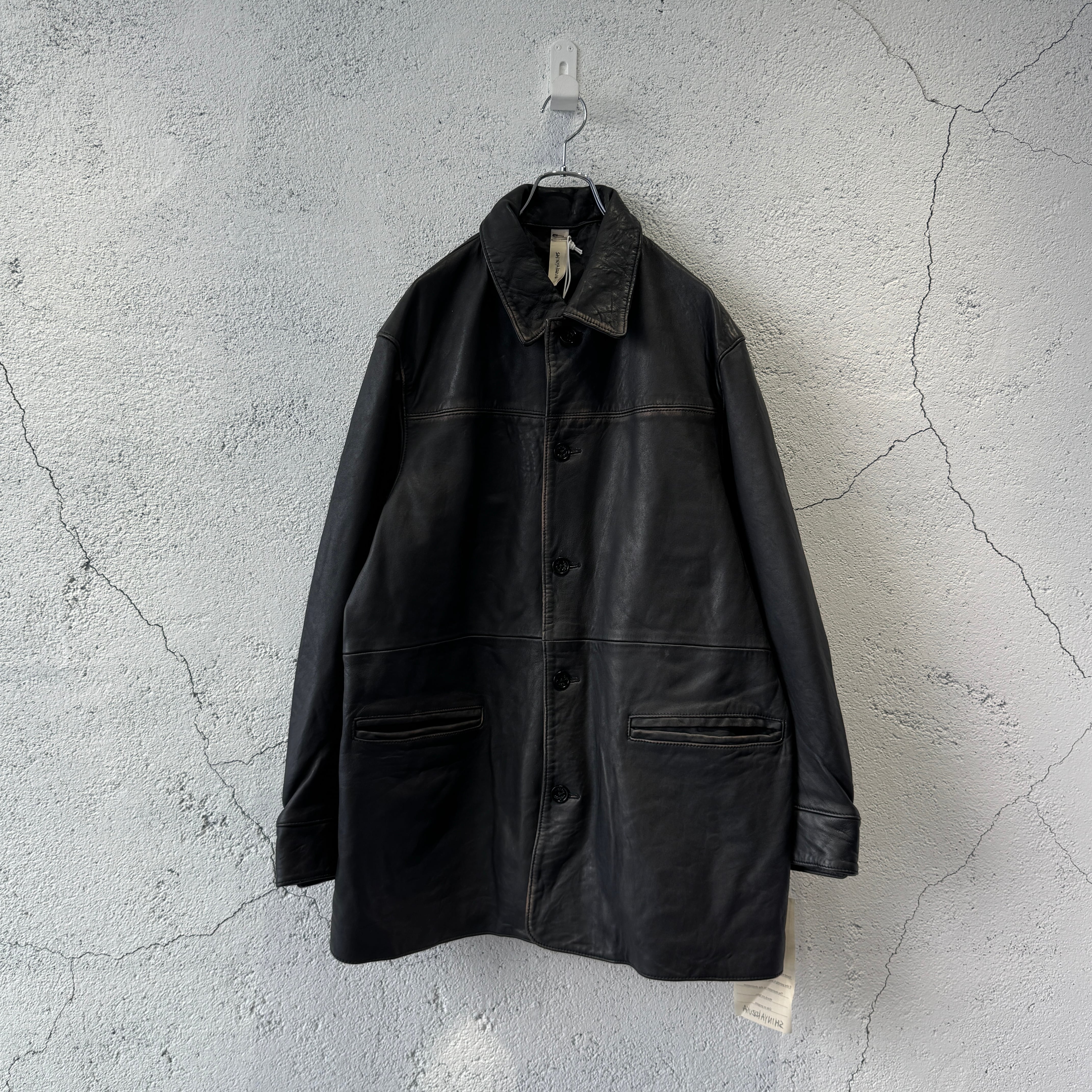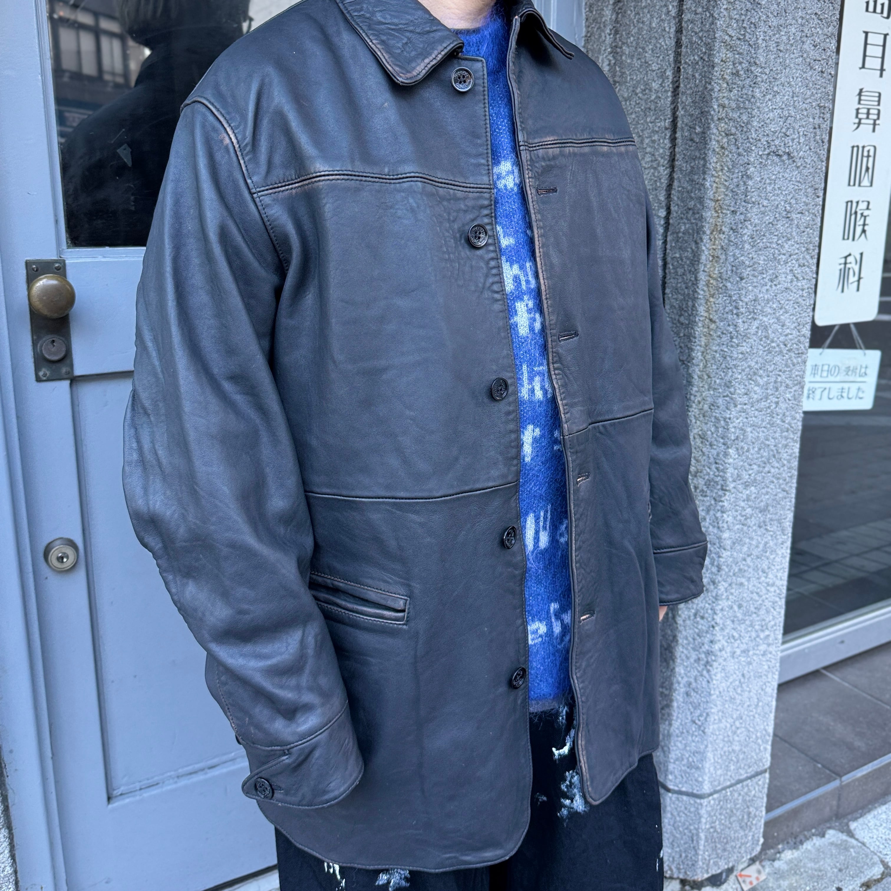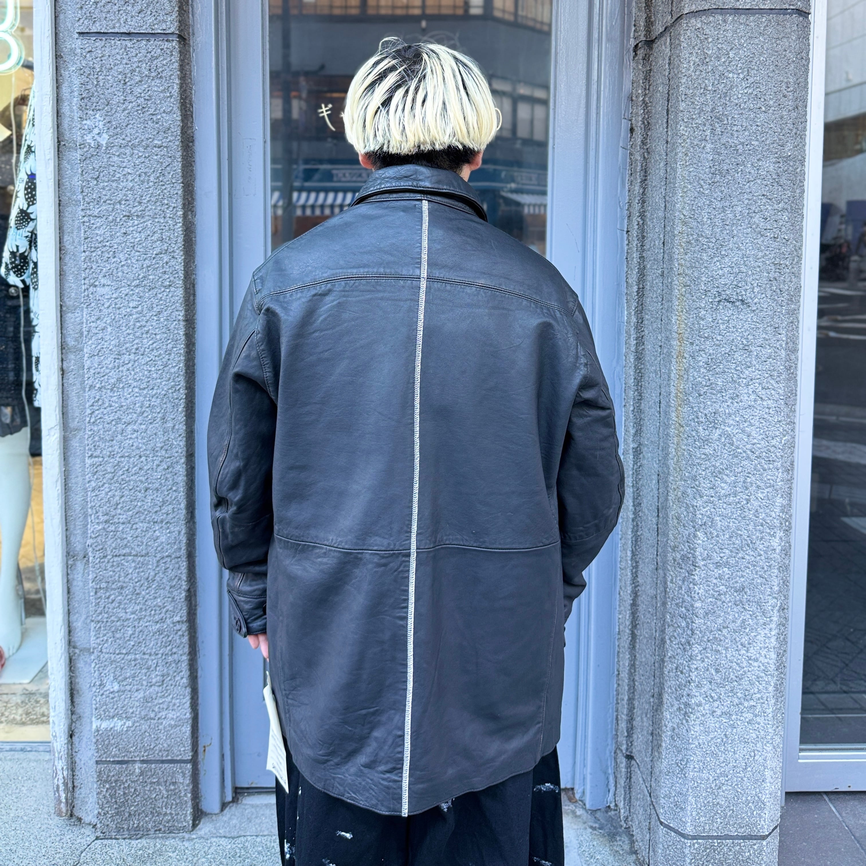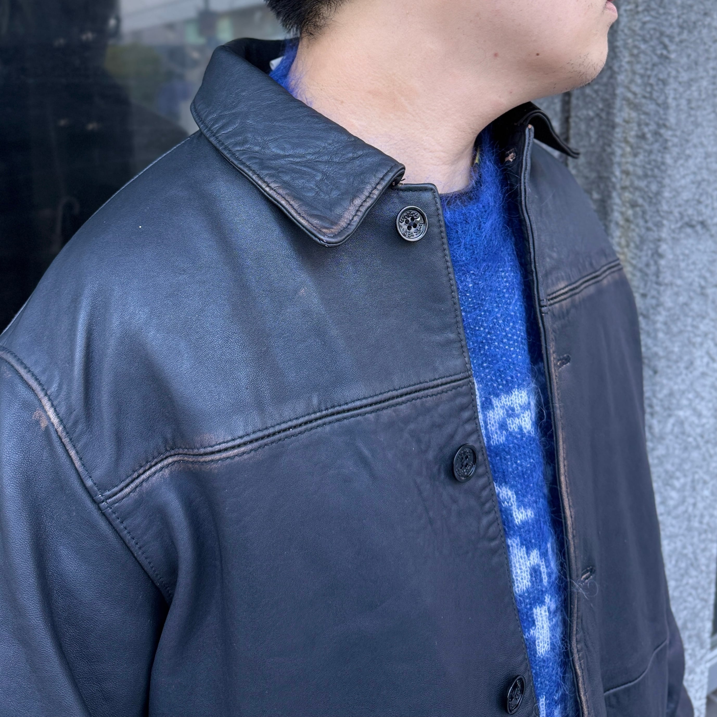 洗いをかけ、茶芯が覗くような風合いに仕上げたラムレザーのカーコート