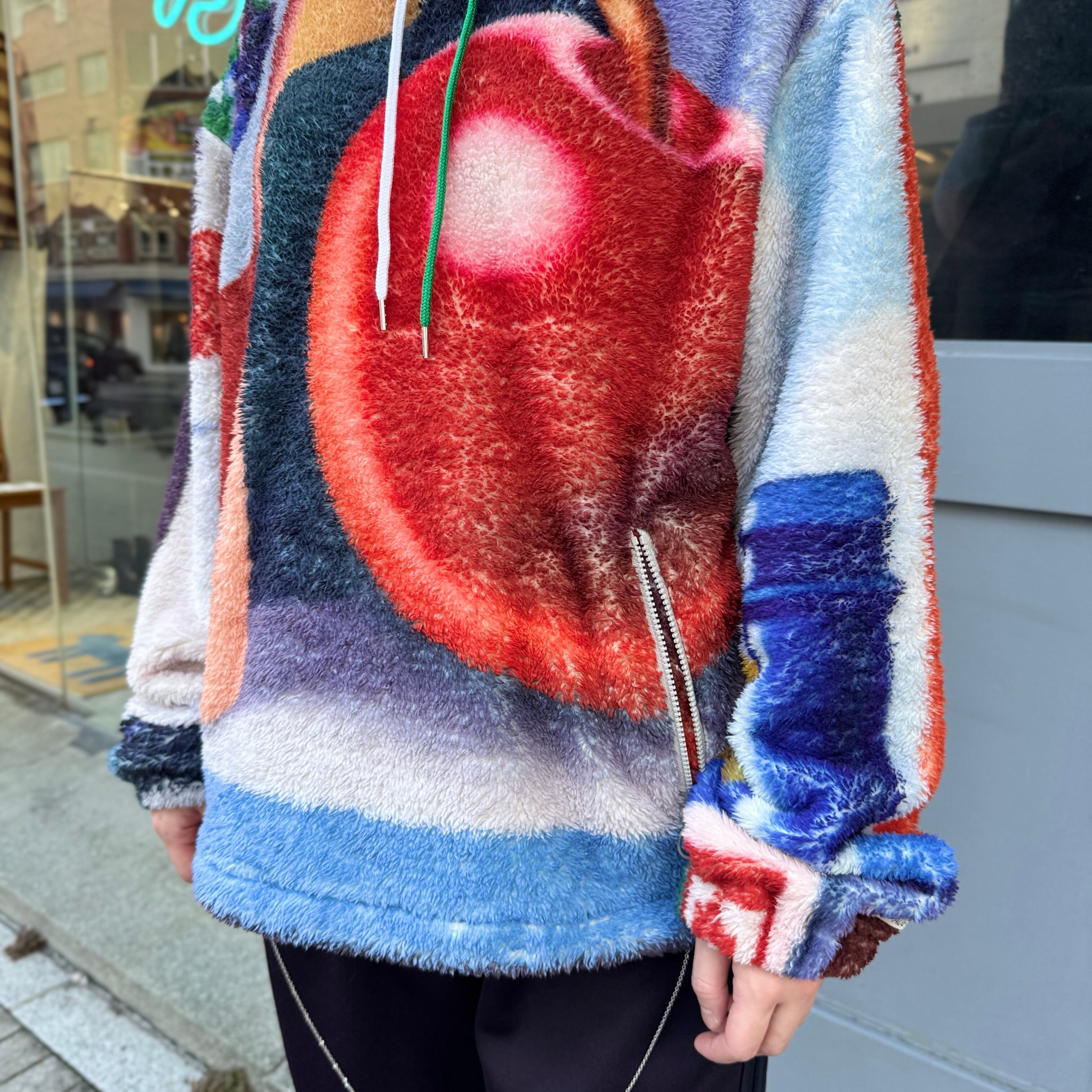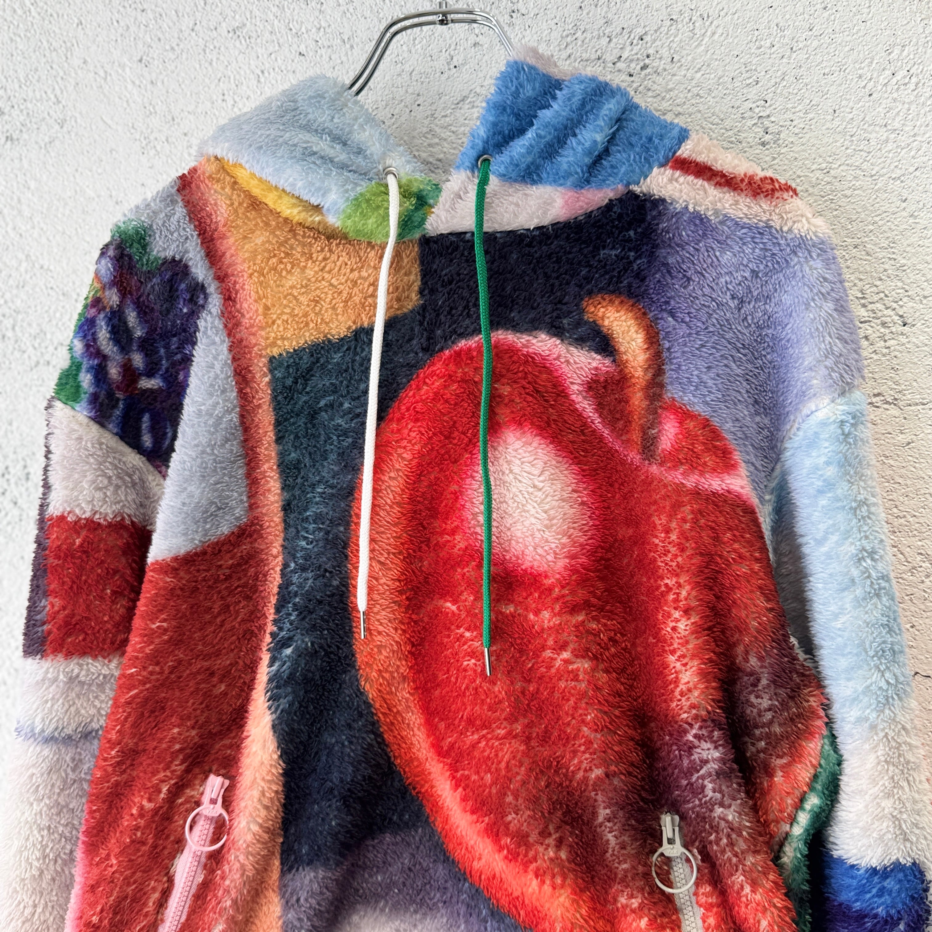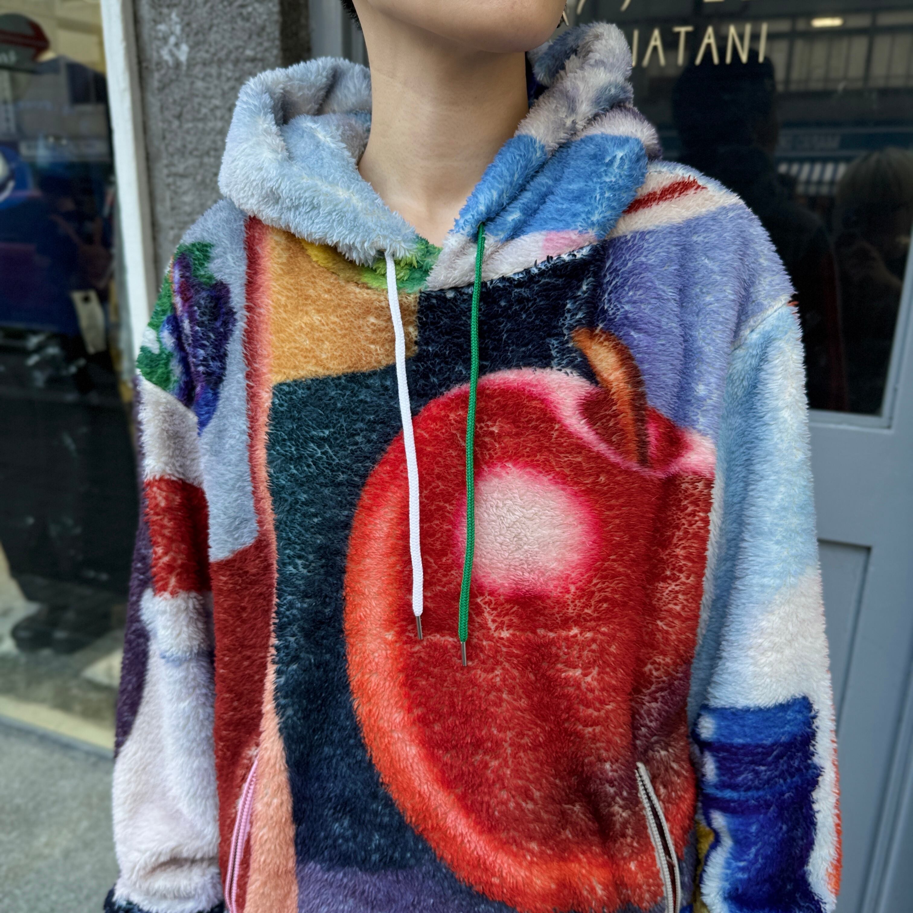 色鮮やかなグラフィックをプリントしたフリースのフーディー