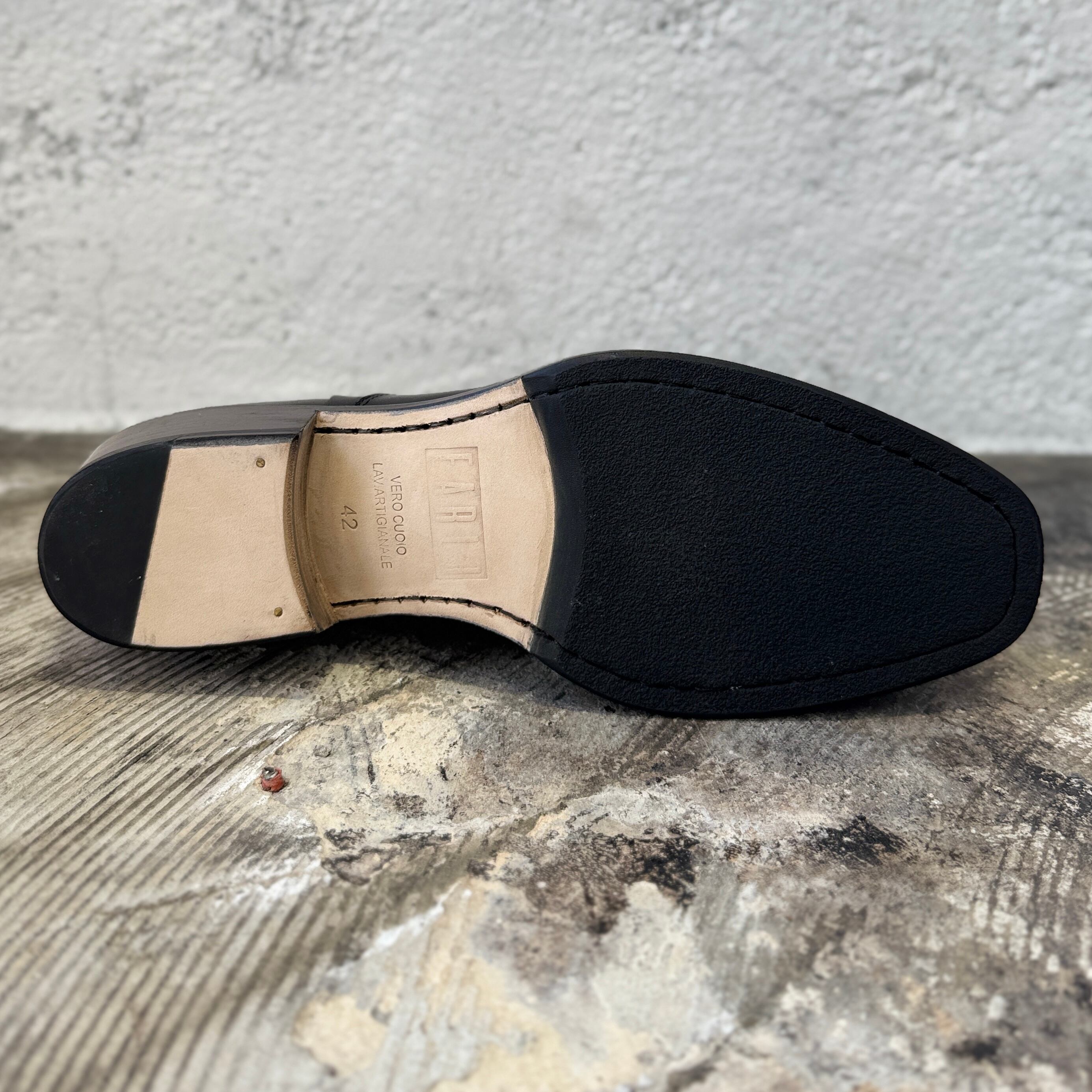 アッパーには程よい厚みと美しい肌目を持つ牛キップレザーを使用しています
