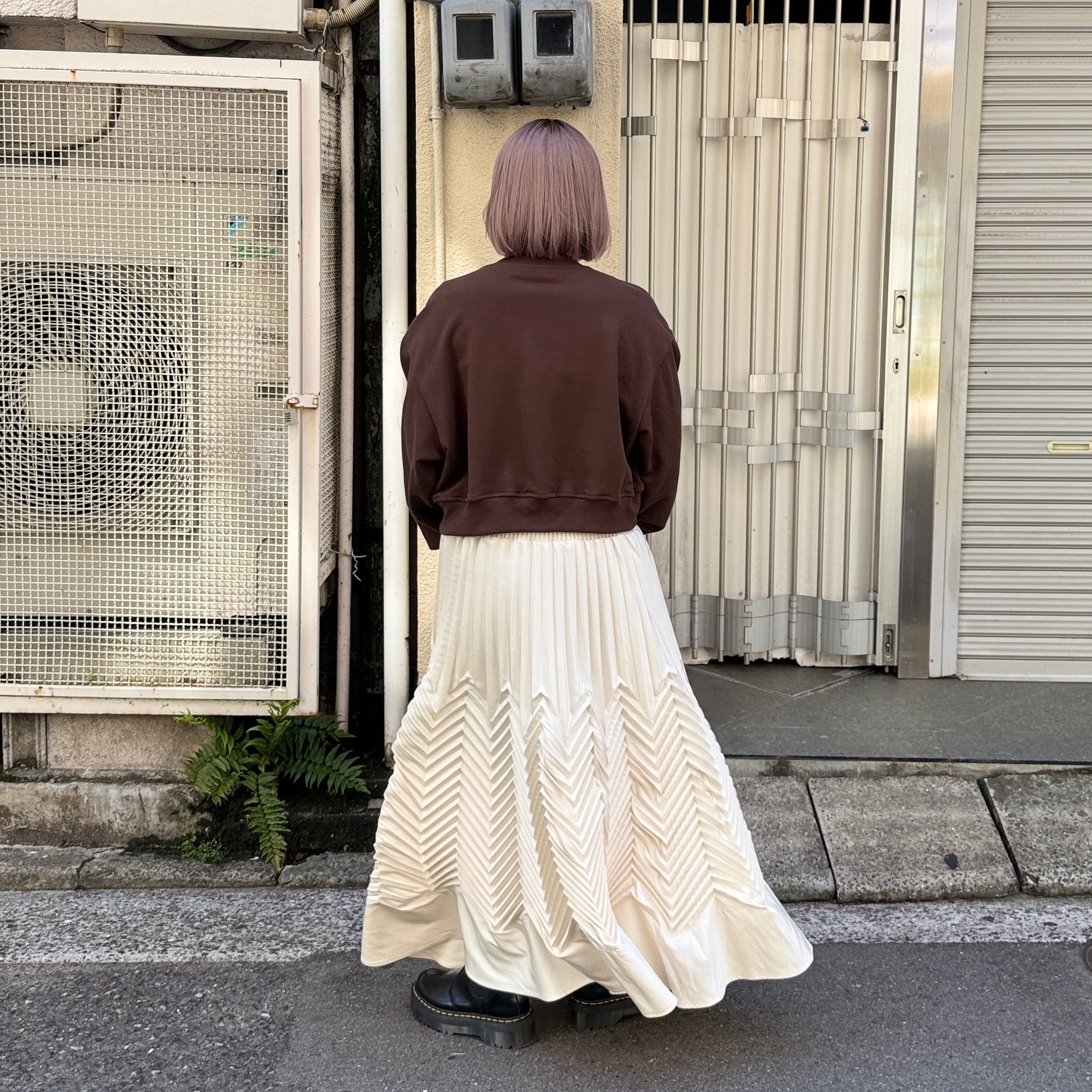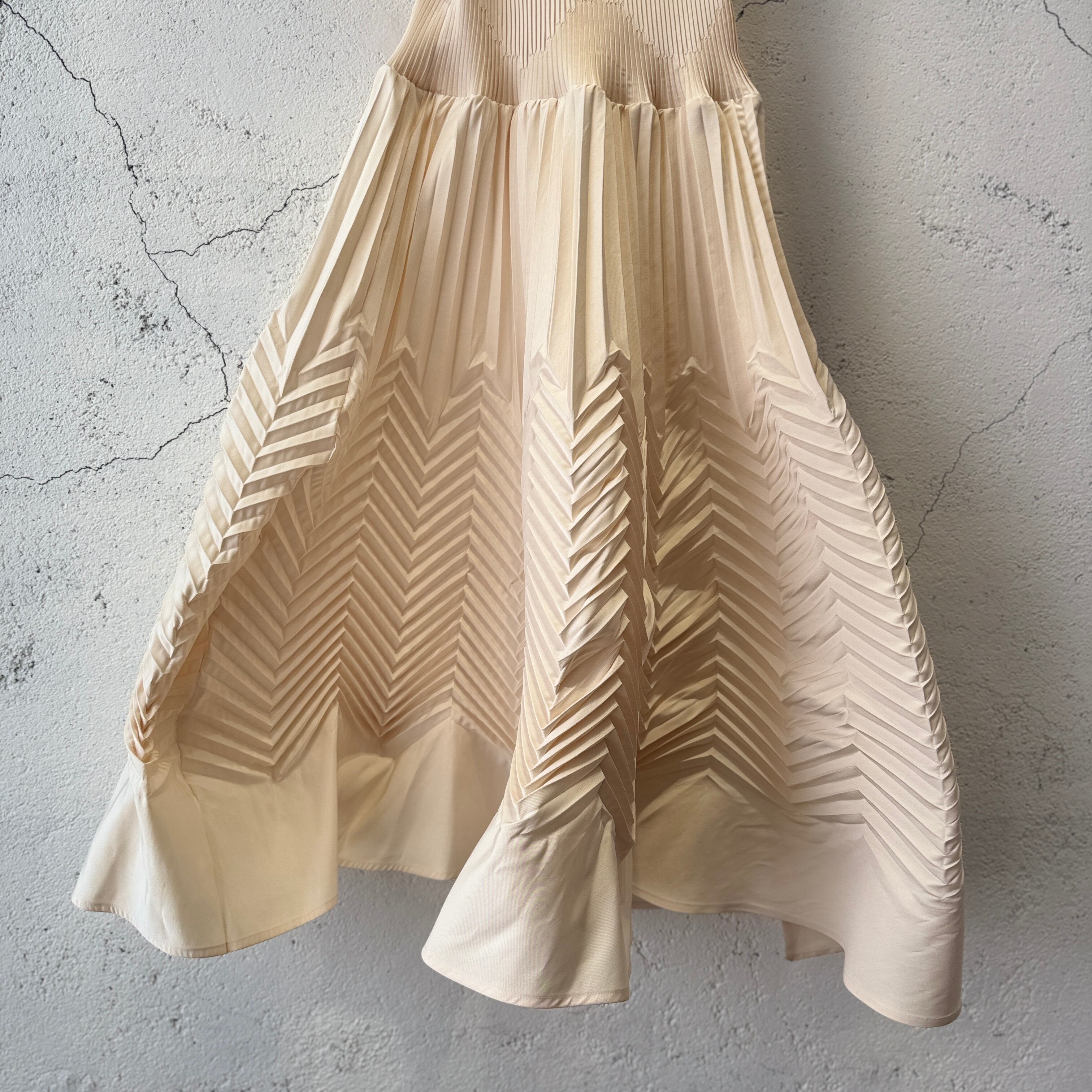 身頃には細かいプリーツの倒し方向を変えることで波柄を表現し、スカートにはジグザグのプリーツで動きを出しています