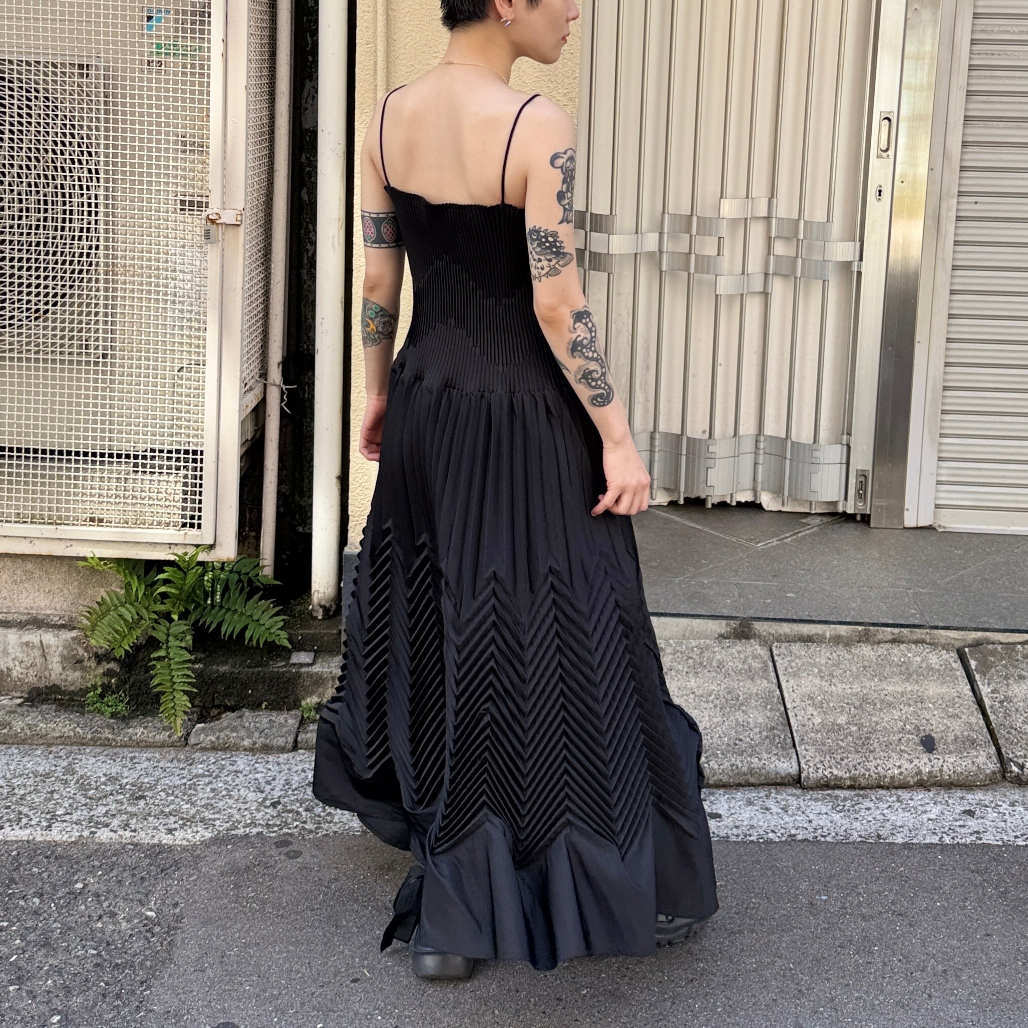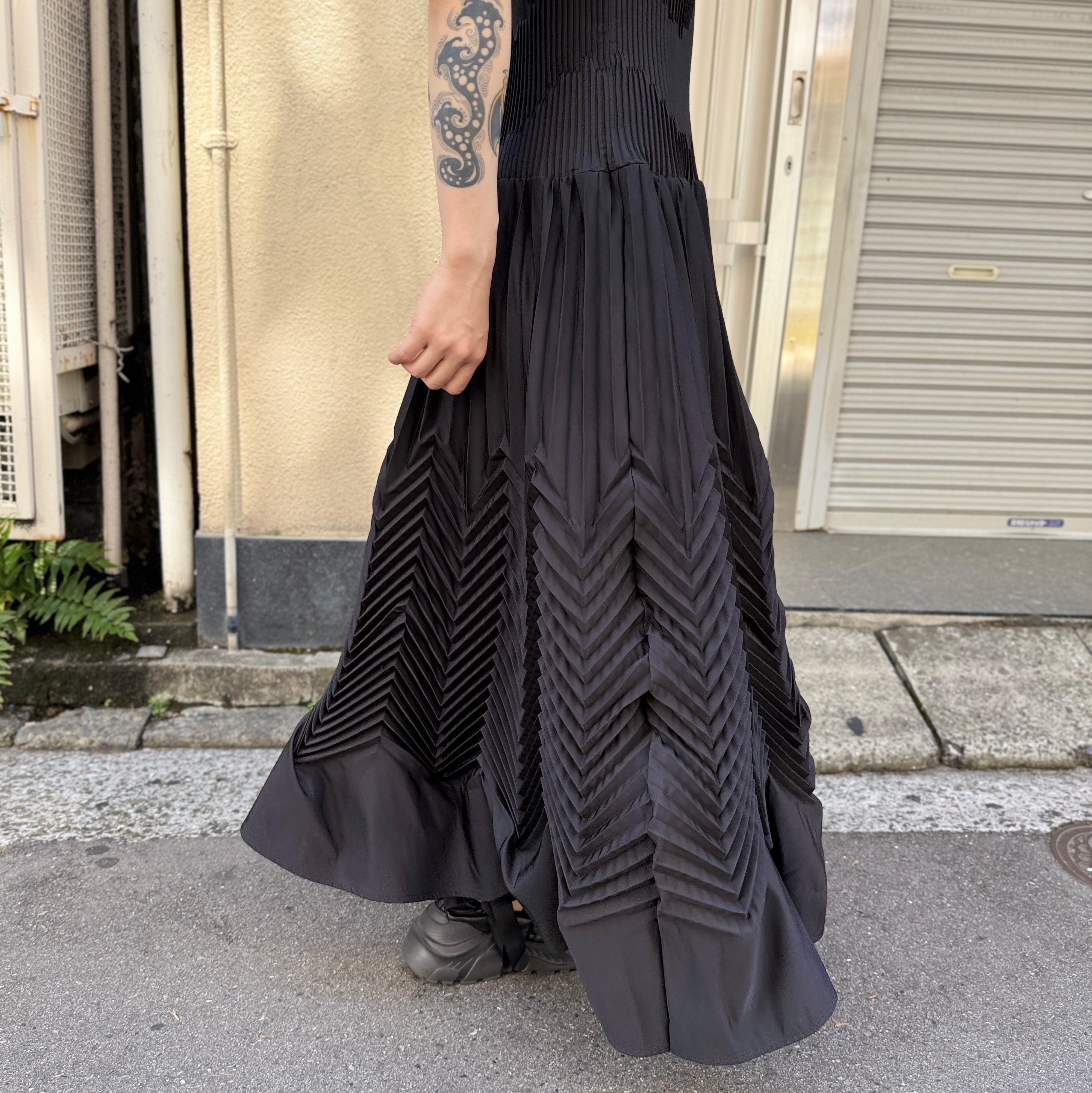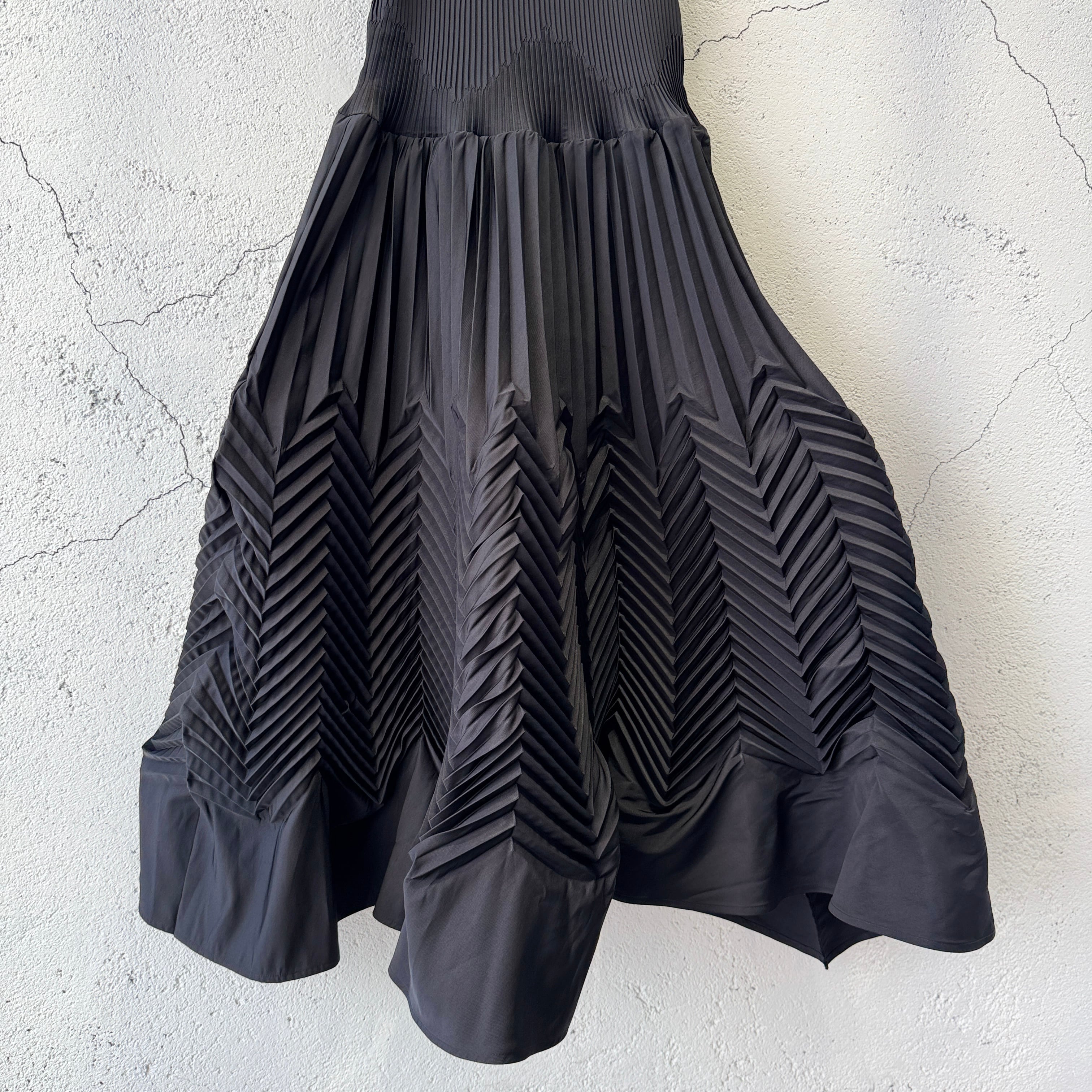 身頃には細かいプリーツの倒し方向を変えることで波柄を表現し、スカートにはジグザグのプリーツで動きを出しています