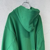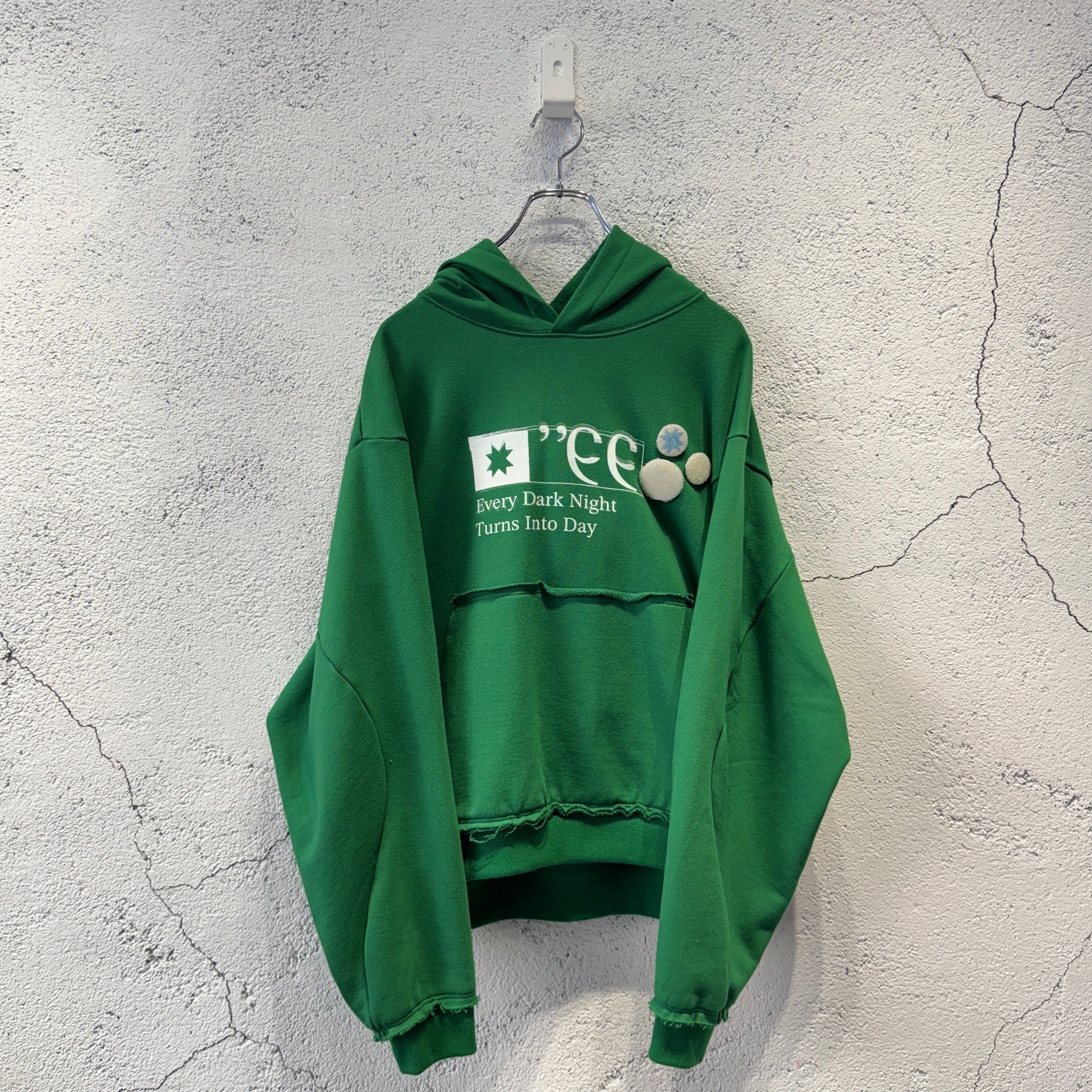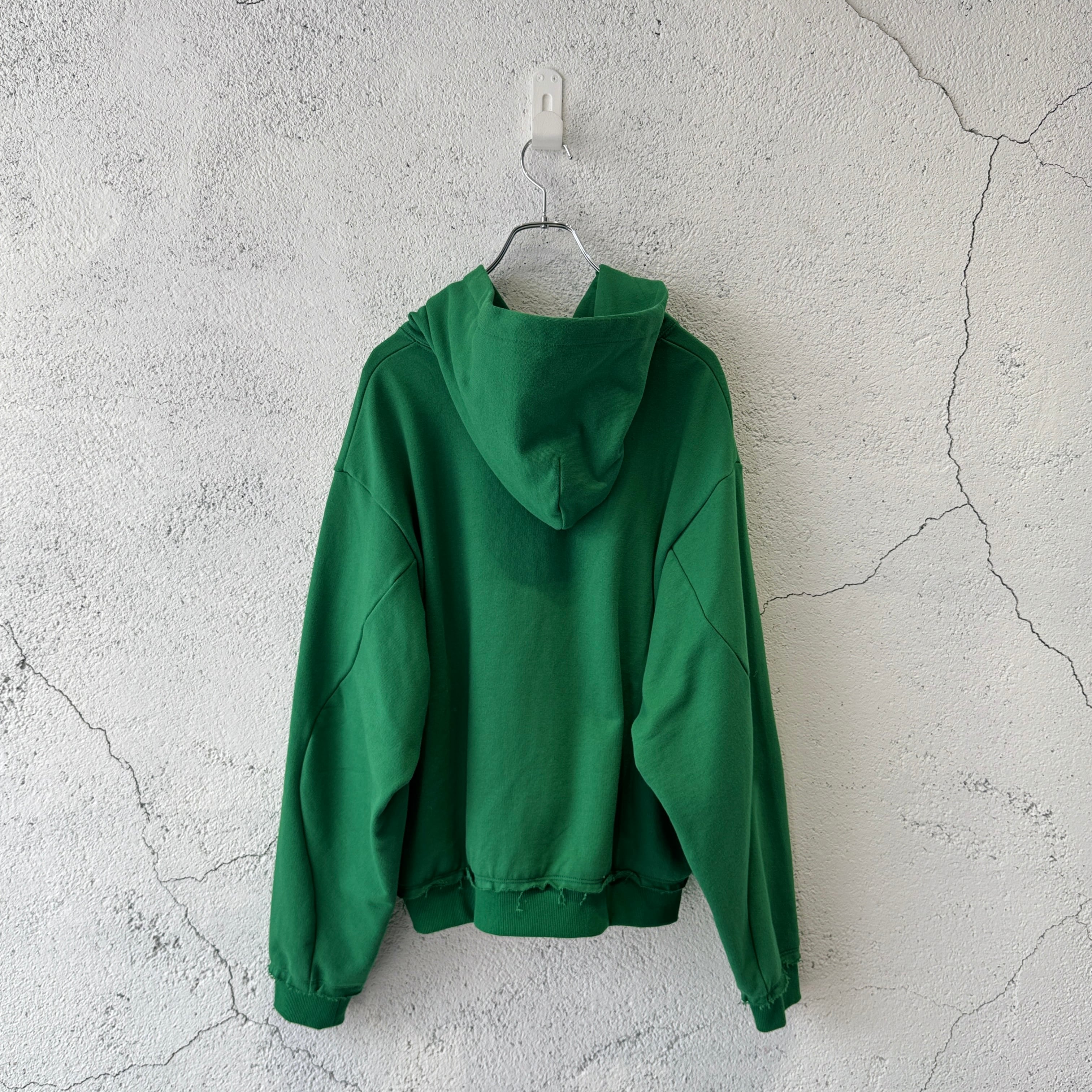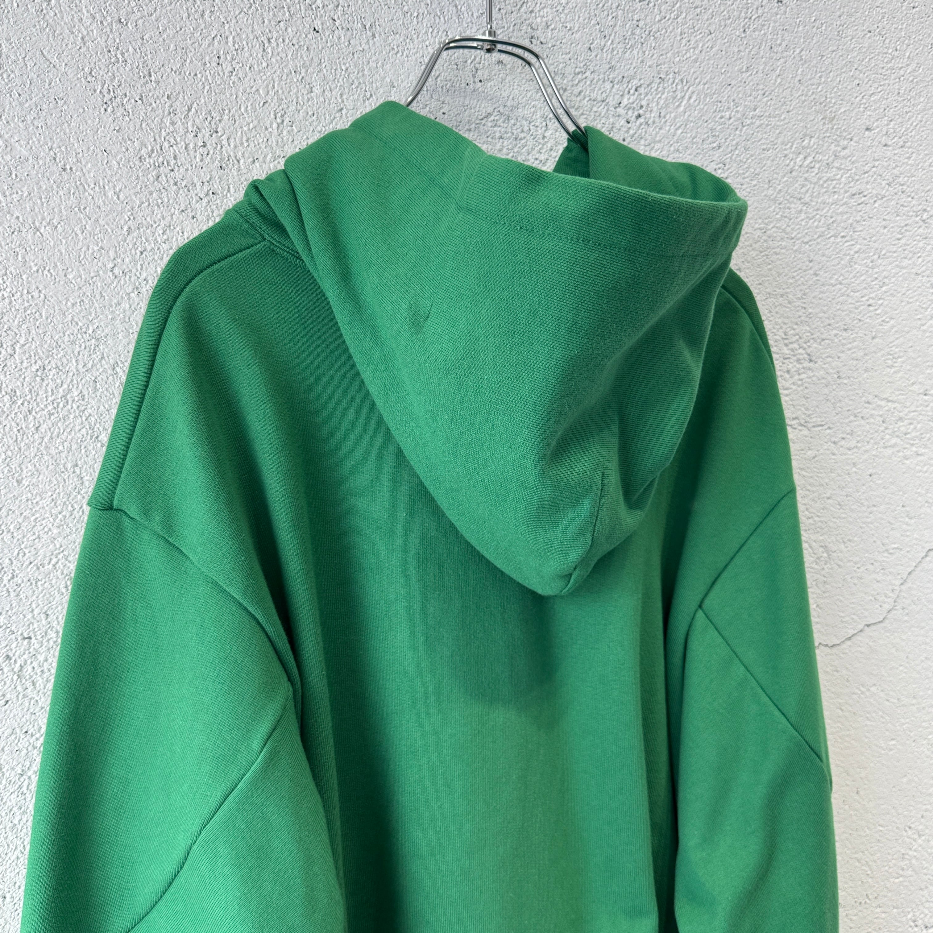 肘の辺りの歪みのある波状の切り替え線が特徴的なスウェットフーディー