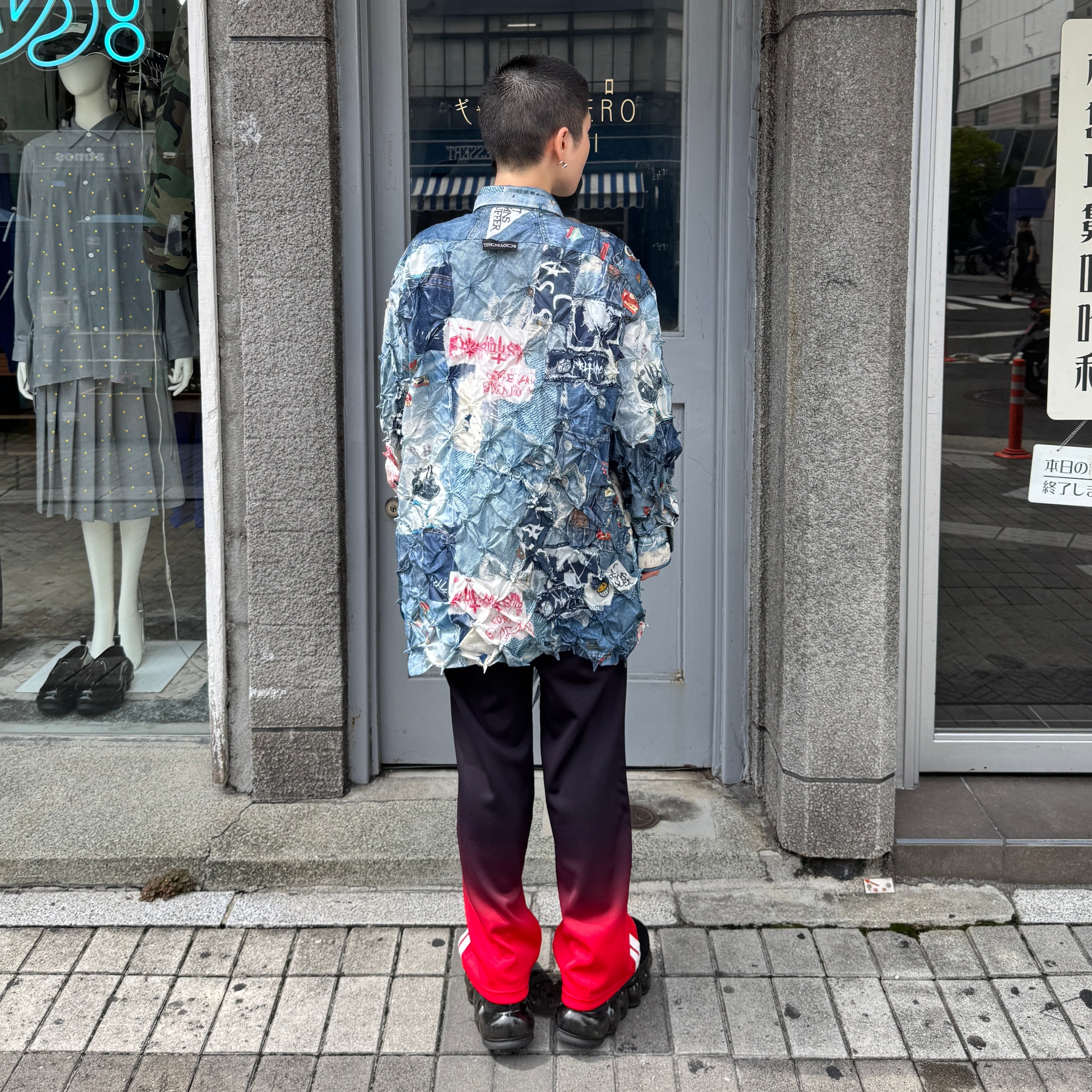 ヴィンテージデニムやワッペン、ピンバッジなどをコラージュしたプリント生地を使用したシャツ