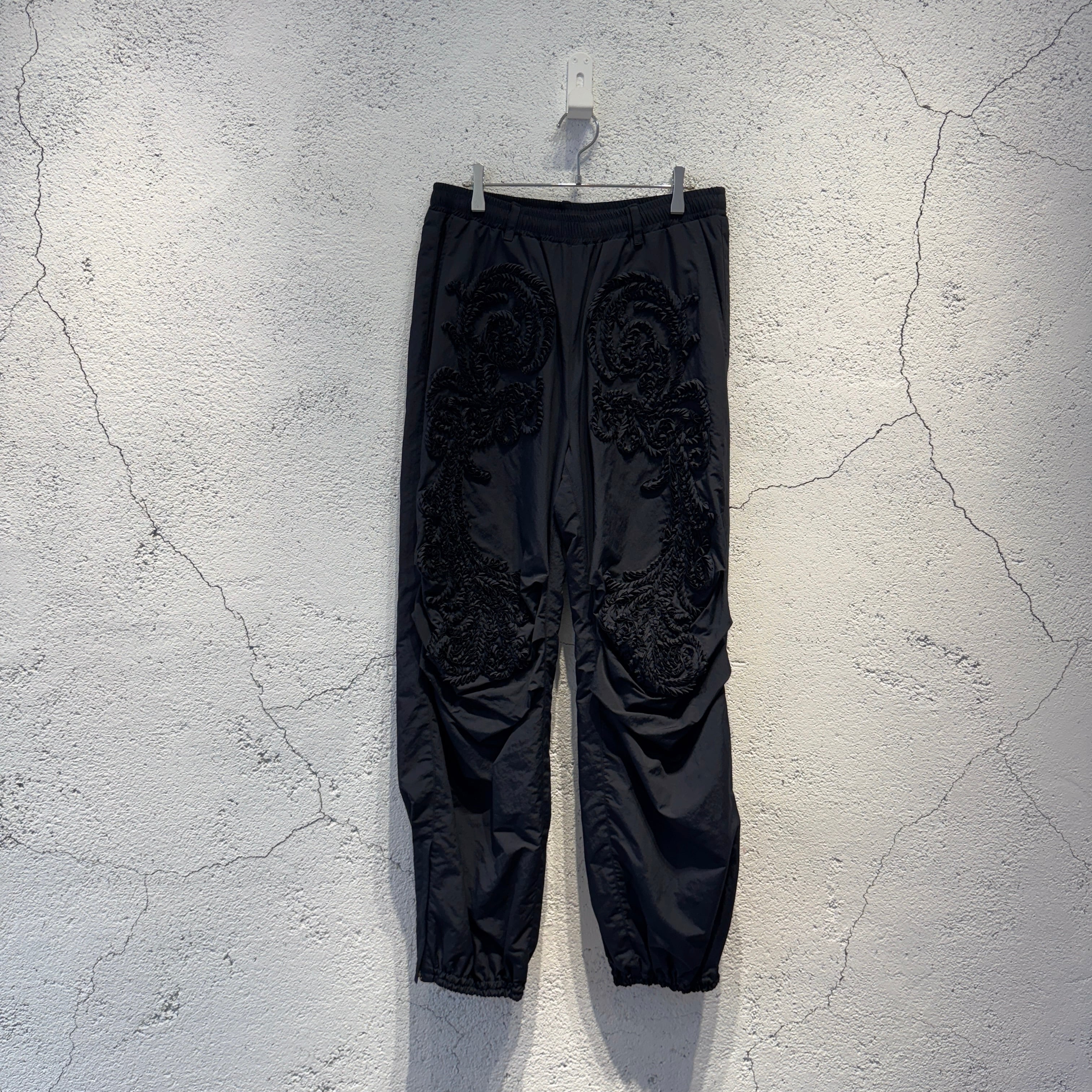 その彫刻刺繍の装飾性とナイロンの機能性を掛け合わせたデザインパンツ。