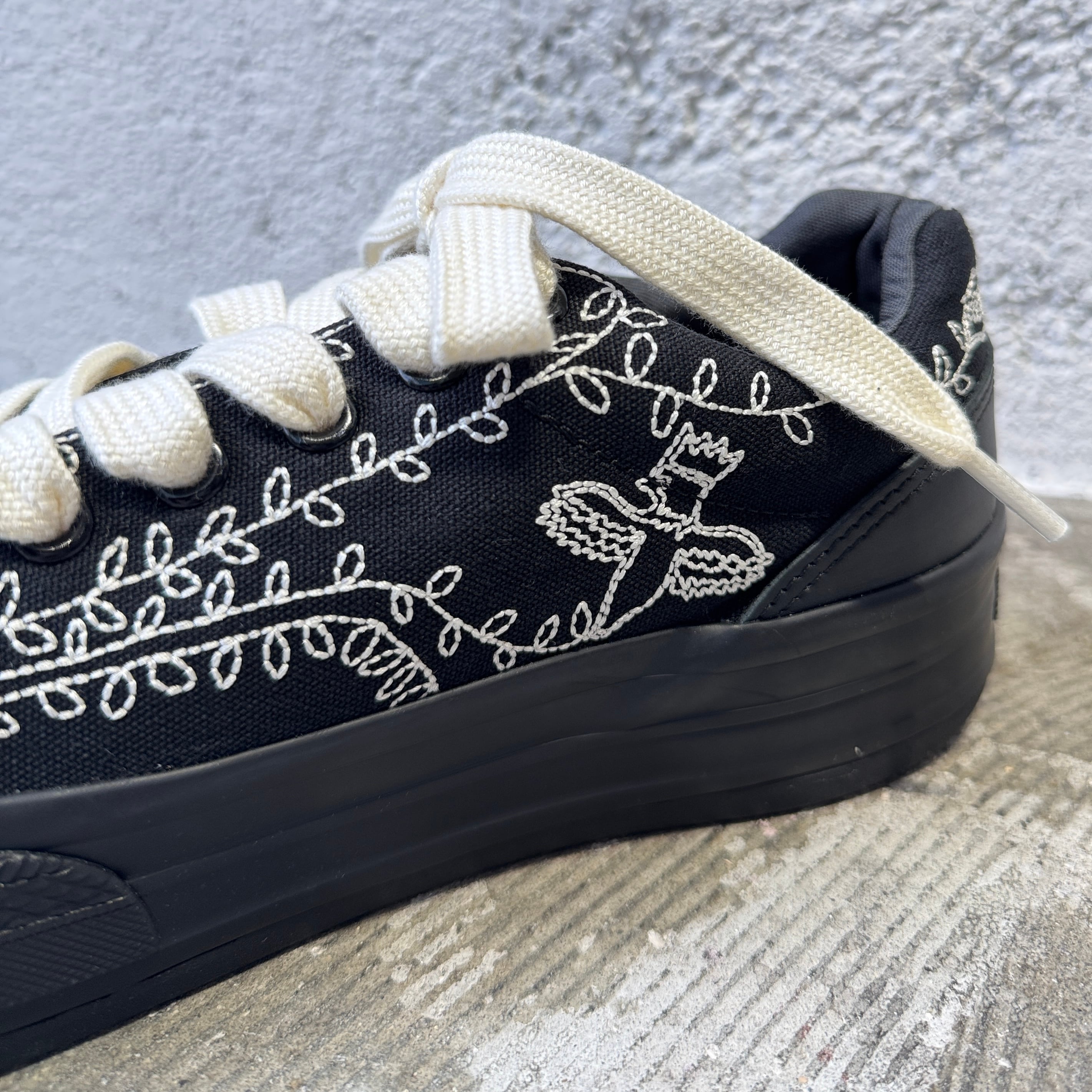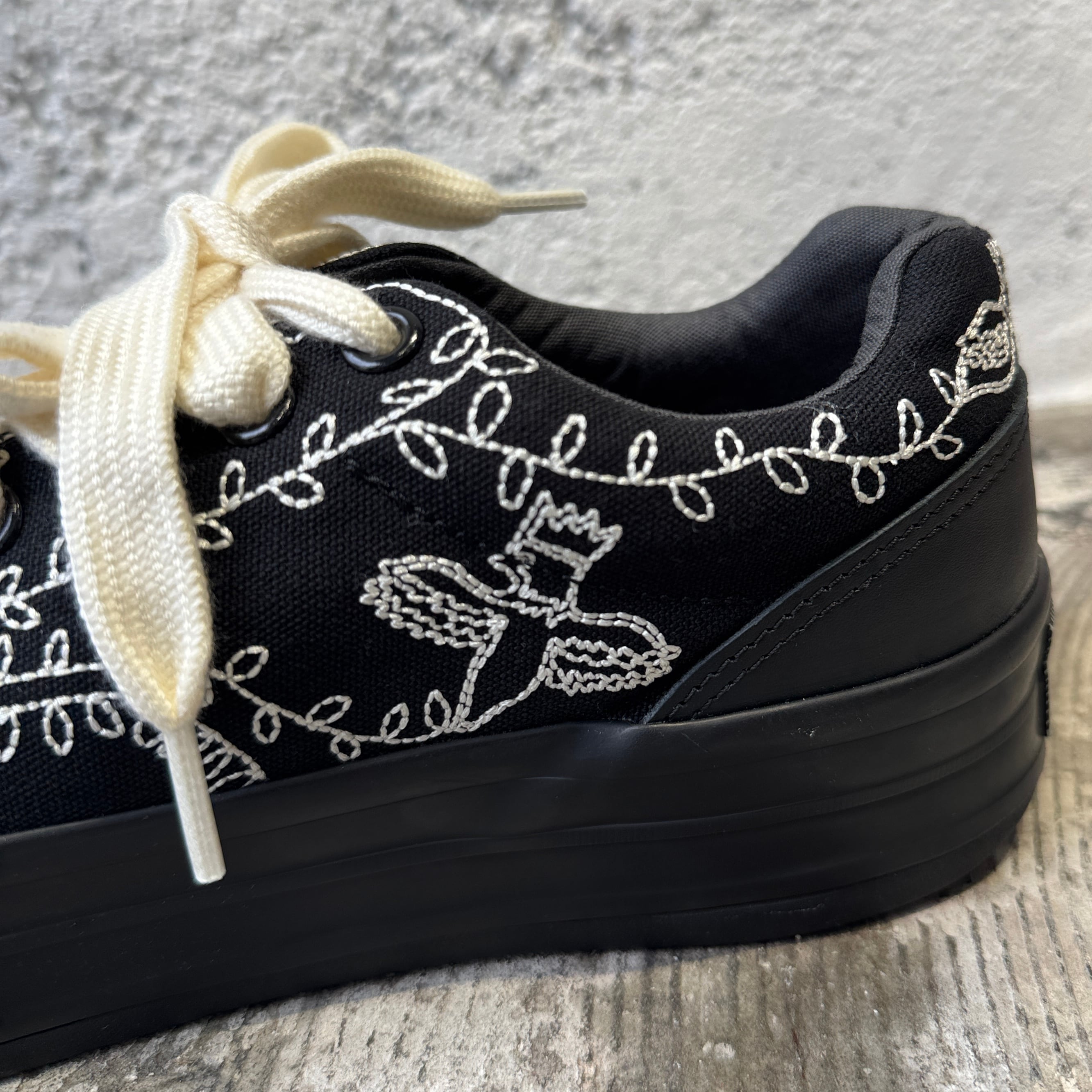 クラシックなアーカイブモデルの要素を参照しながら再解釈し、柔らかなシルエットと叙情的な刺繍を融合させることで、SHINYAKOZUKAらしい「絵に描いたようなアンティークスニーカー」が完成しました。