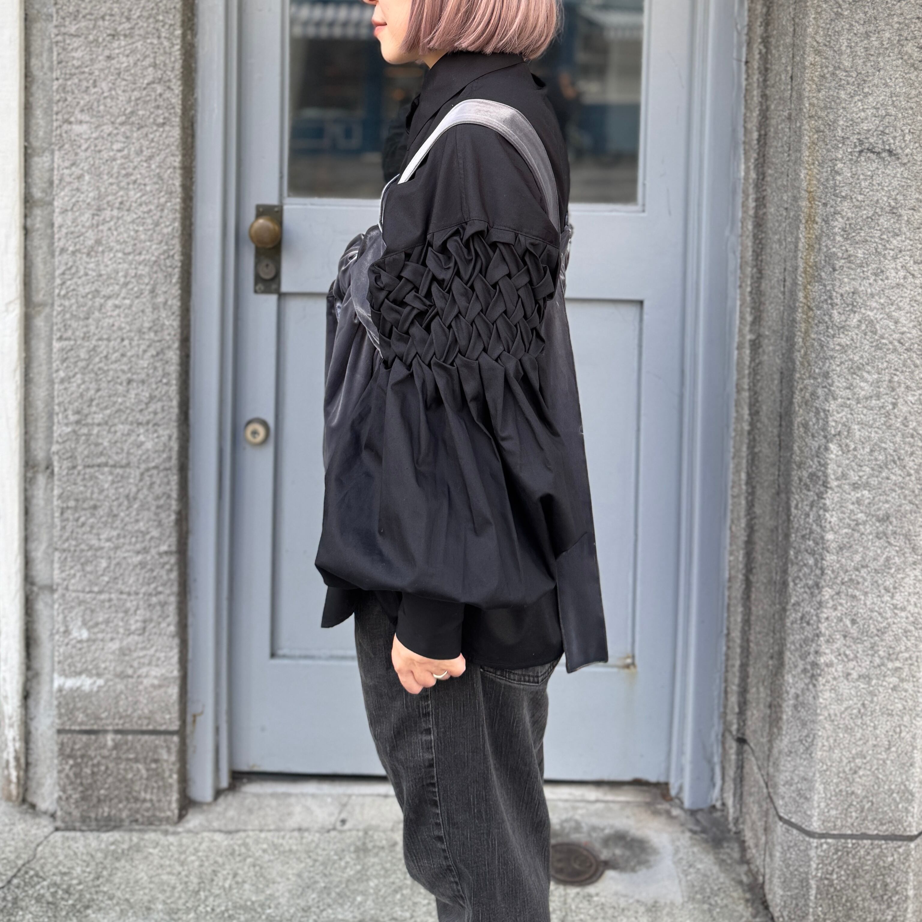 1枚の布に施されたスモッキング刺繍は、まるで広大なキャンバスに描かれたアート作品のようで、ドラマティックな印象を与える。