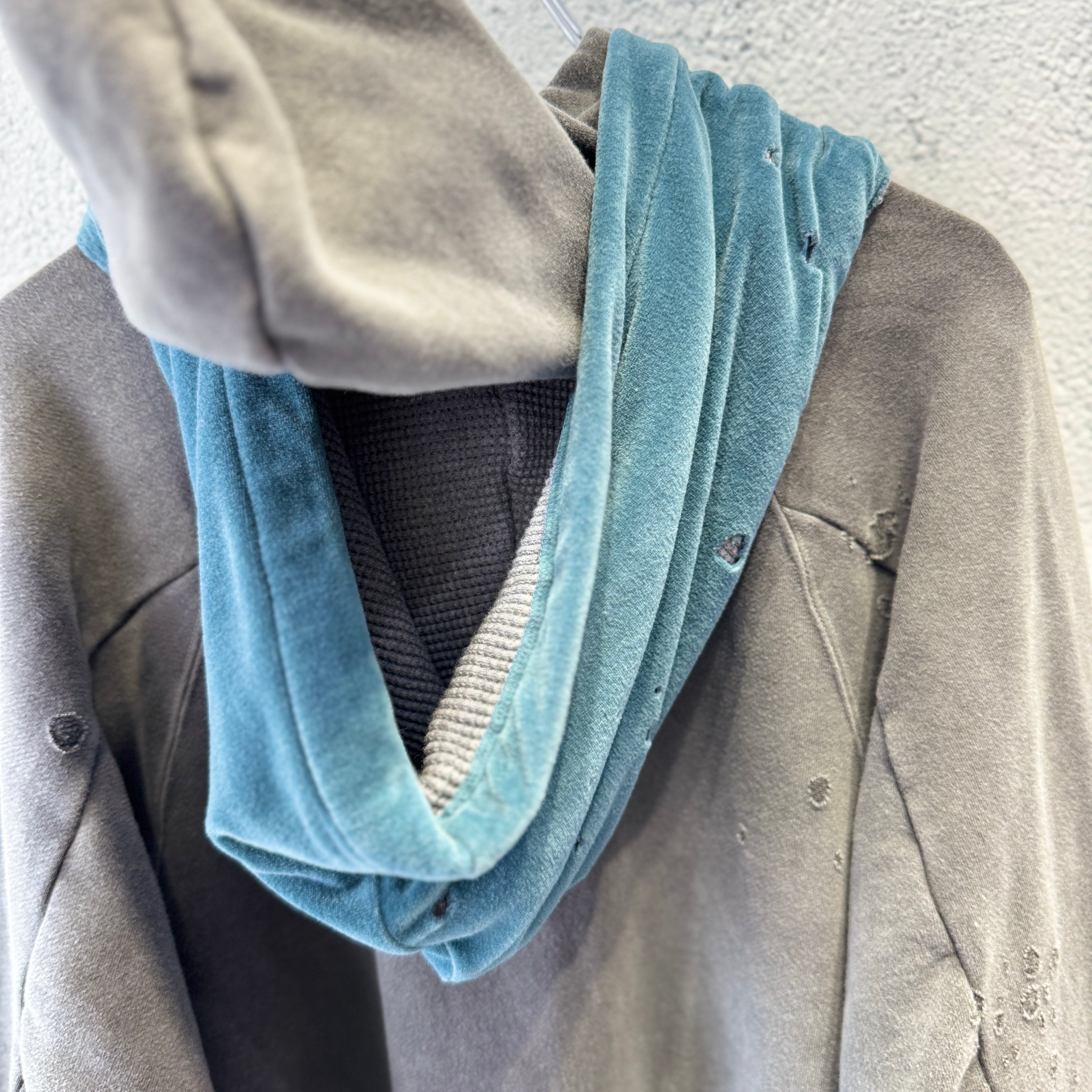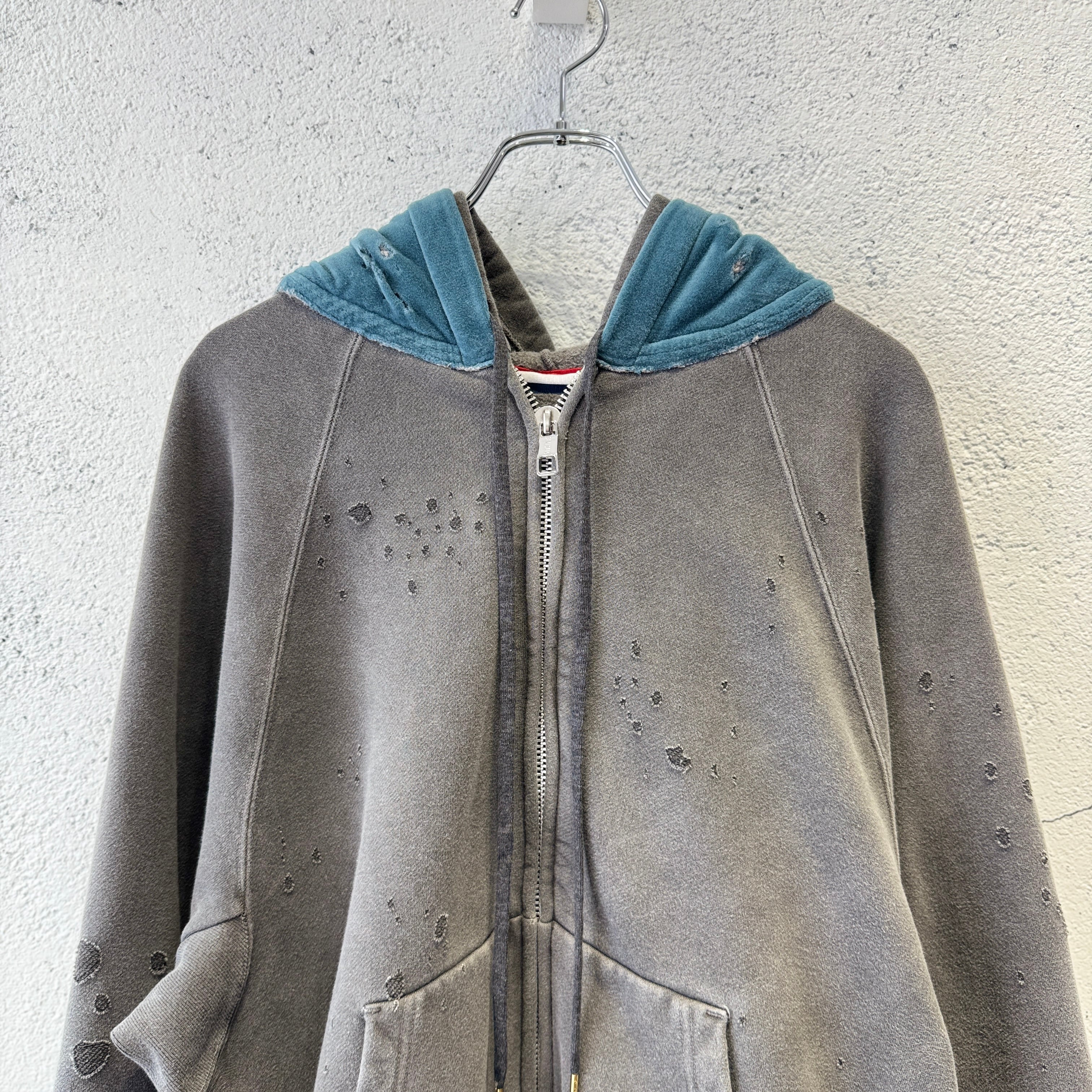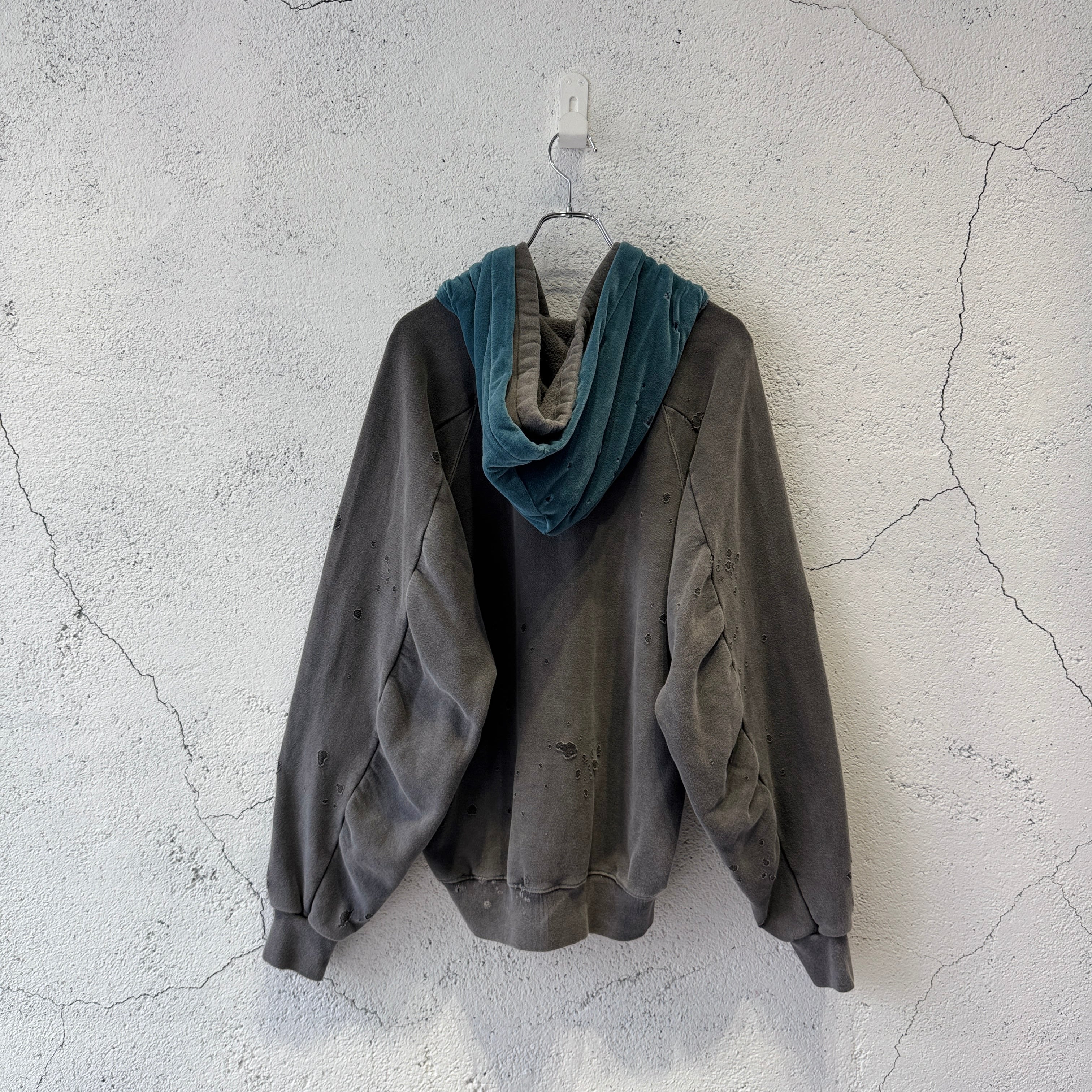 ベロアのフードが重ねられた、スウェットのジップアップフーディー