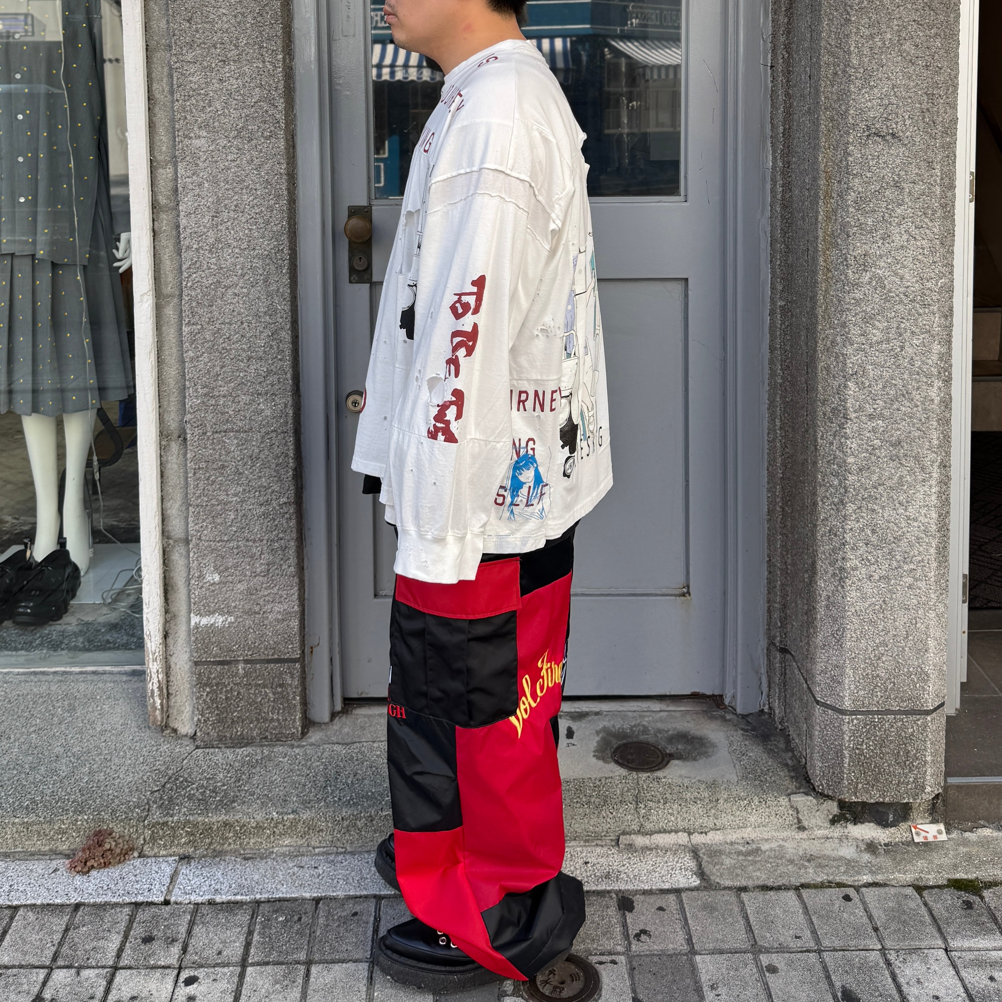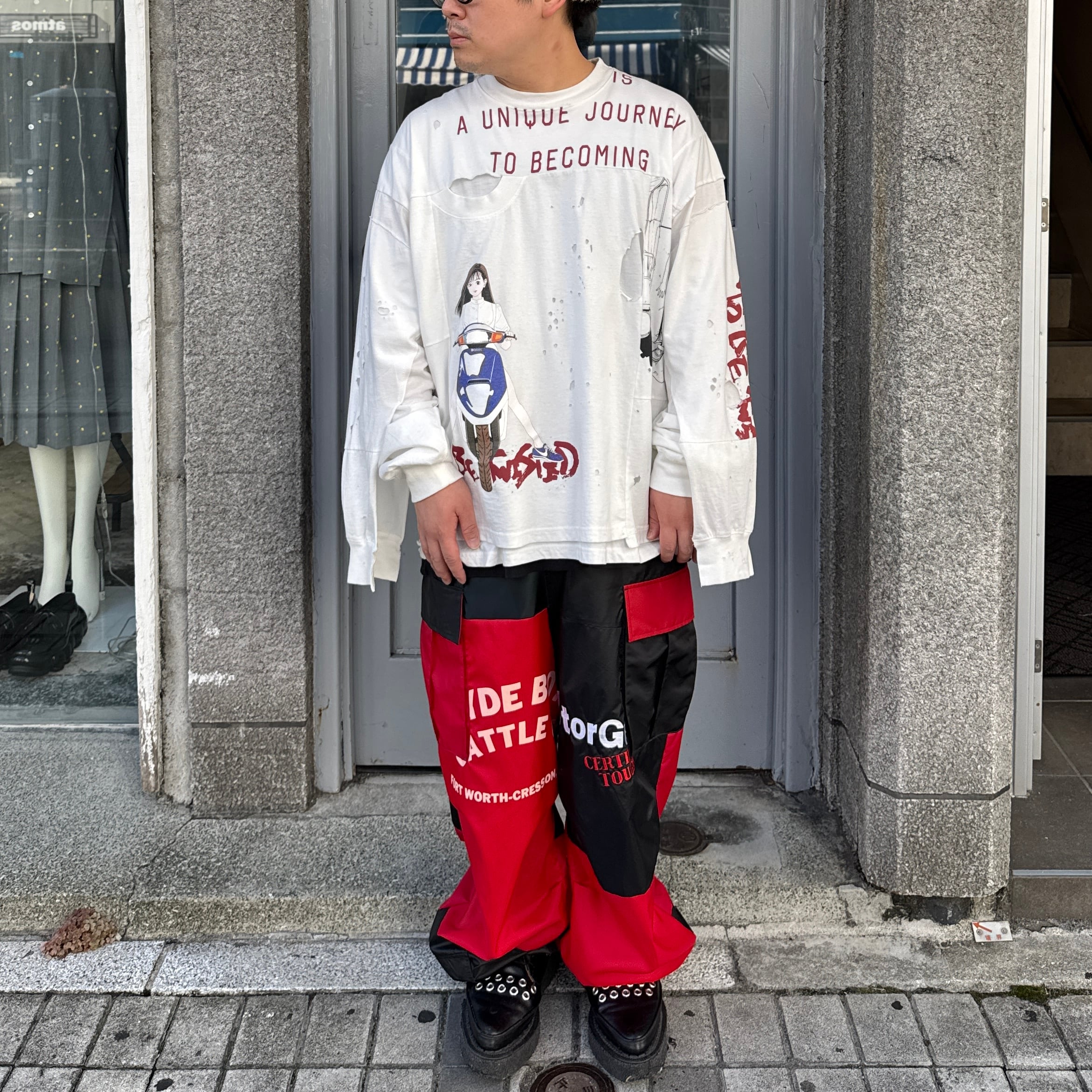 2枚のロンTを重ね、表側のTシャツはパッチワークとダメージ加工を施したデザインとなっており、インパクト抜群です