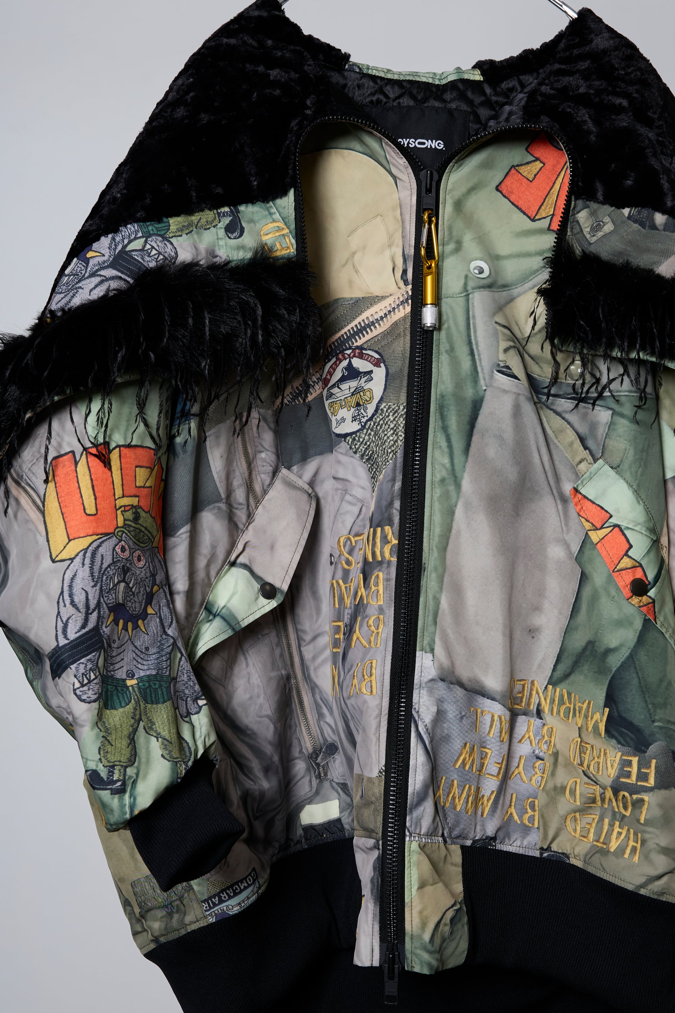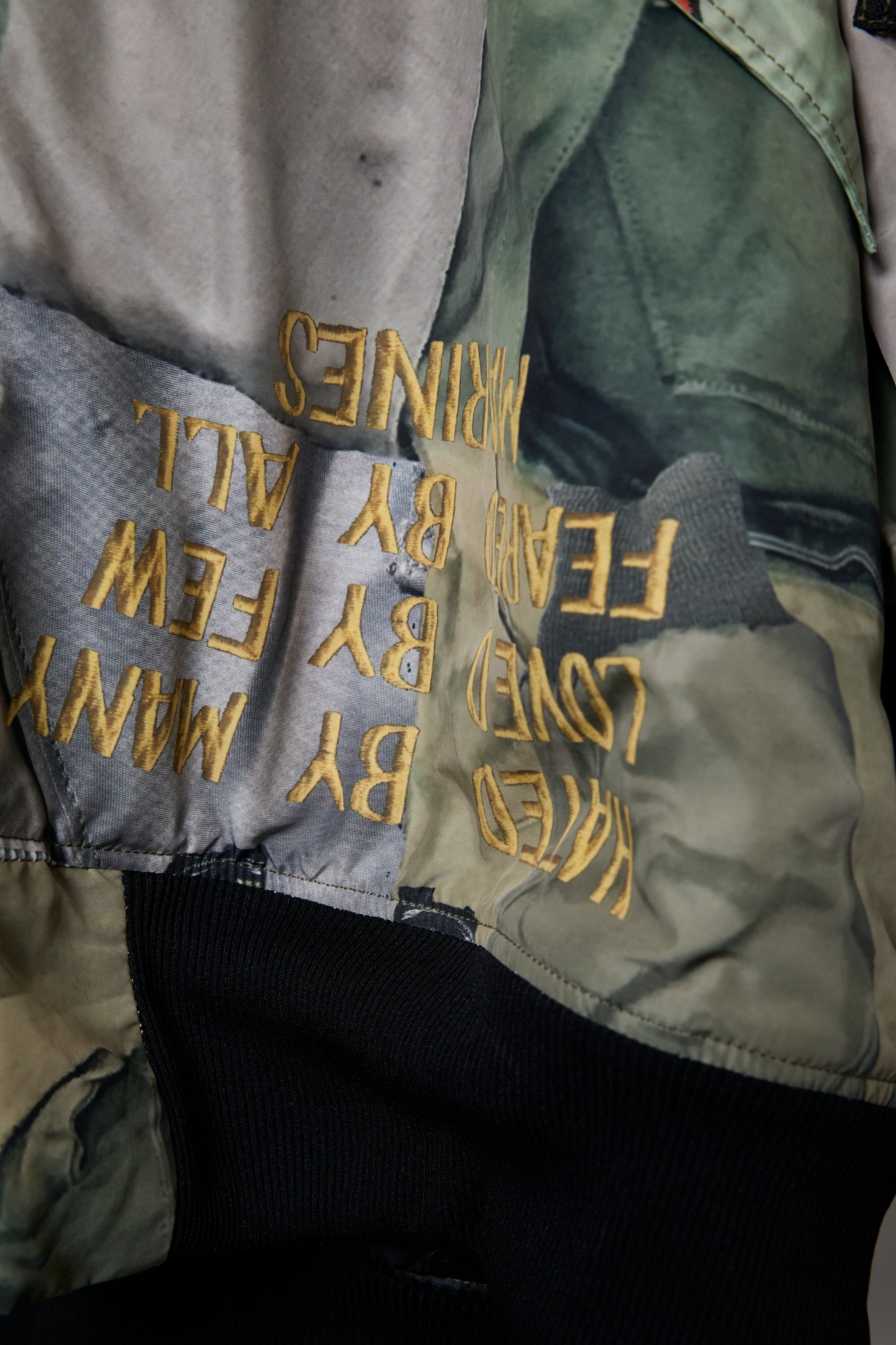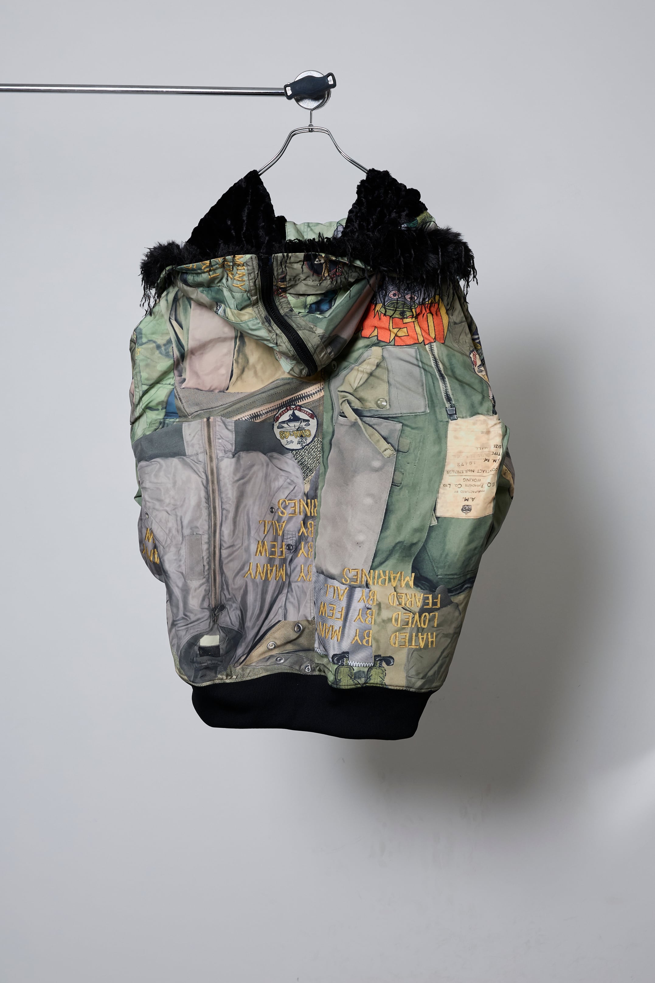 ヴィンテージミリタリーウェア、ワッペン、ピンバッジなどをコラージュしたプリント生地を使用し、トロンプルイユ(だまし絵)のような遊び心のあるデザインに仕上げました