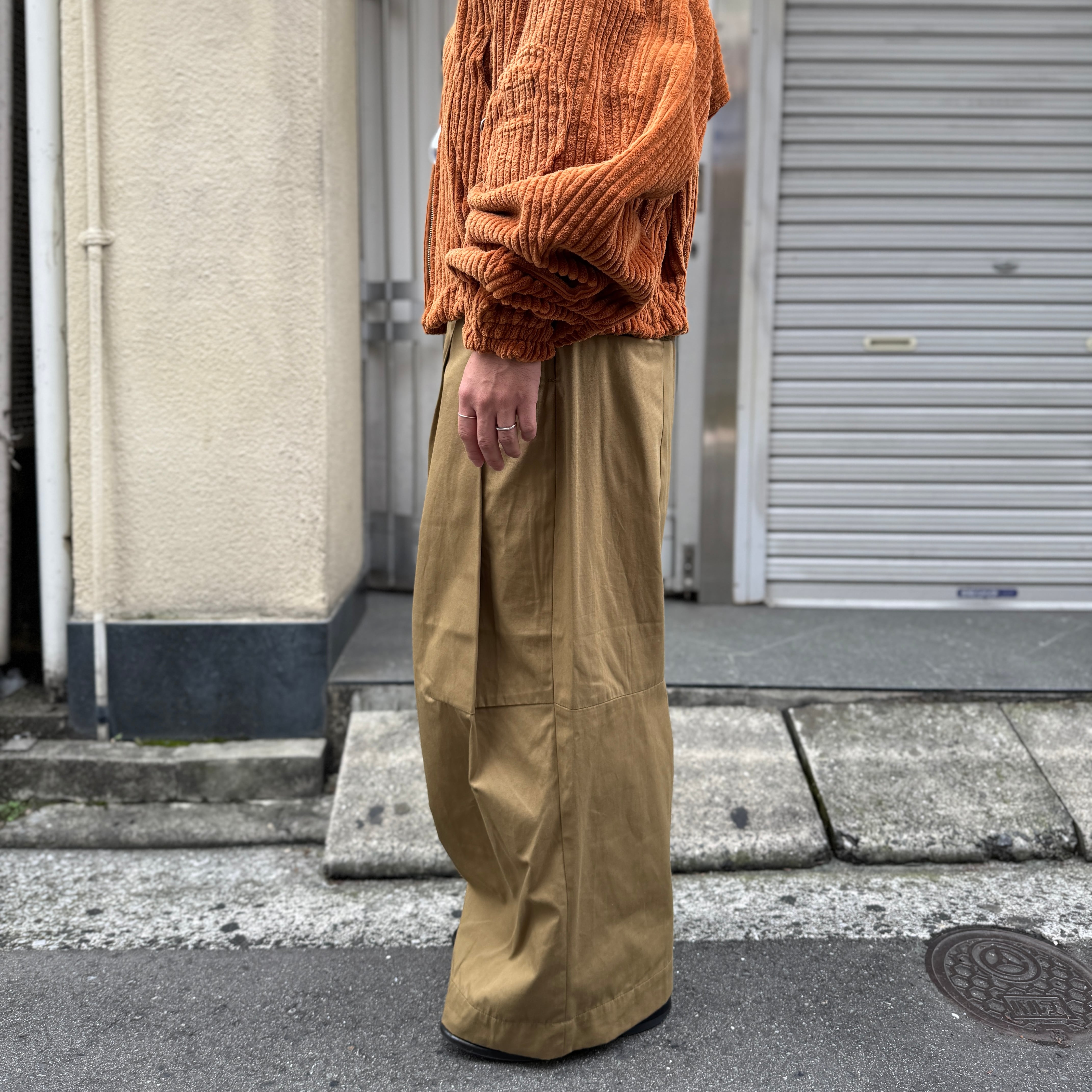 深めのタックと膝裏の切り替えで立体感のある美しいシルエットを表現しています