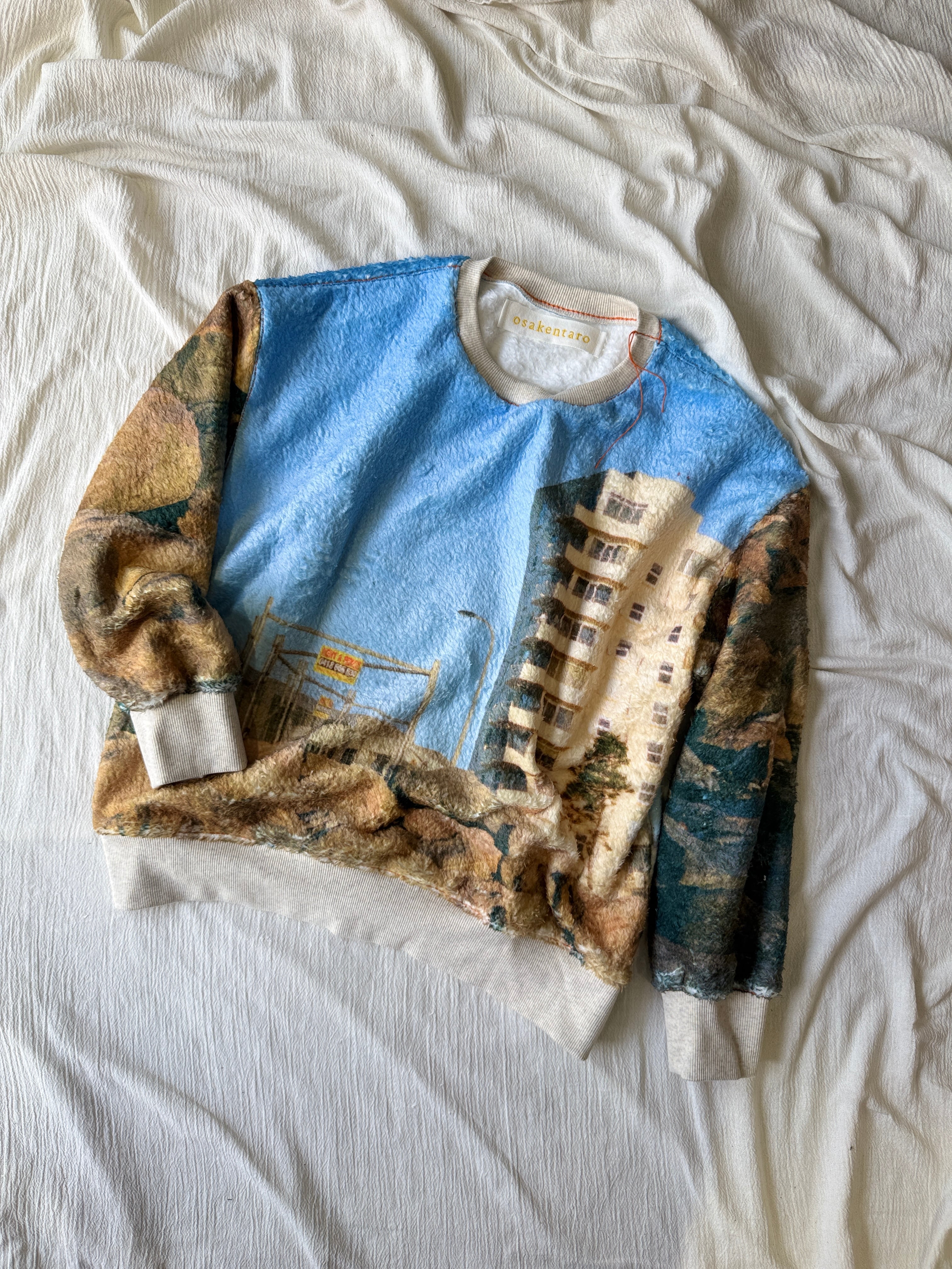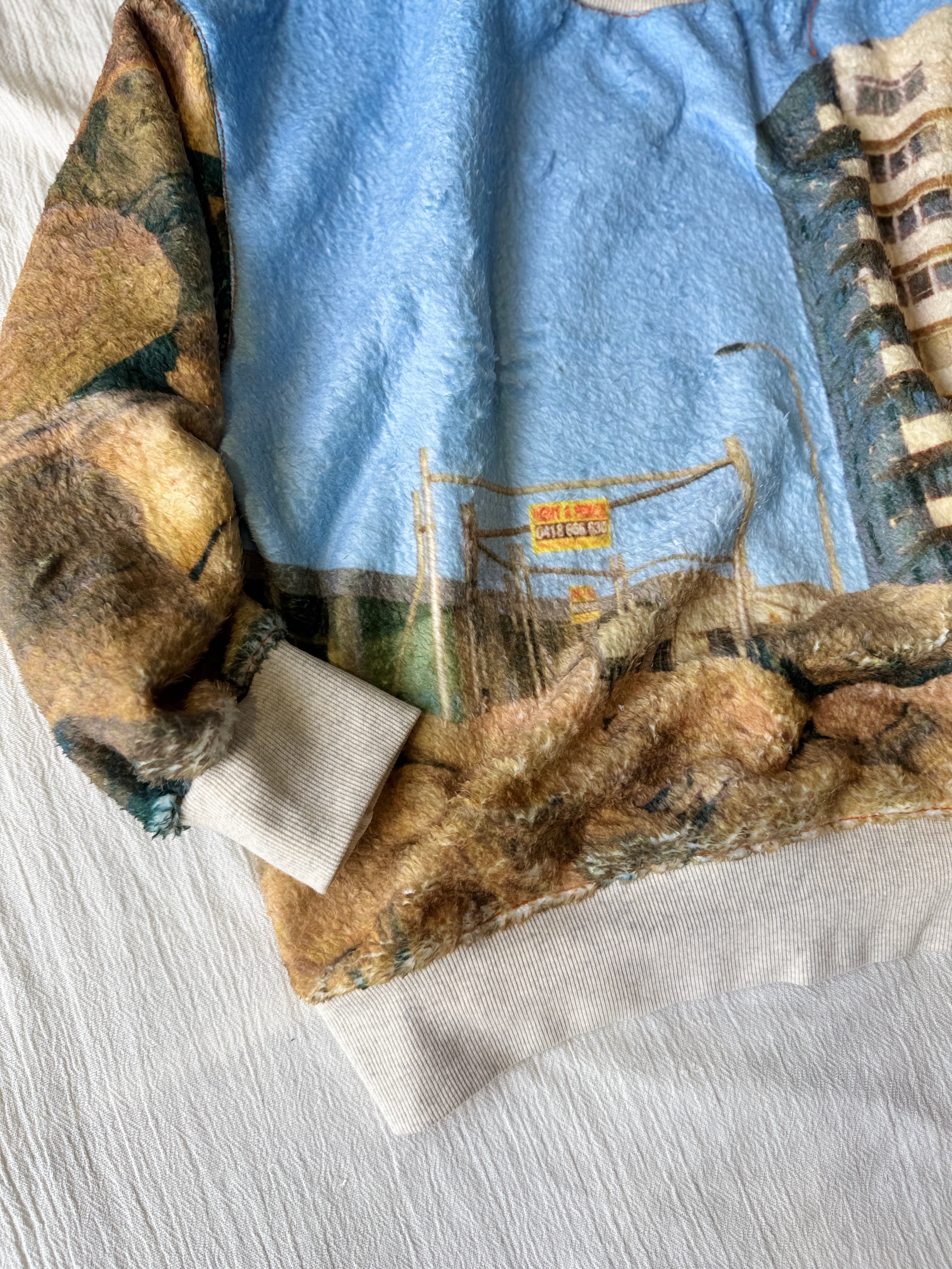 デザイナーがオーストラリアの旅で撮った風景の写真をボア素材にプリントしたプルオーバー