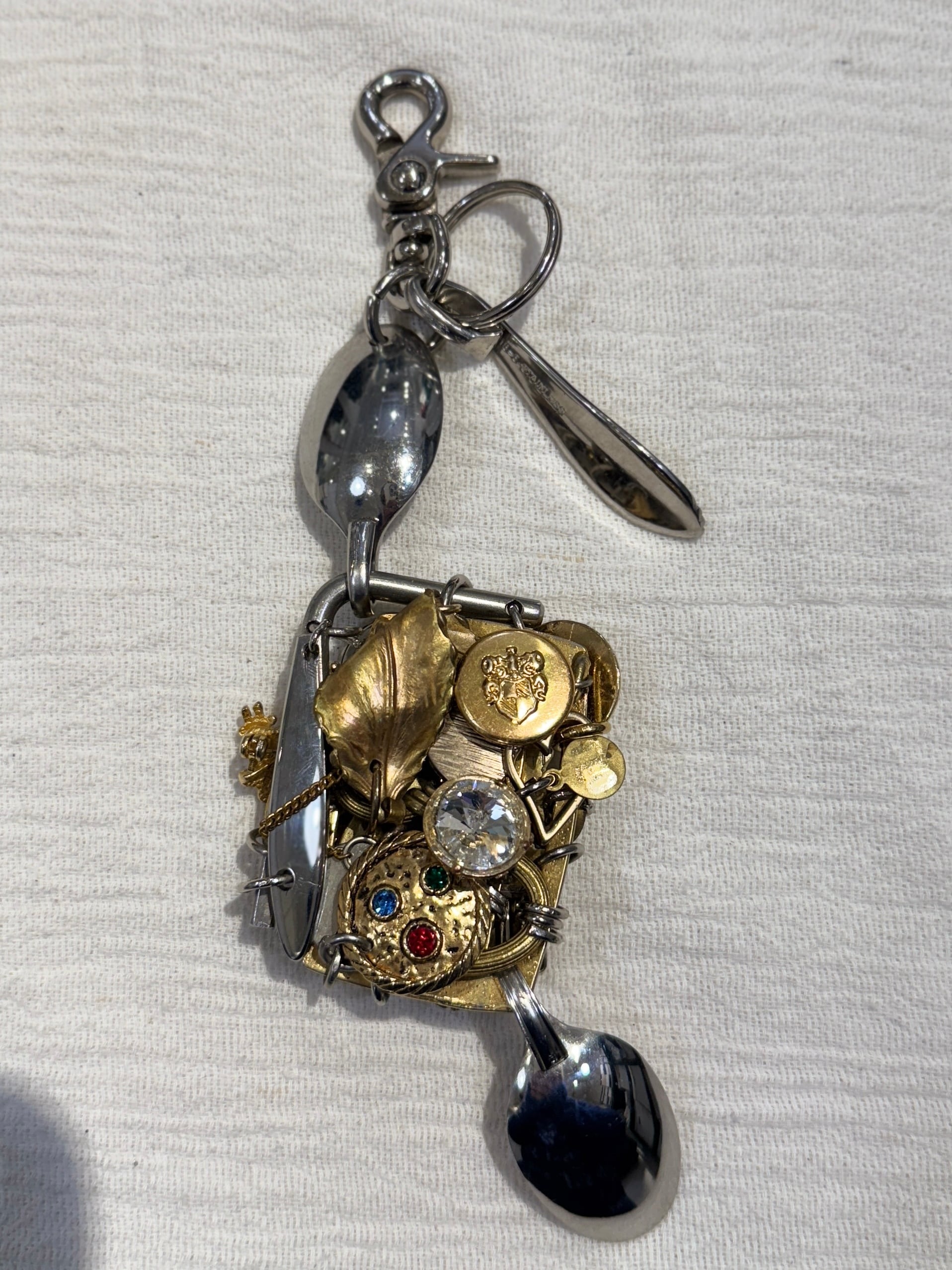 リサイクル品や廃材を組み合わせて製作したキーチェーン。