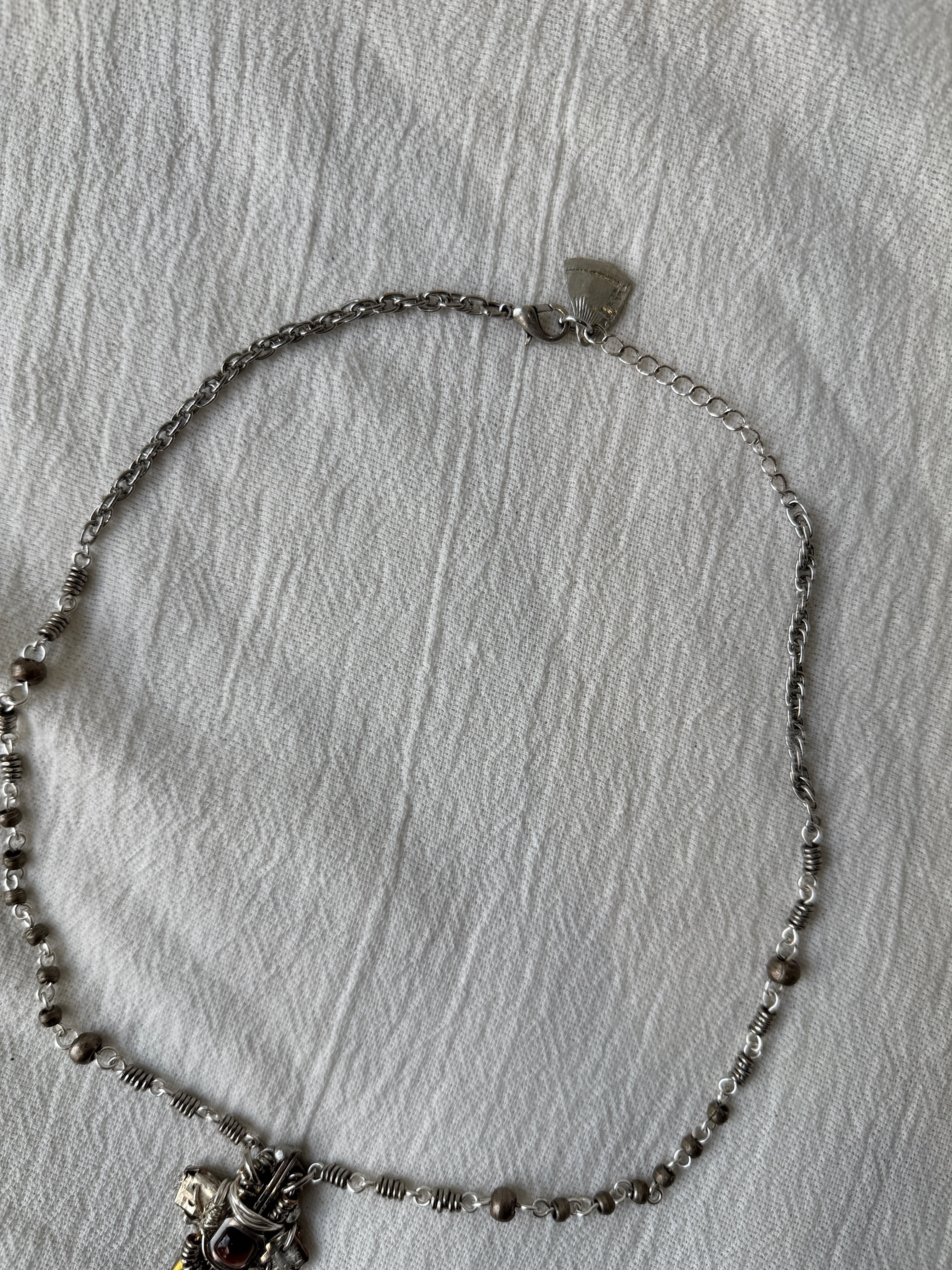 リサイクル品や廃材を組み合わせて製作したネックレス。