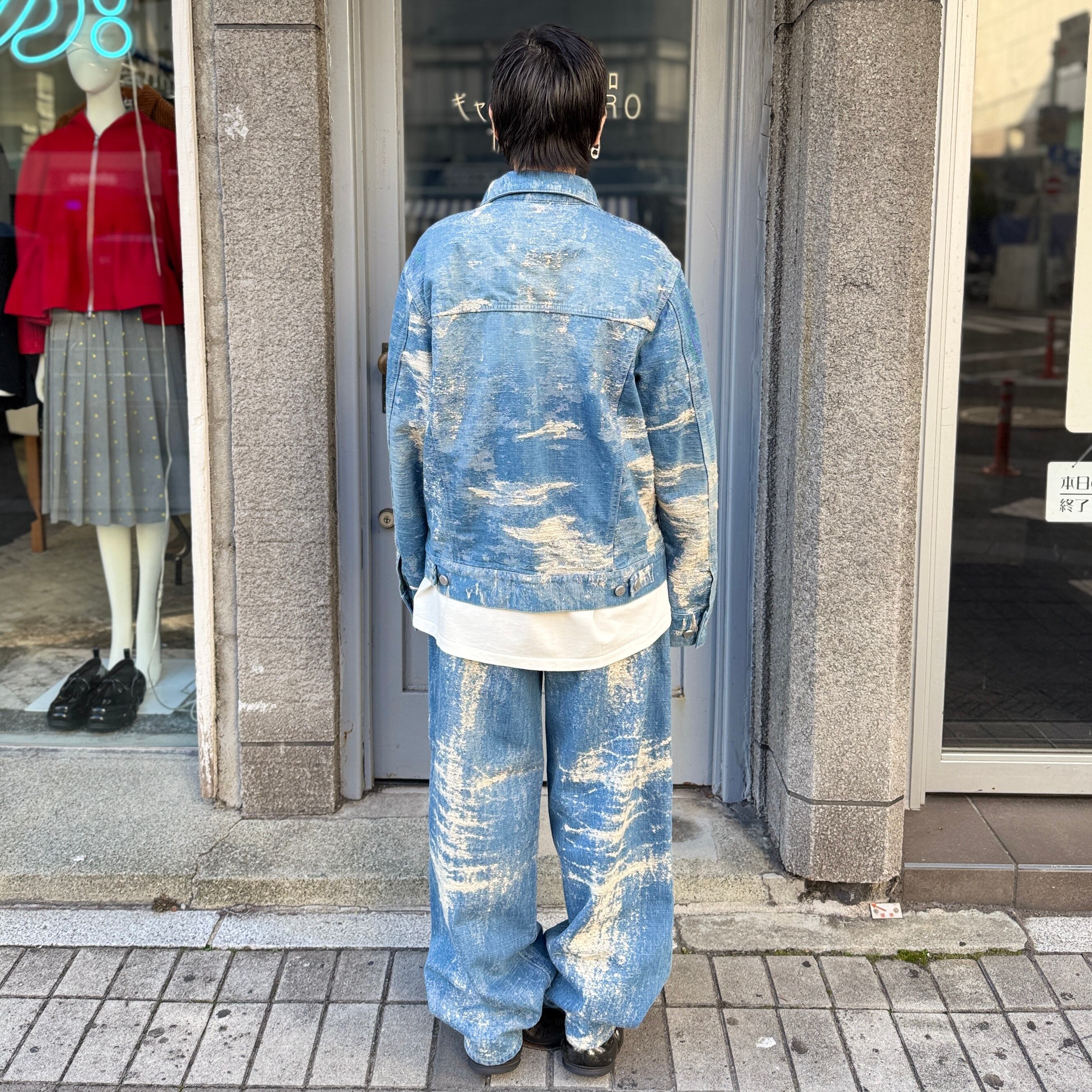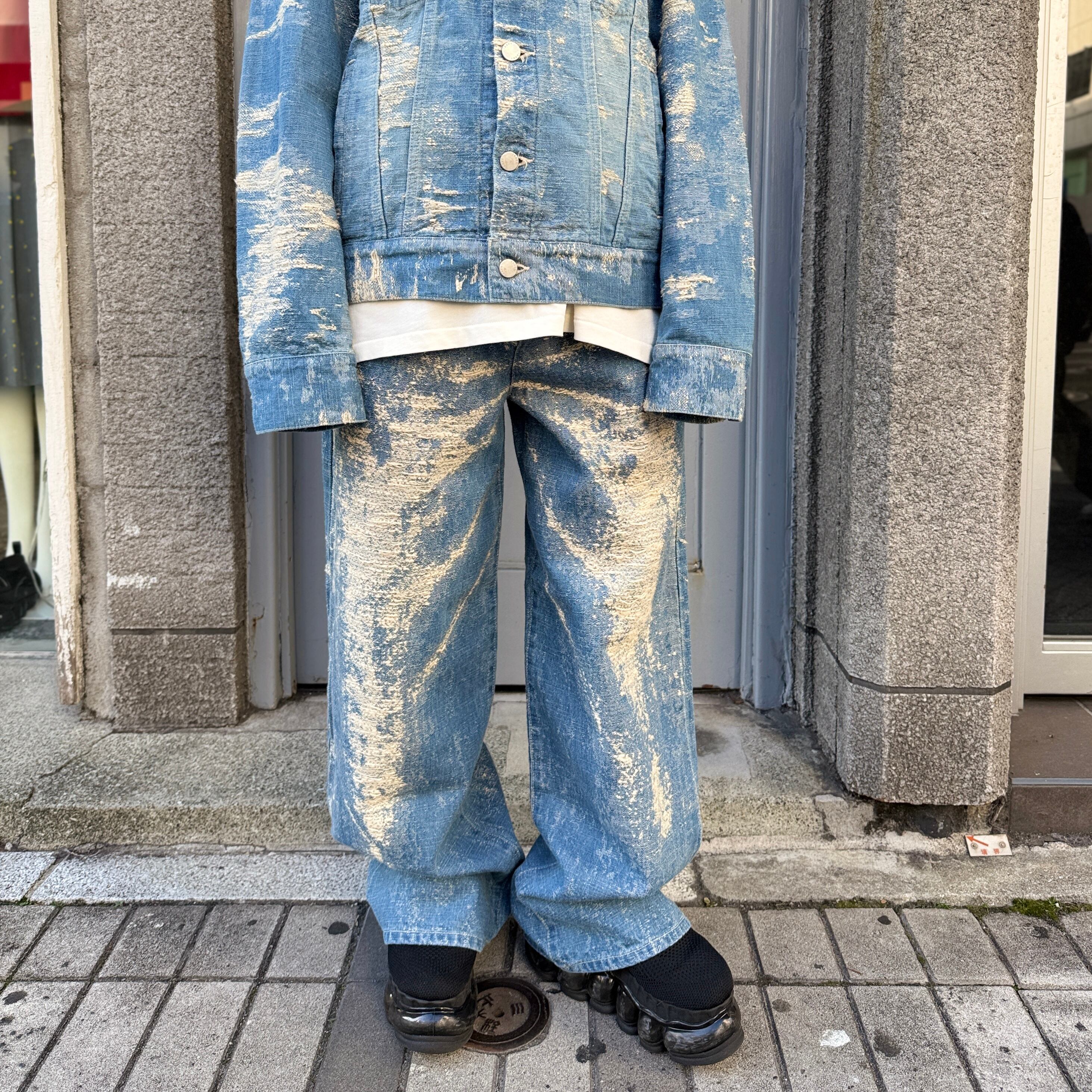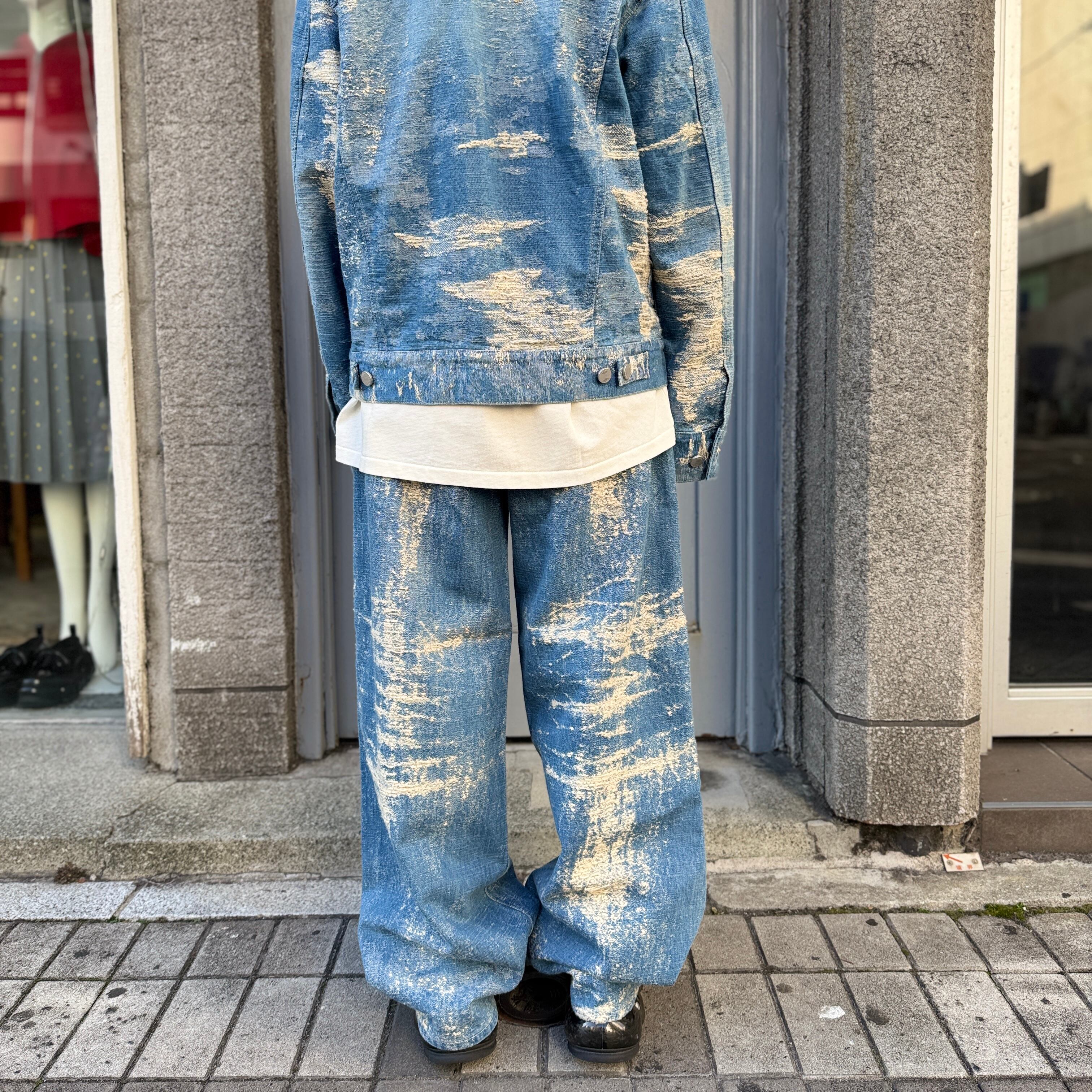 経年変化による色落ちやアタリを、プリントや加工ではなく、ジャカード織りで表現したワイドデニムパンツ
