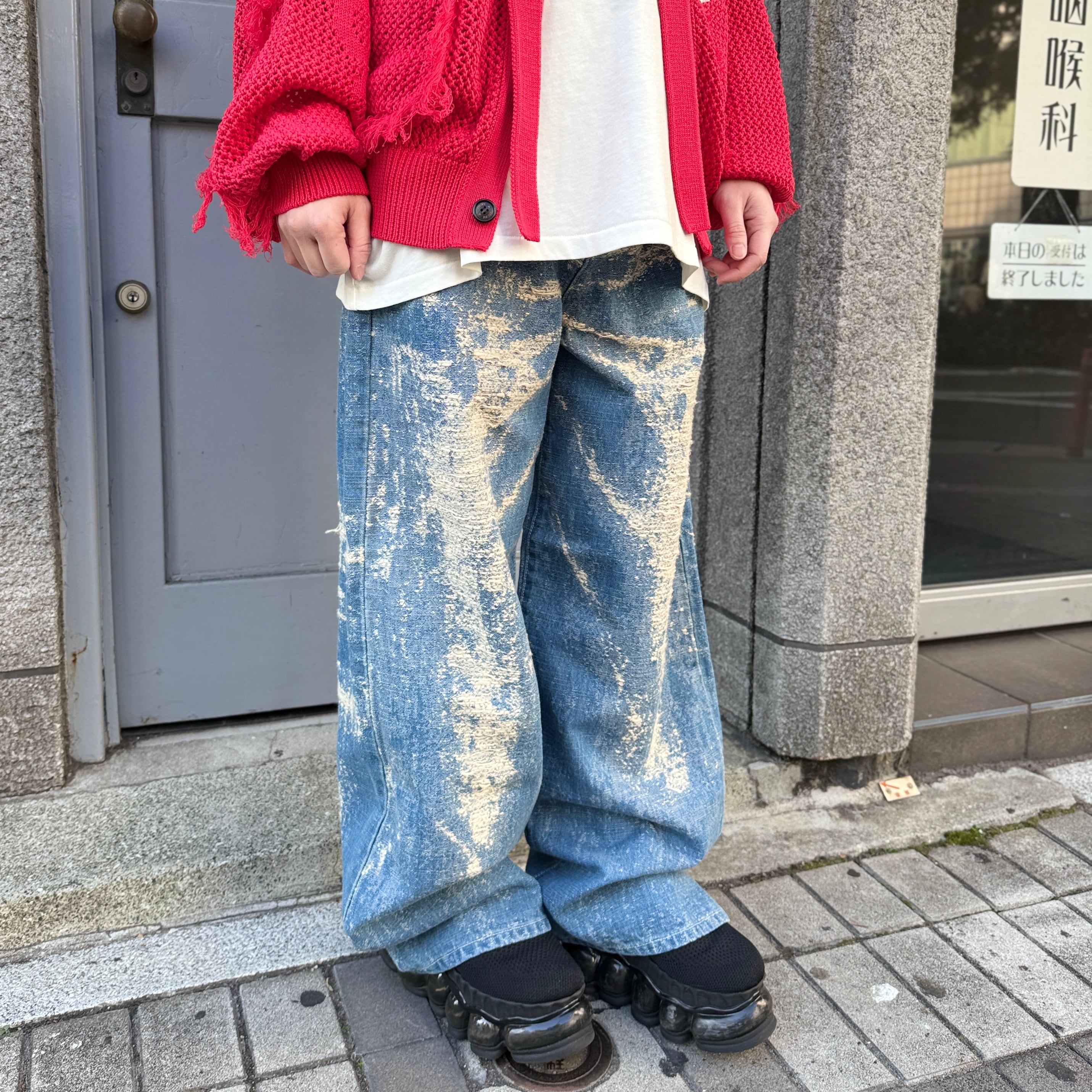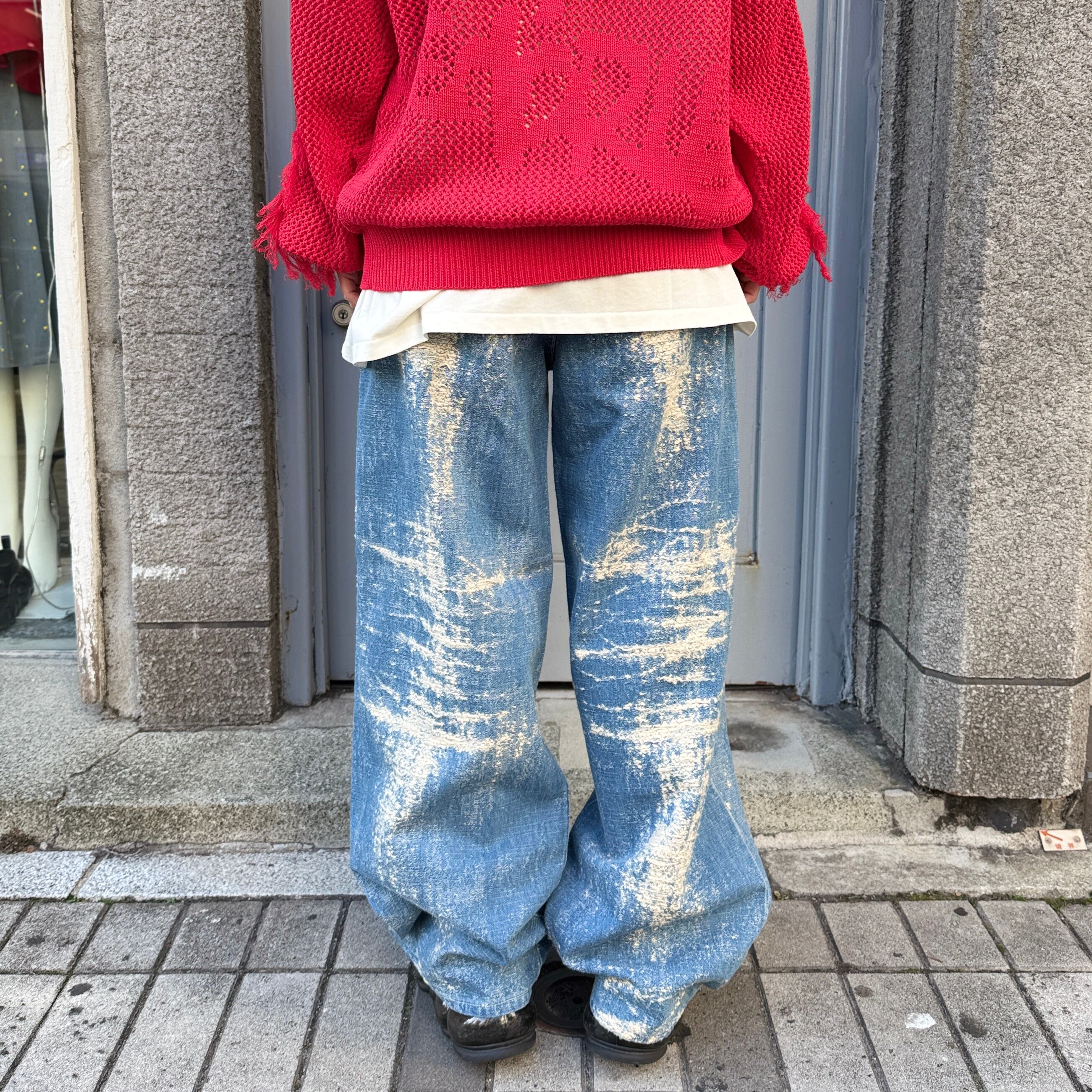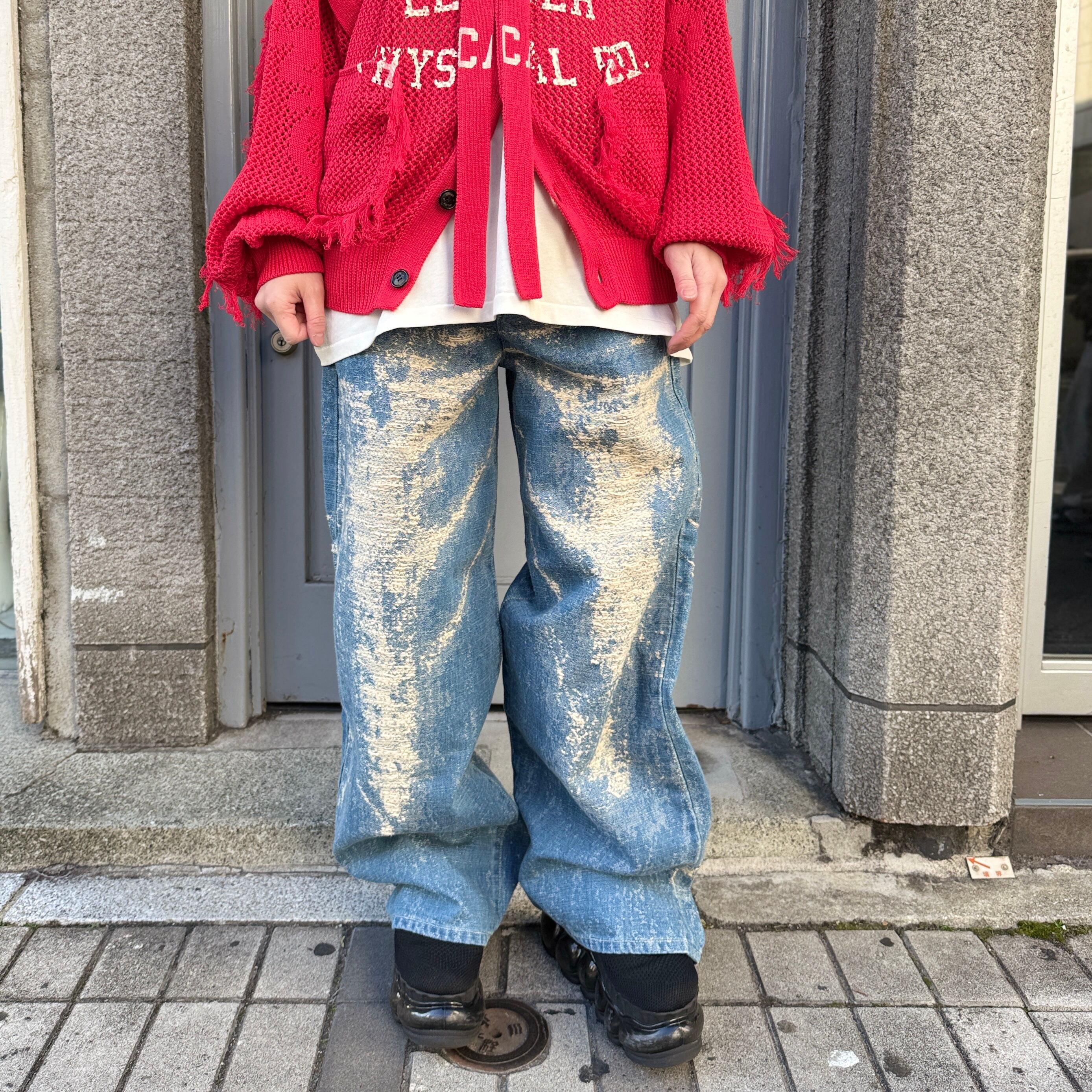 経年変化による色落ちやアタリを、プリントや加工ではなく、ジャカード織りで表現したワイドデニムパンツ