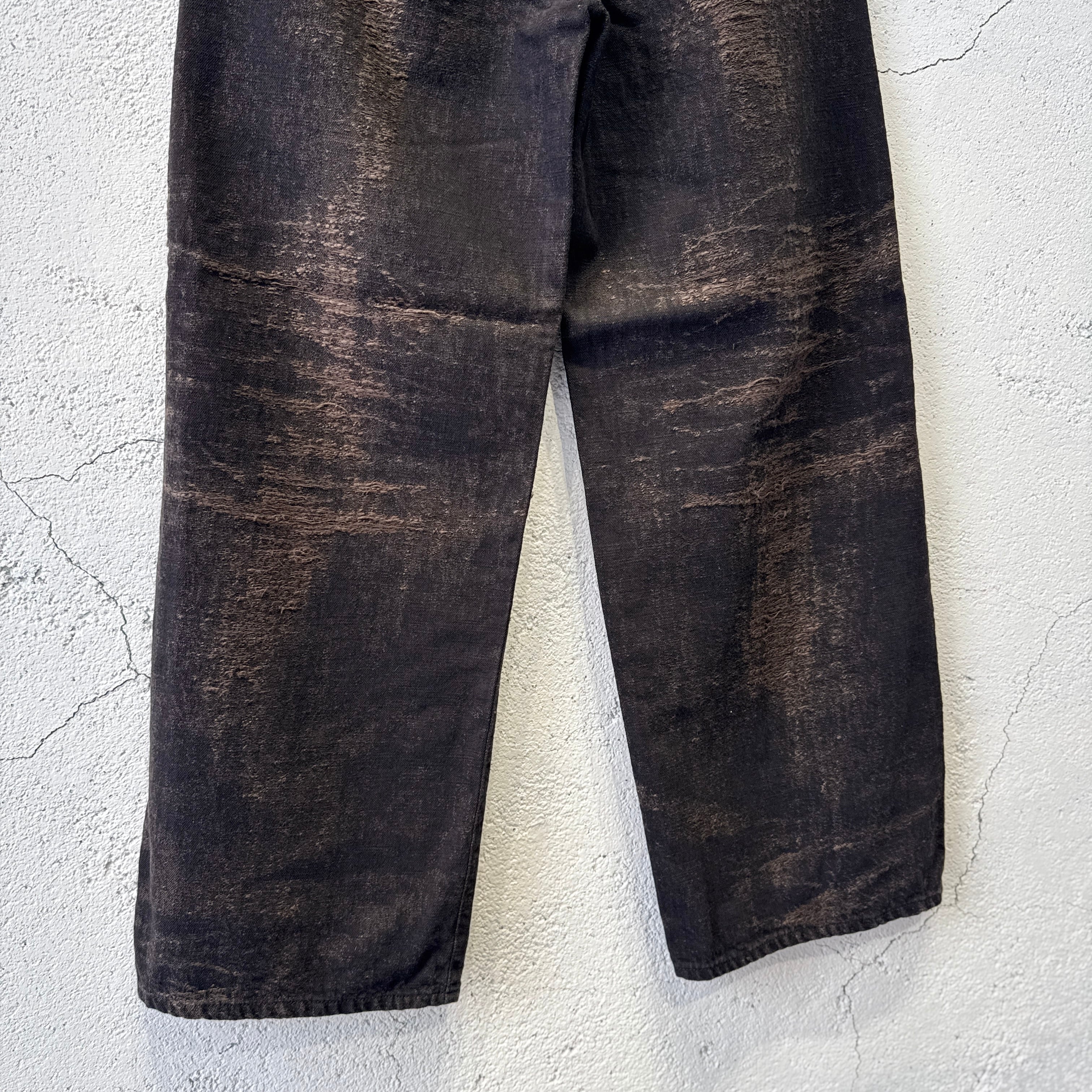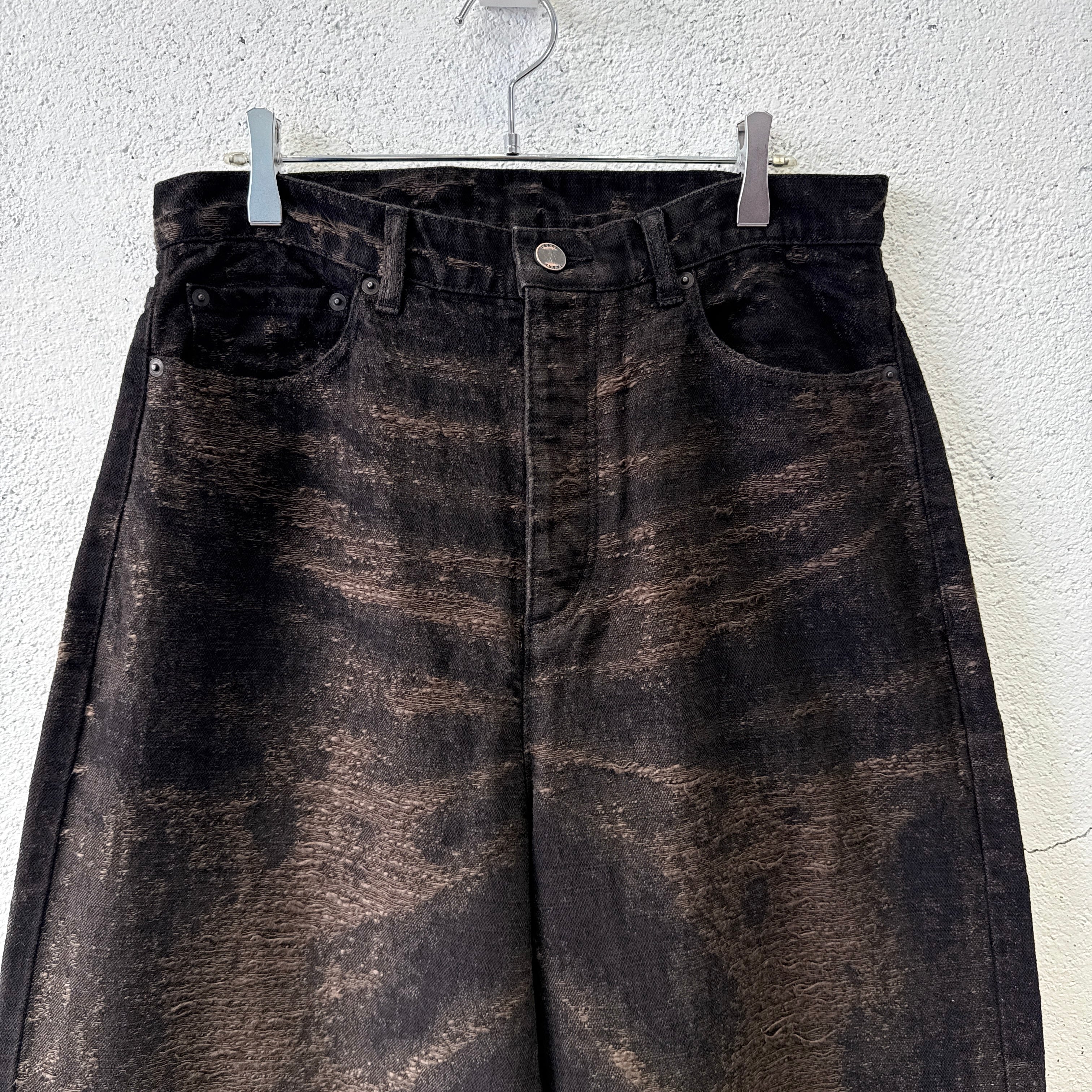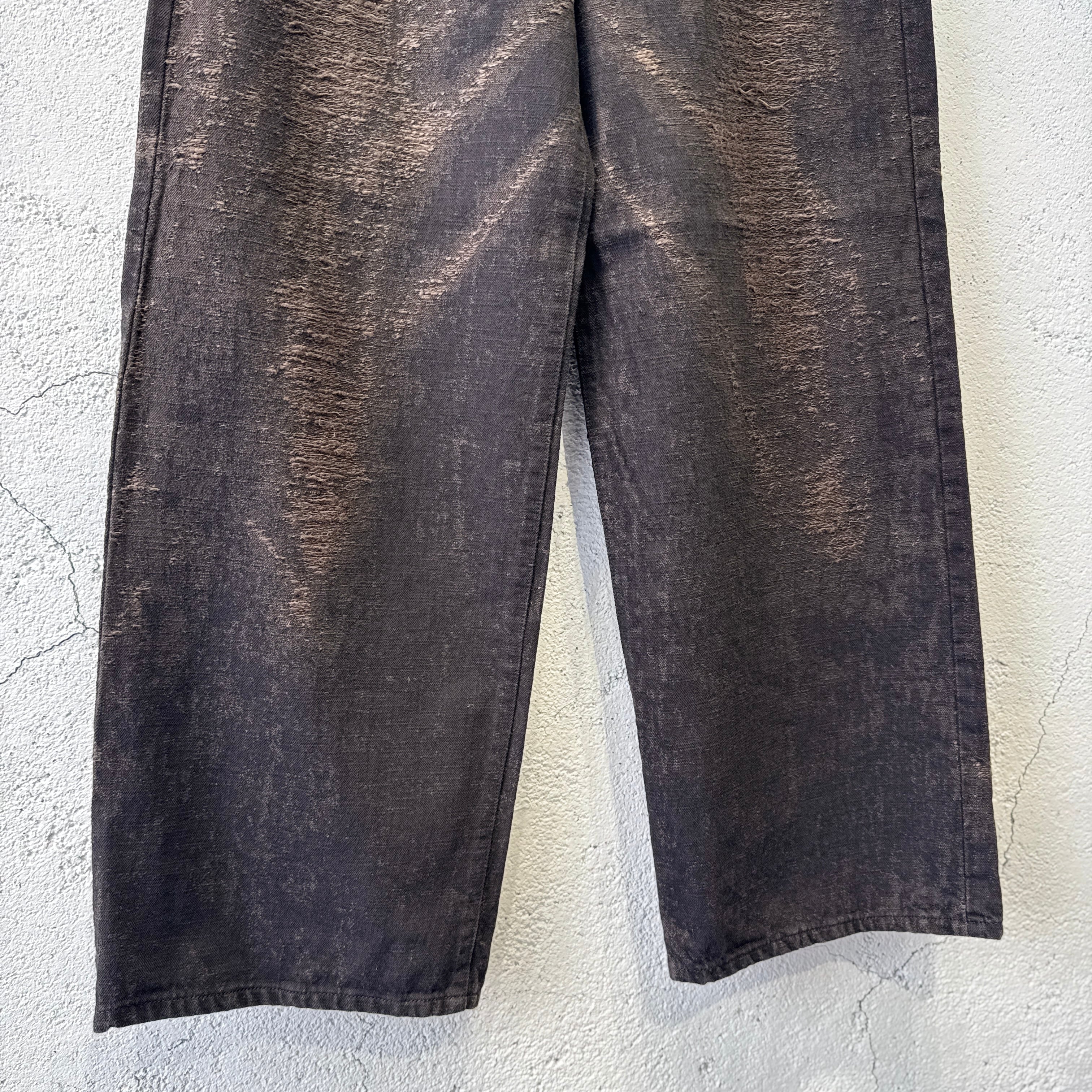 経年変化による色落ちやアタリを、プリントや加工ではなく、ジャカード織りで表現したワイドデニムパンツ