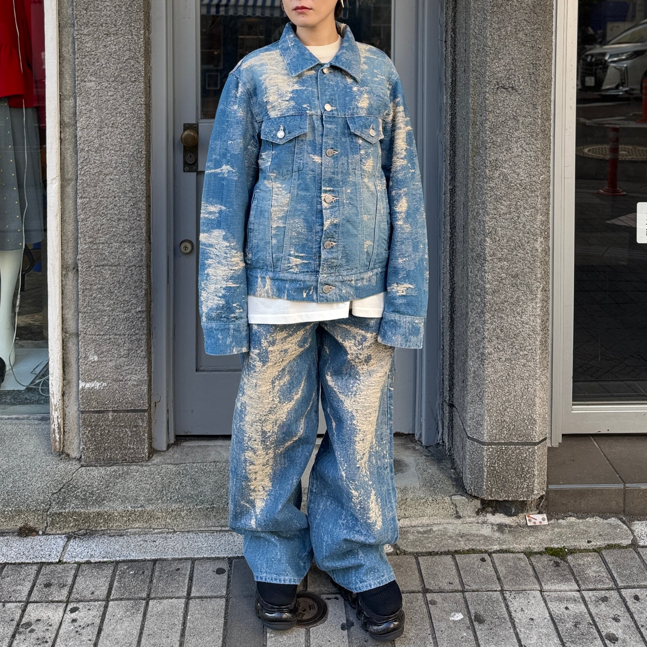 経年変化による色落ちやアタリを、プリントや加工ではなく、ネップ糸を織り込んだジャカード織りで表現したデニムジャケット