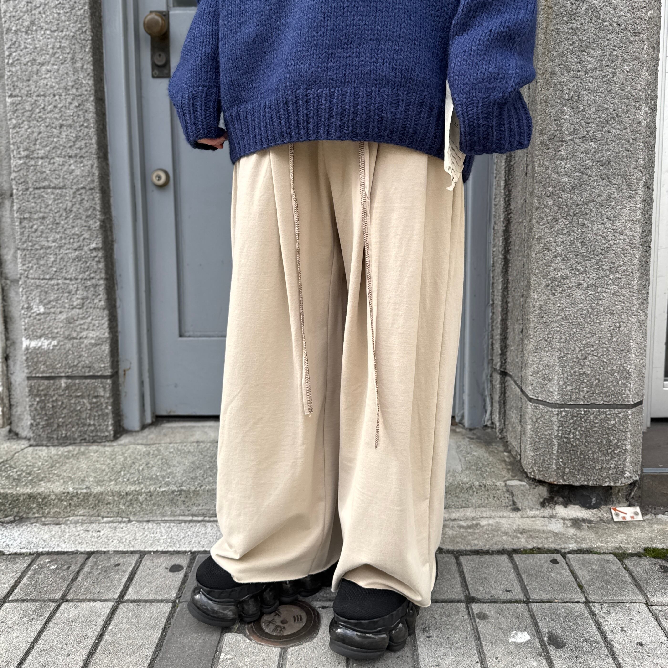 深い2タックを入れ、中縫いを長めに入れることによって腰回りをすっきりとさせながら大胆な太さを出しています