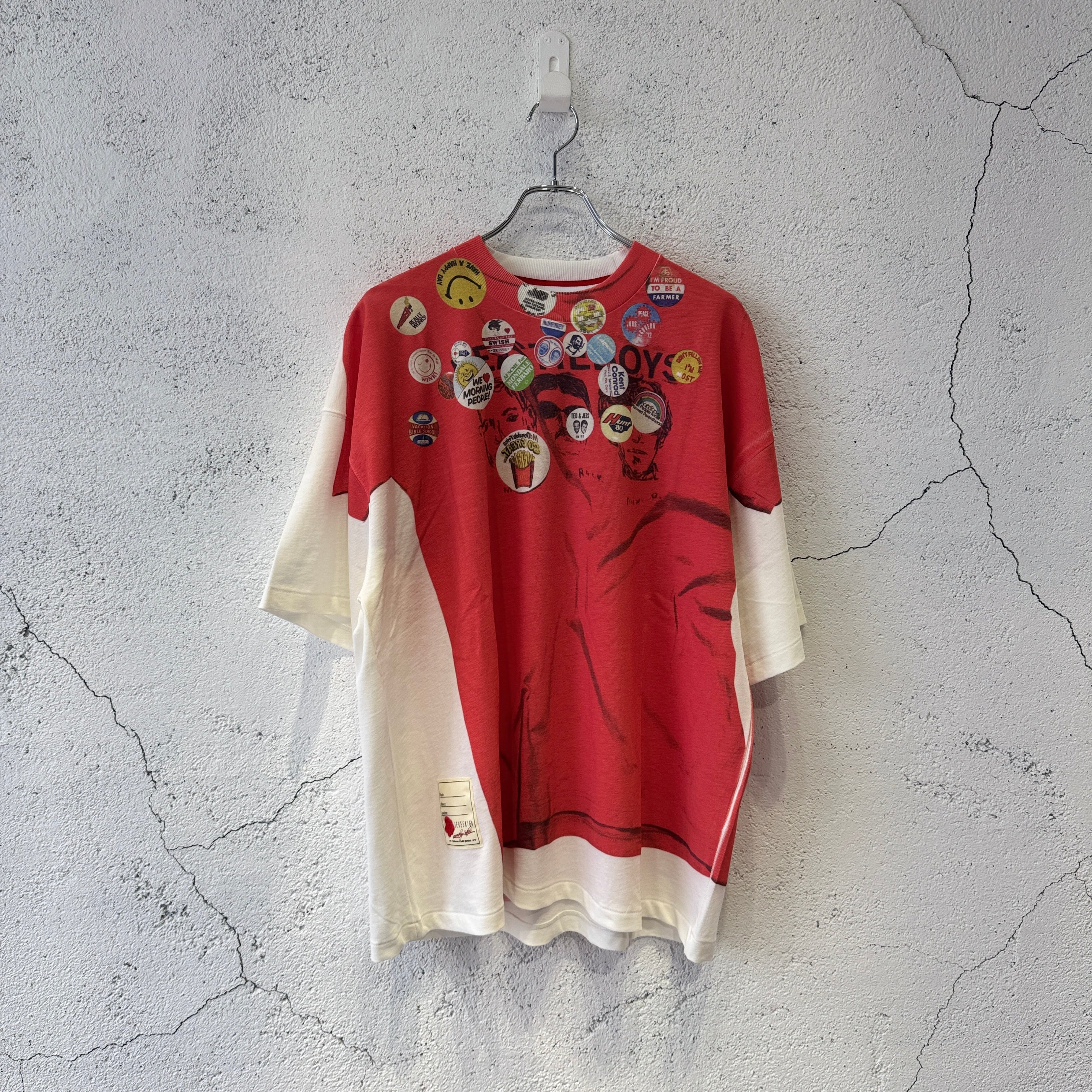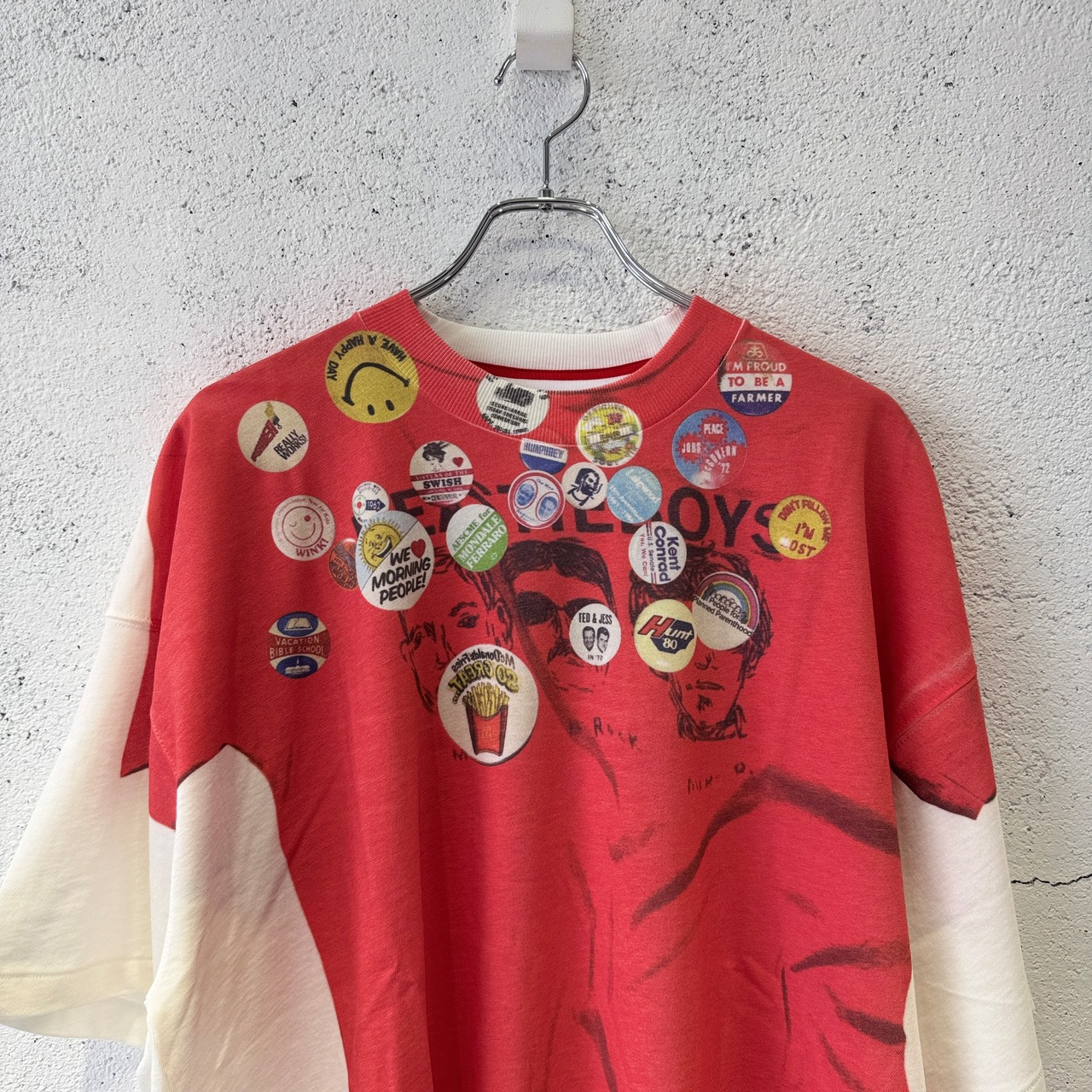 デザイナーが所有している10代の頃に着ていた古着のTシャツやバッジをコラージュし、転写したTシャツ