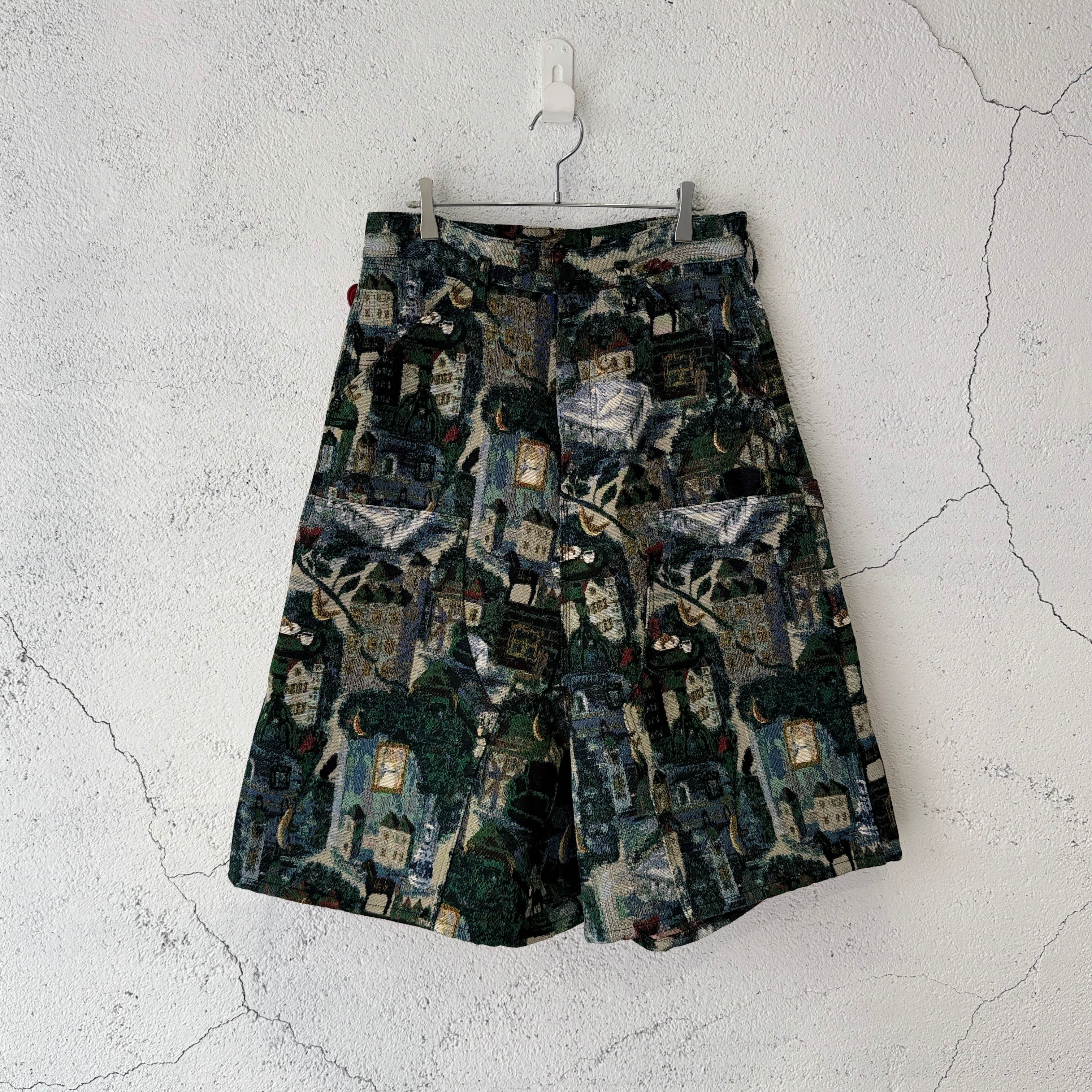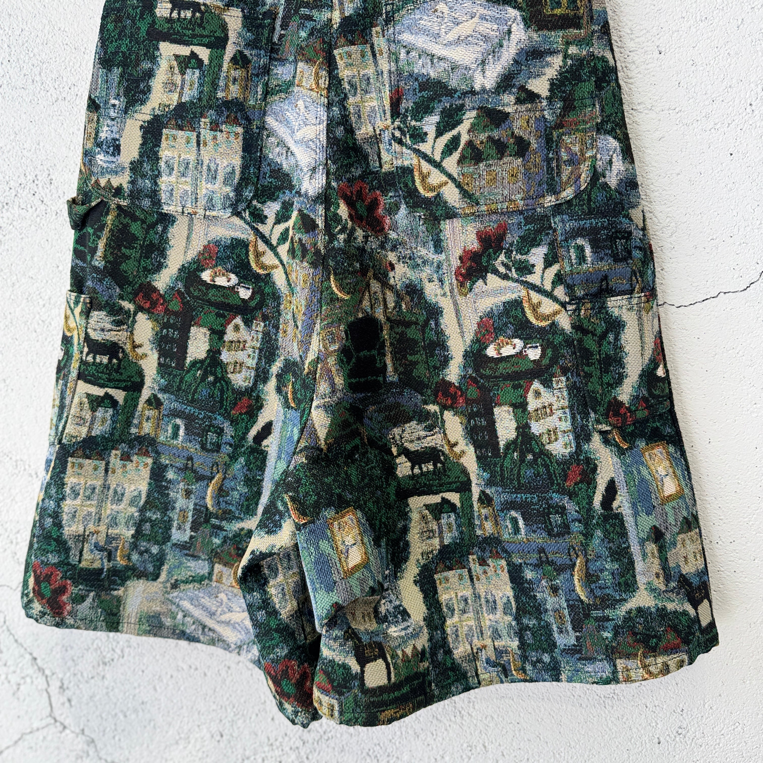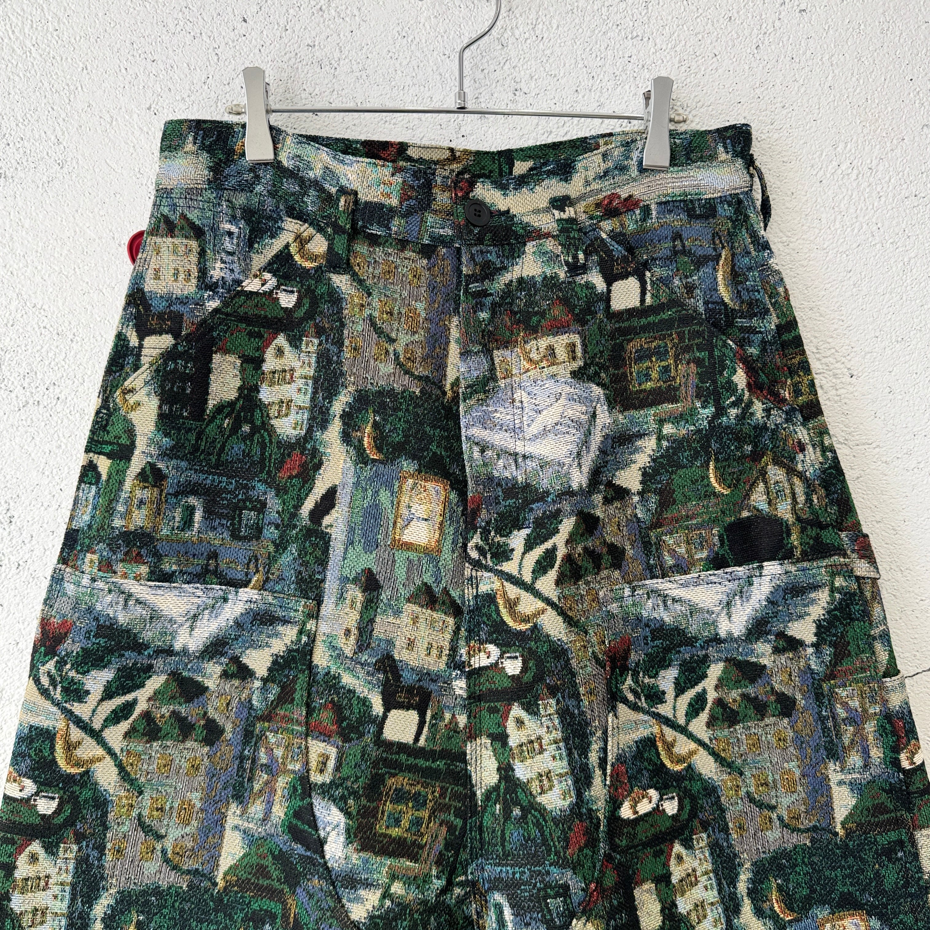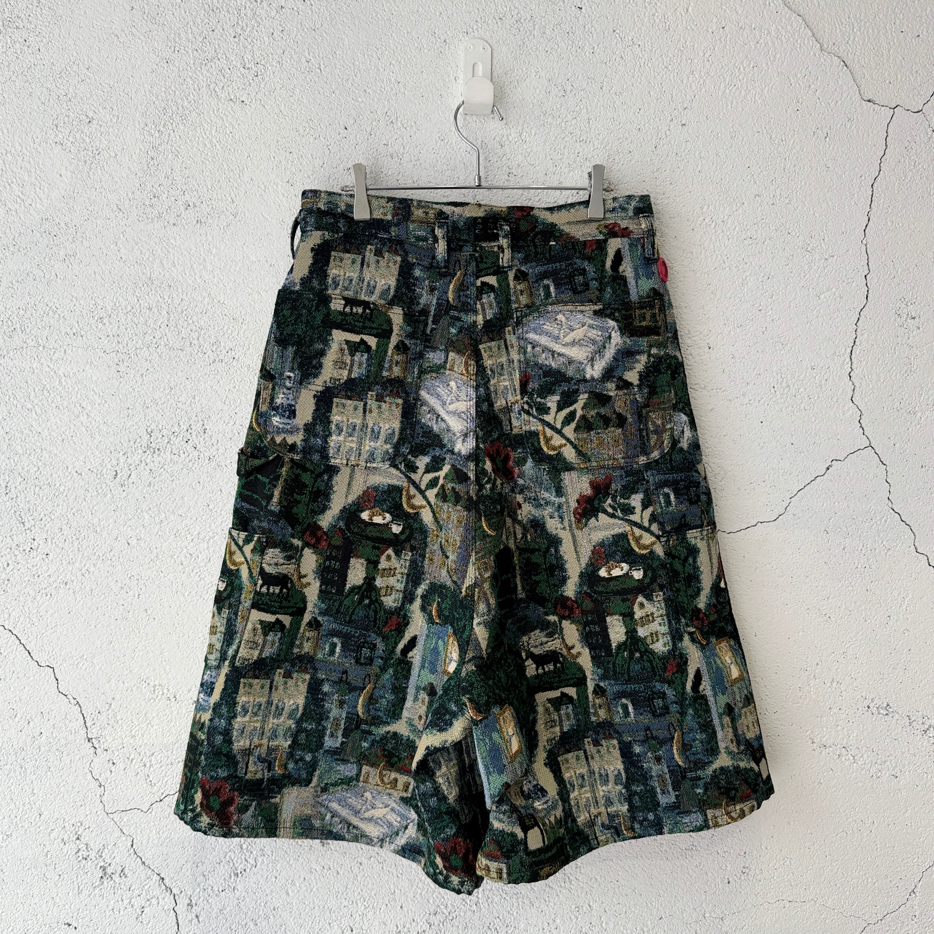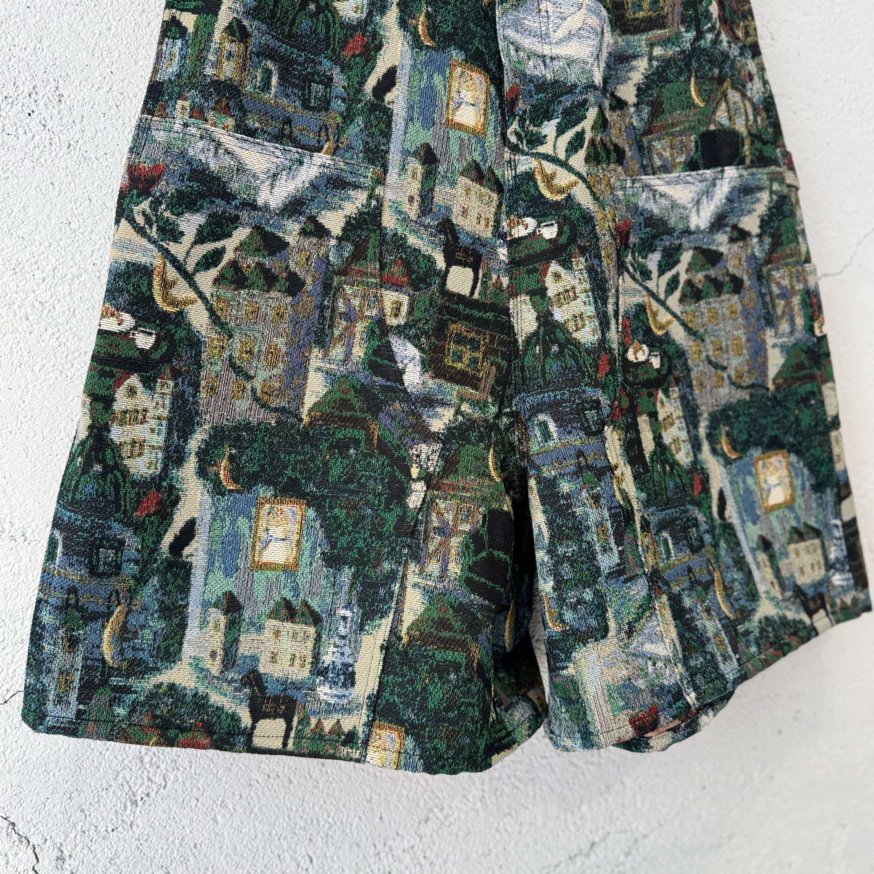 今シーズンのコレクションを象徴するデザイナーによる手描きの絵をゴブラン織りで表現した膝下丈のショーツ
