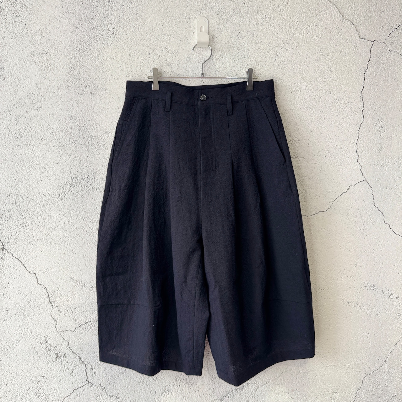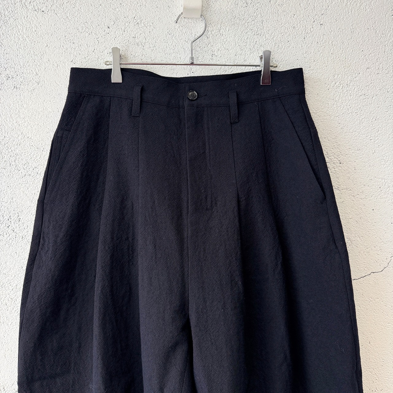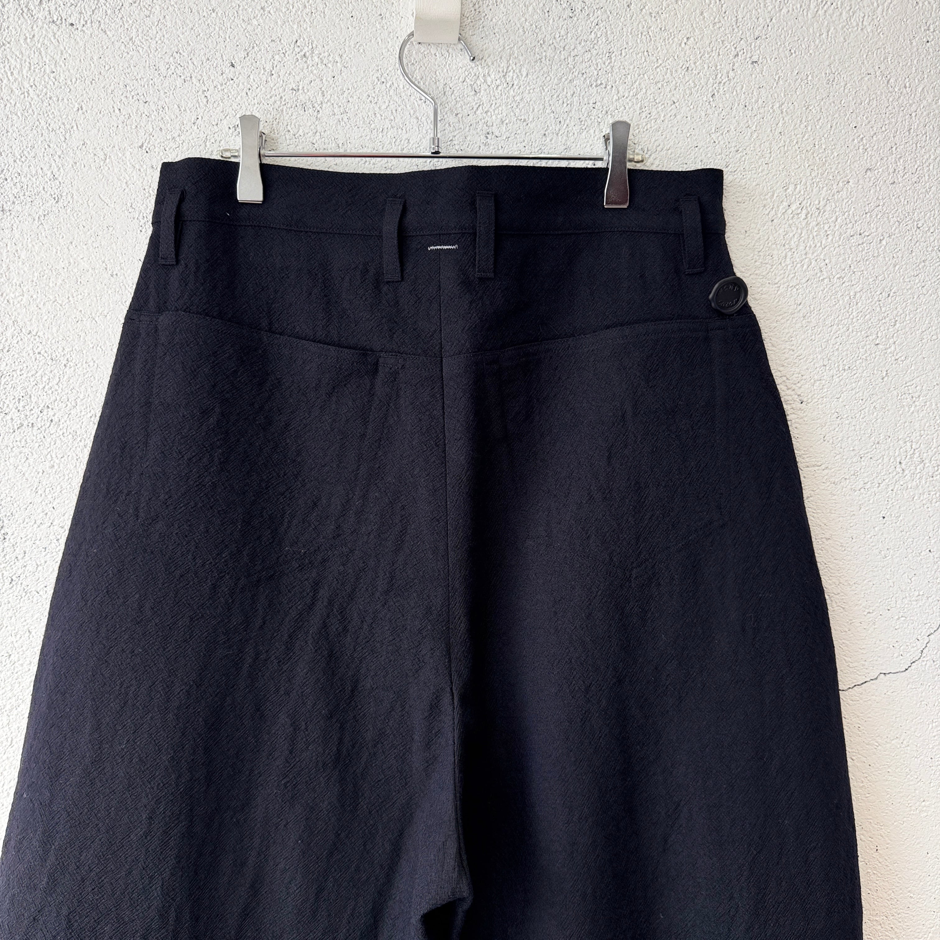 フロントに深く2タック入れて、腰回りはすっきりとさせながらも、しっかりと太さを出した特徴的なシルエット