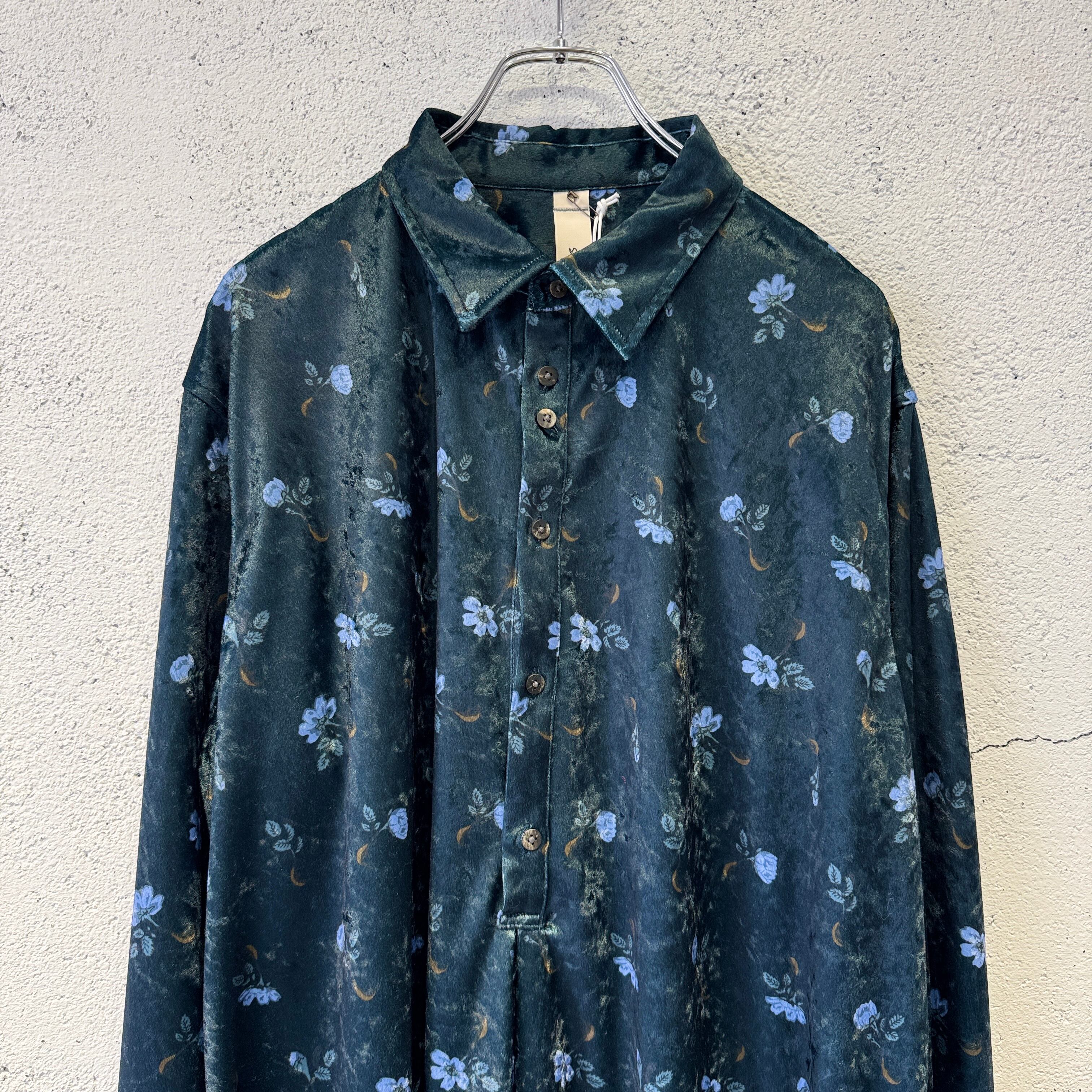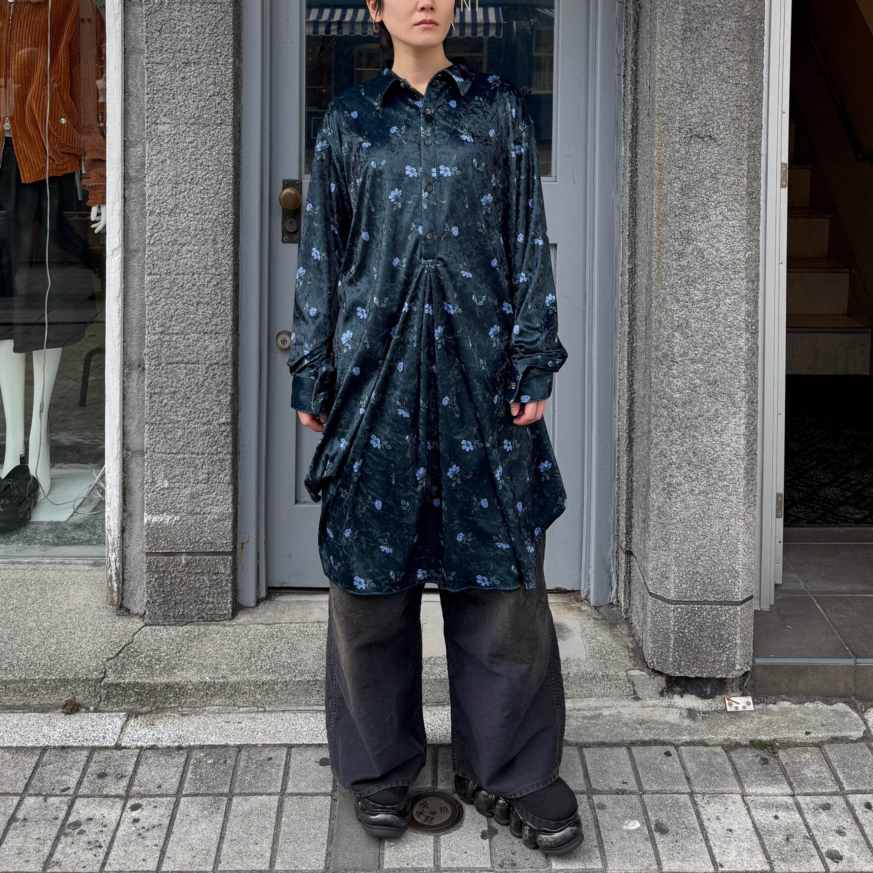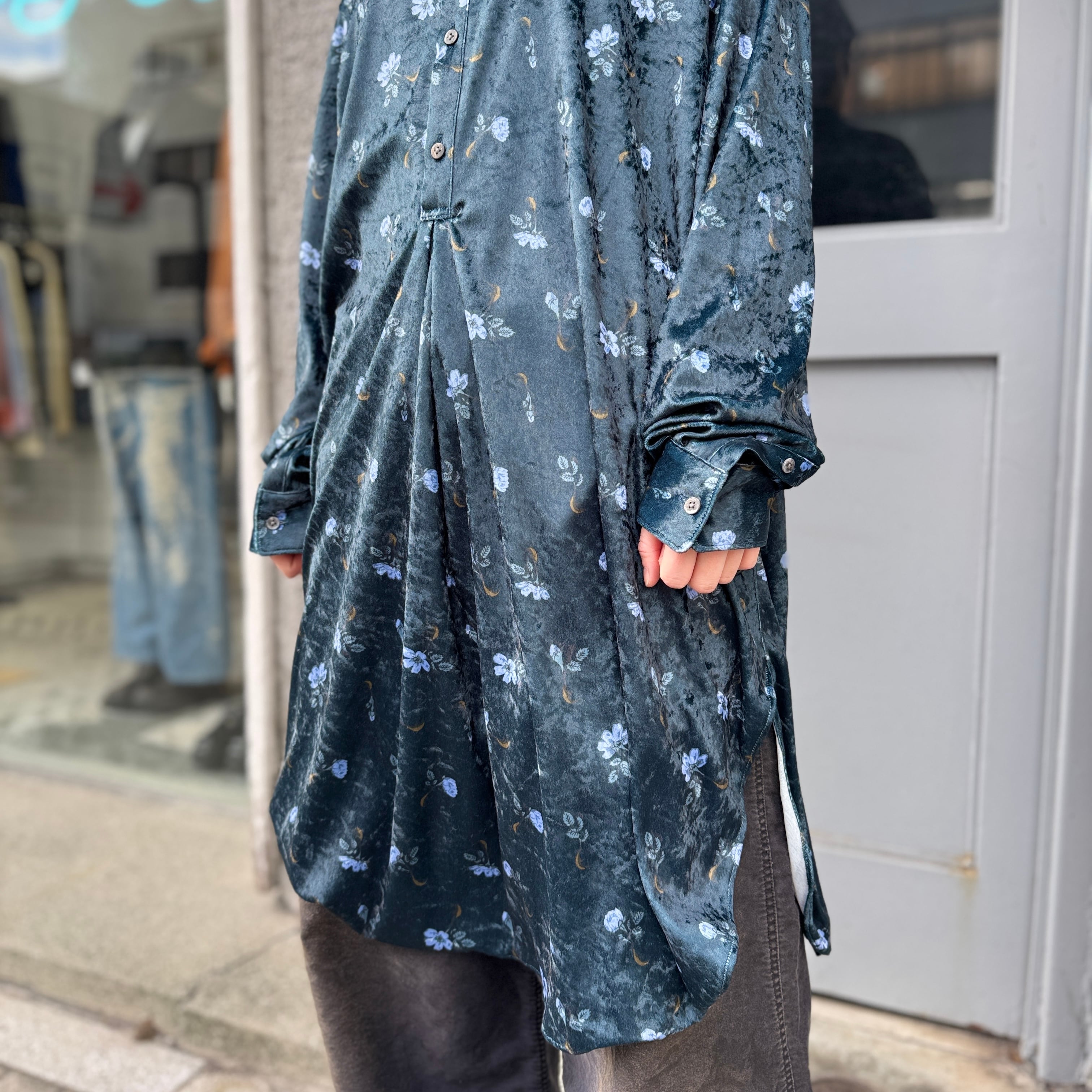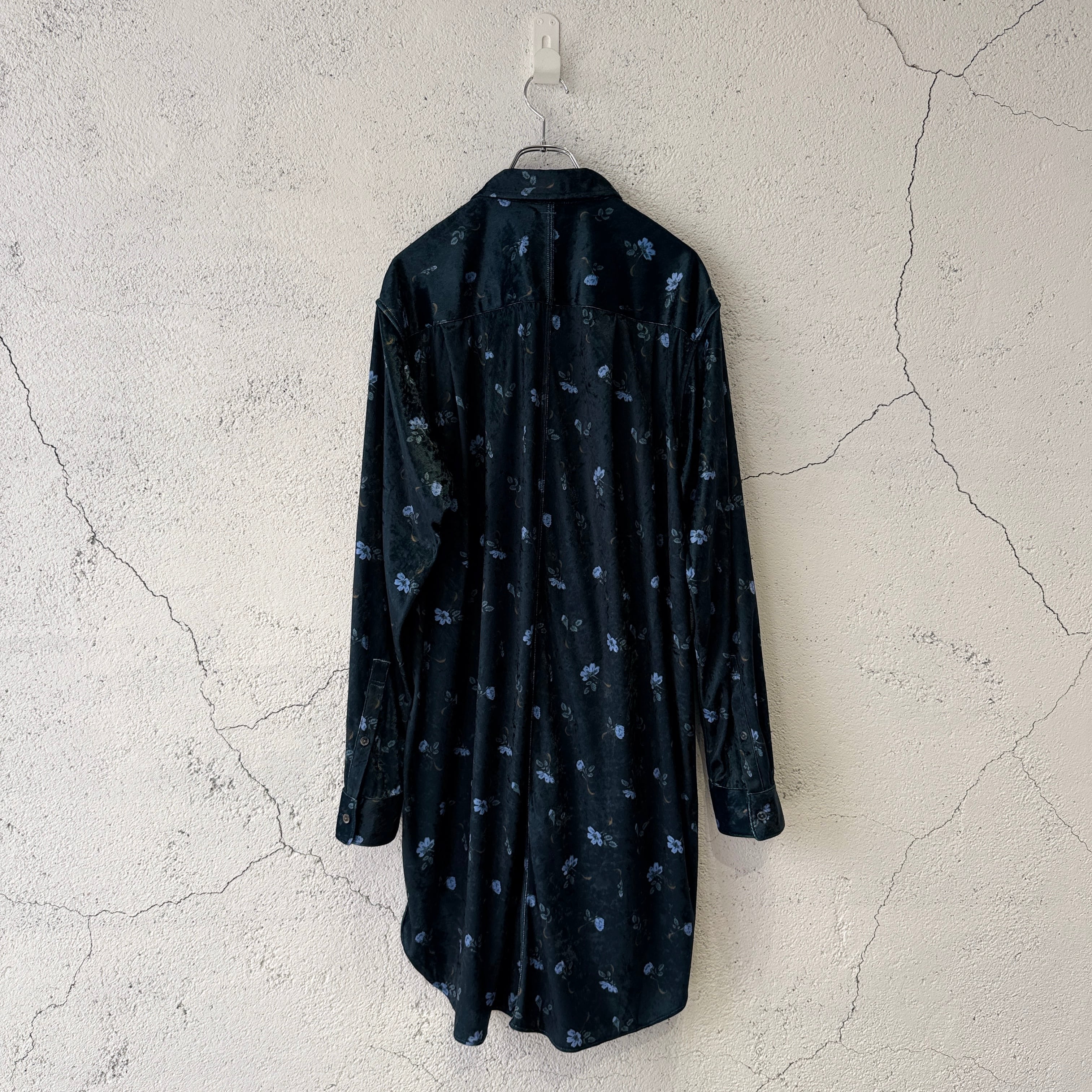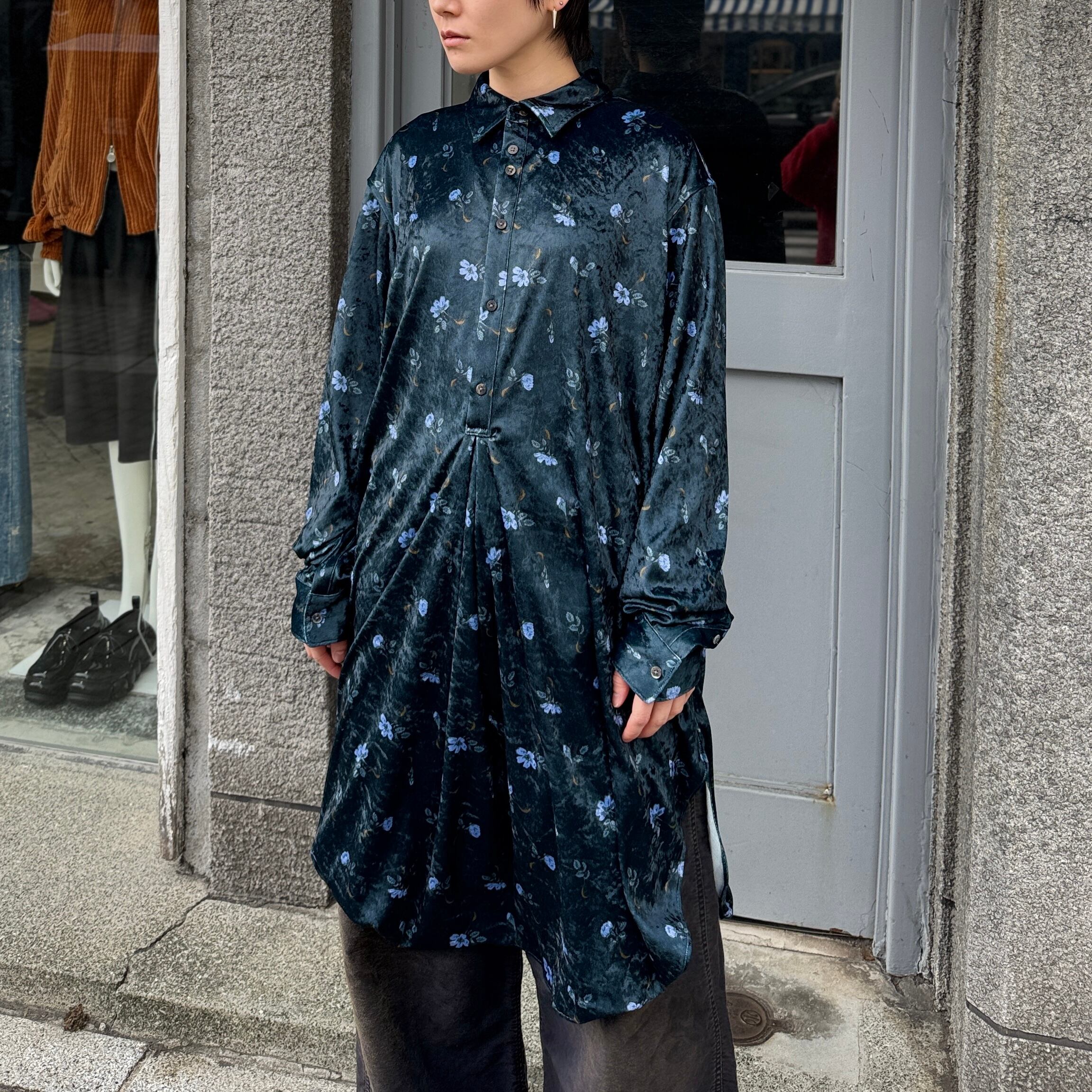毛の向きがランダムなクラッシュベルベットの生地を使用した花柄のロングシャツ