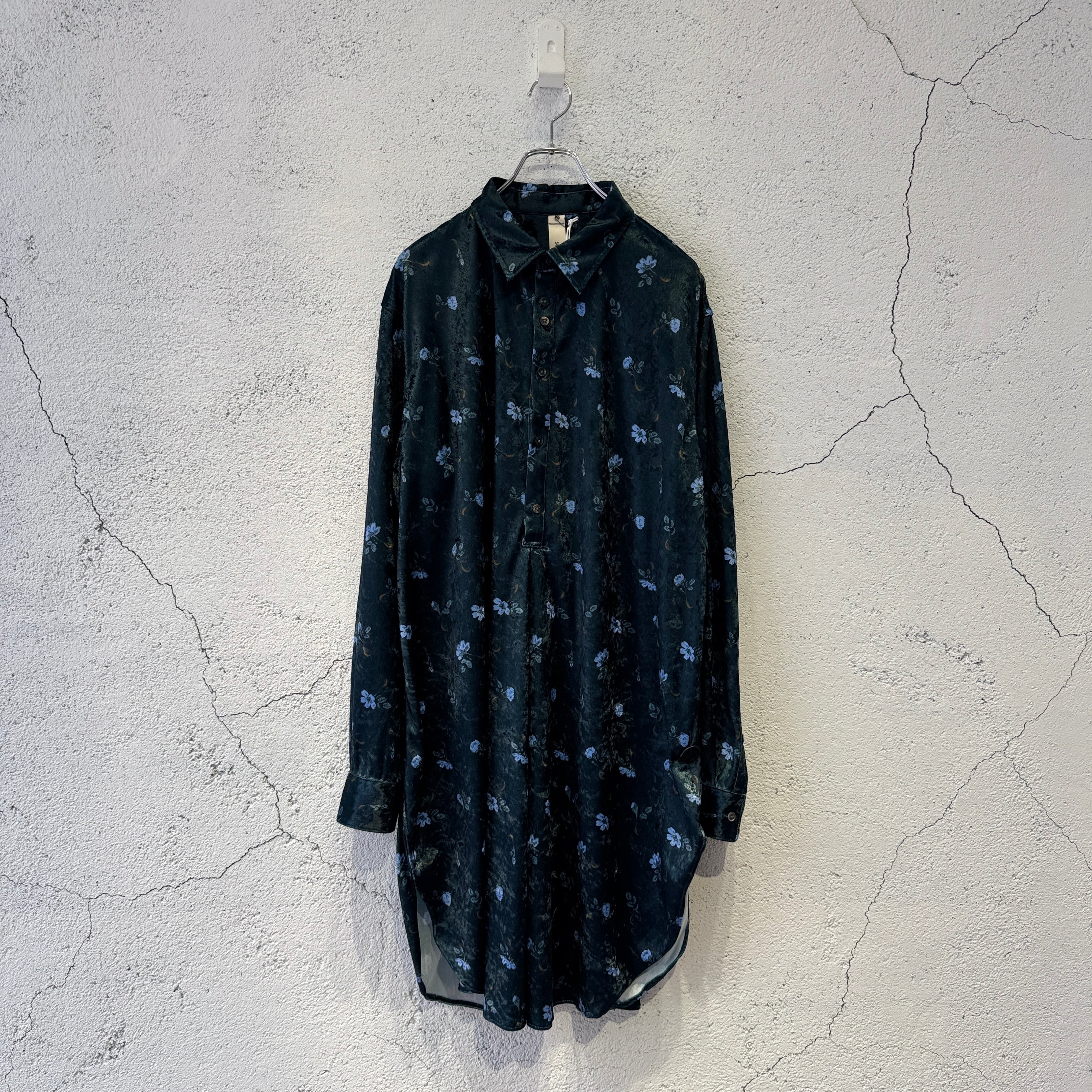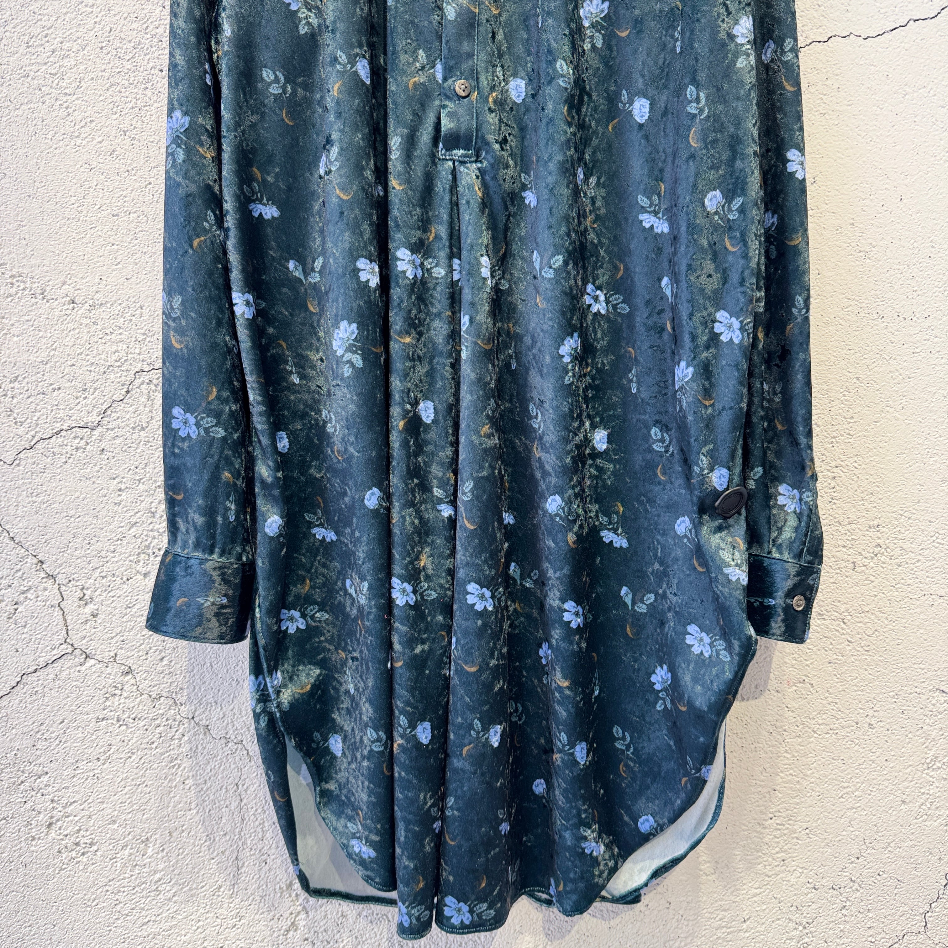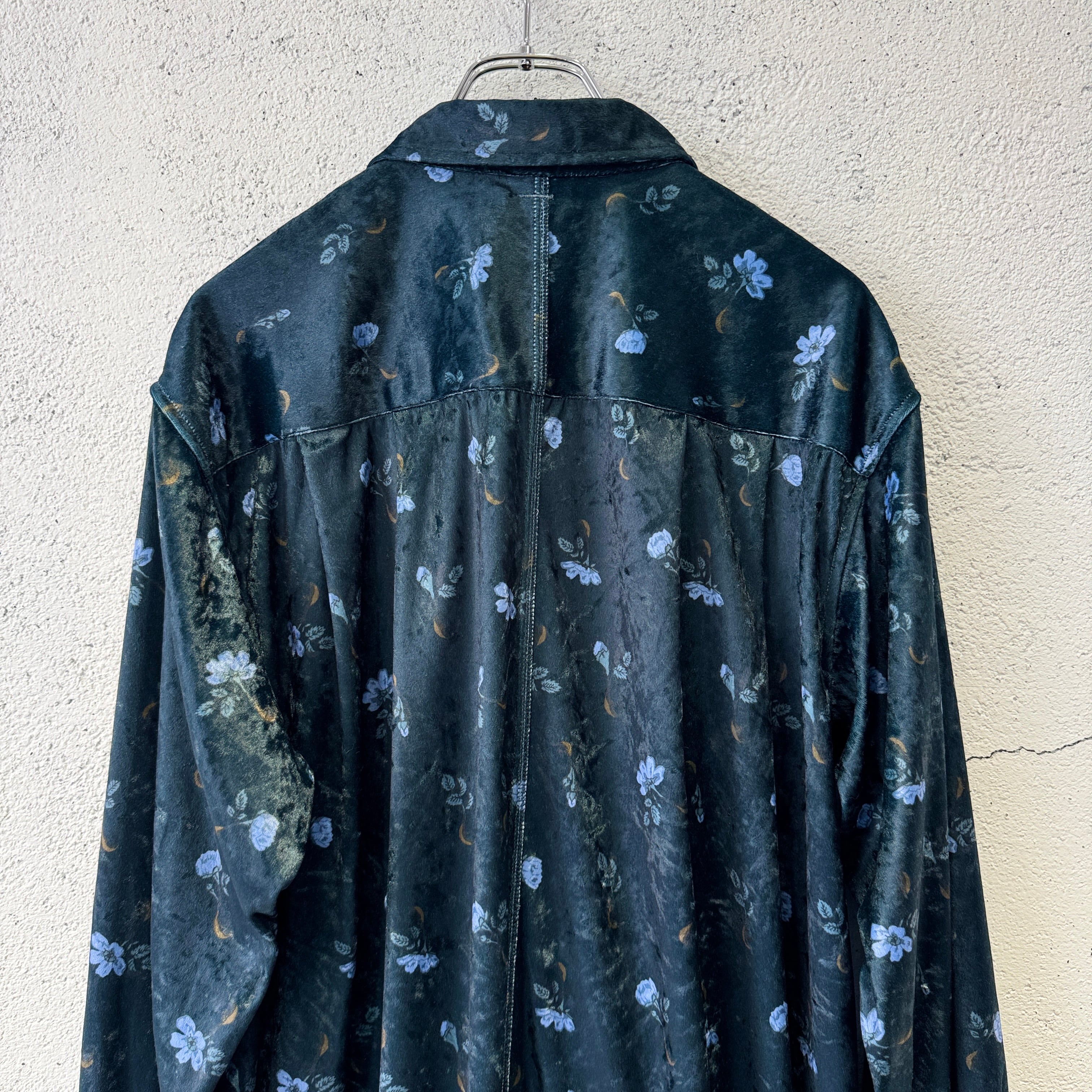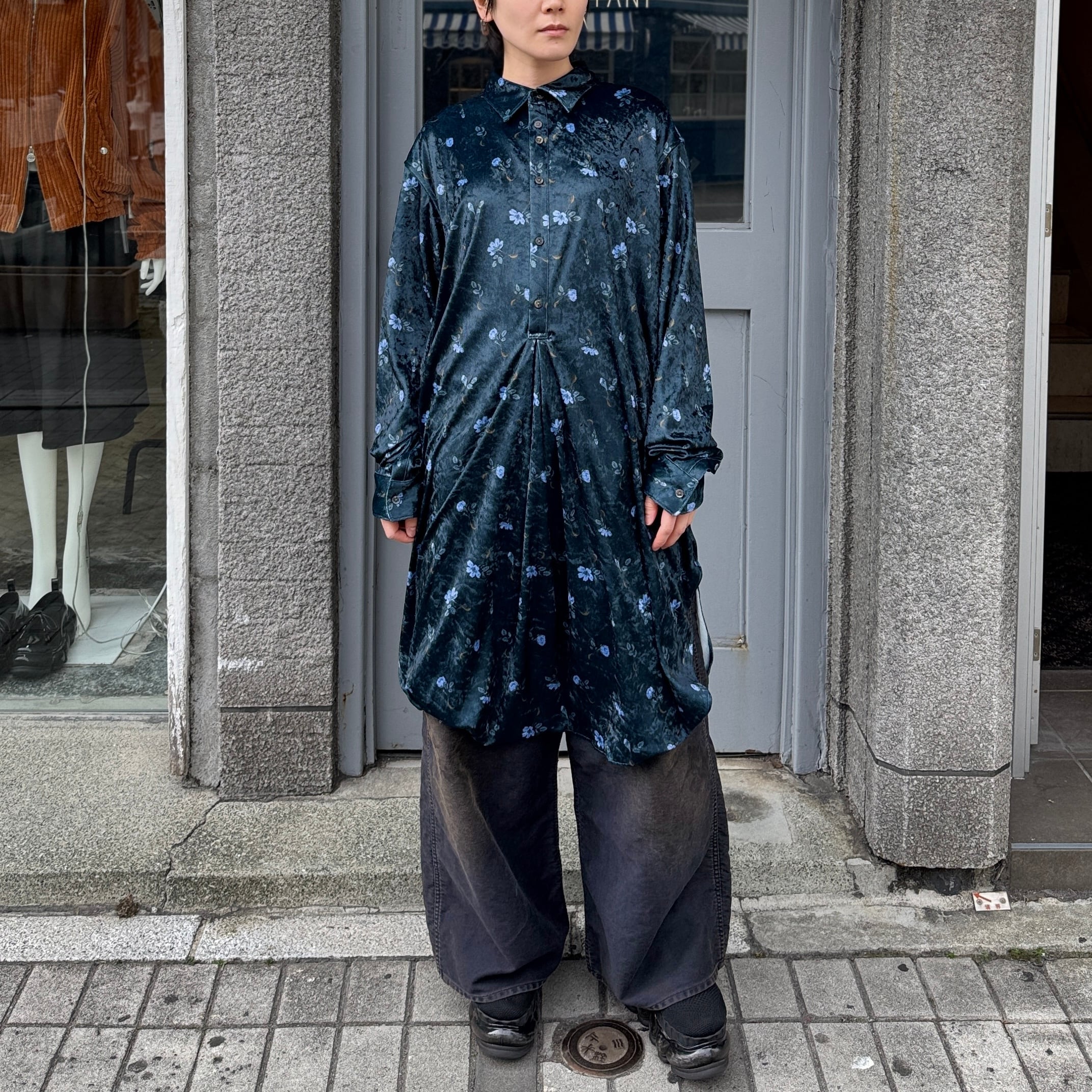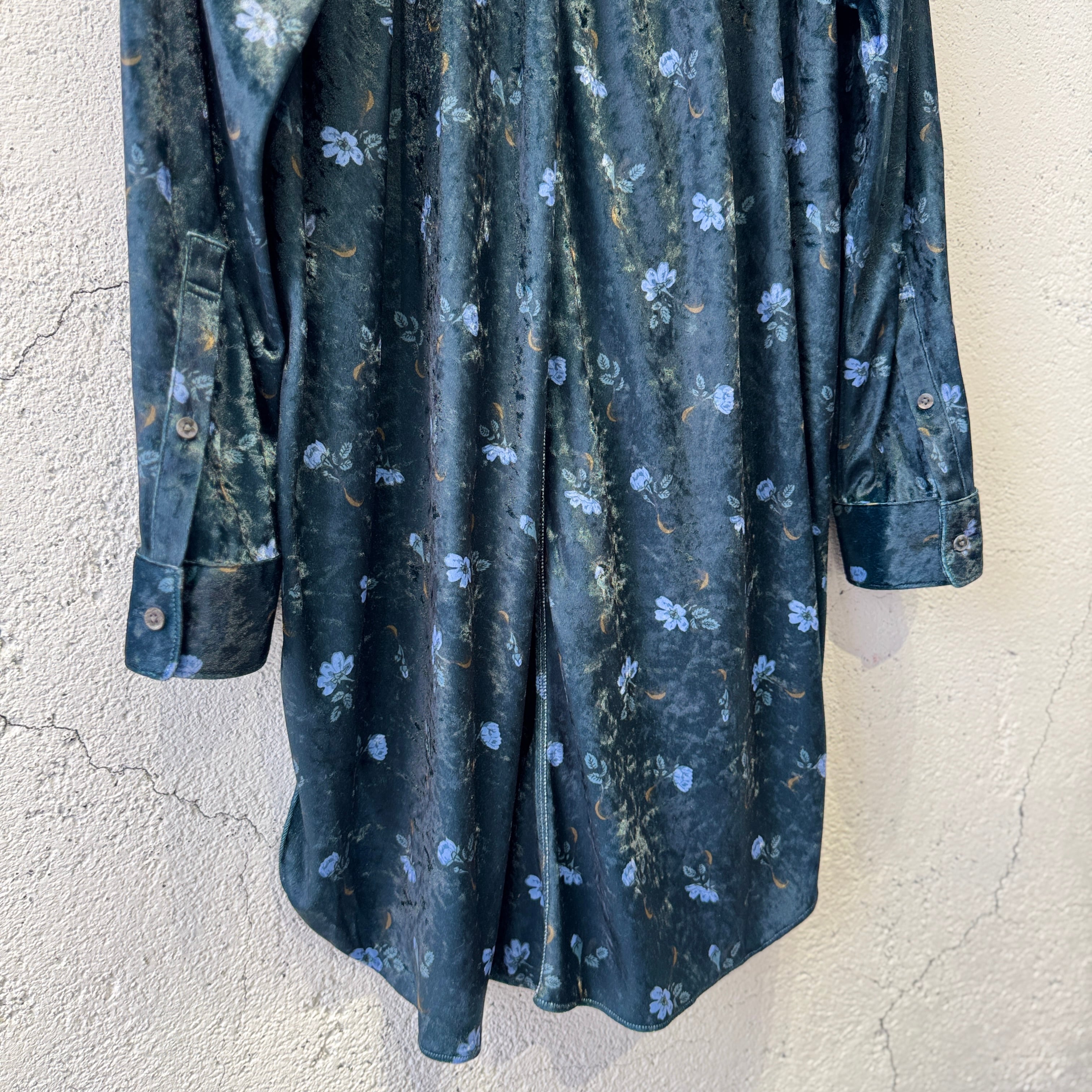 毛の向きがランダムなクラッシュベルベットの生地を使用した花柄のロングシャツ