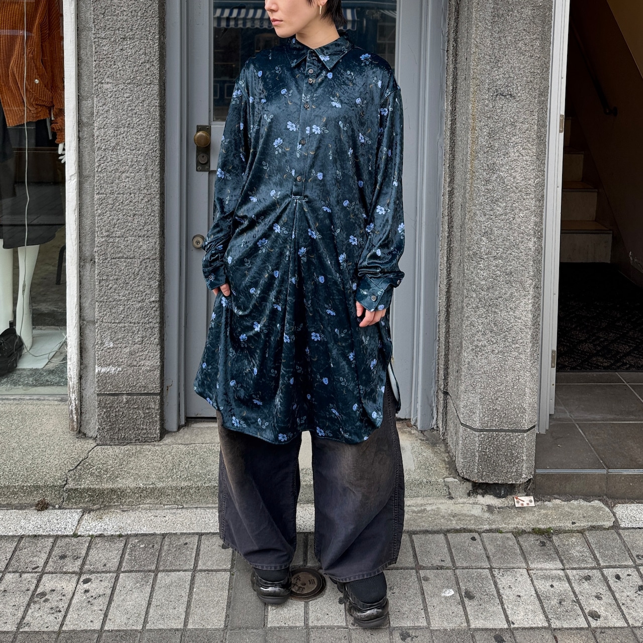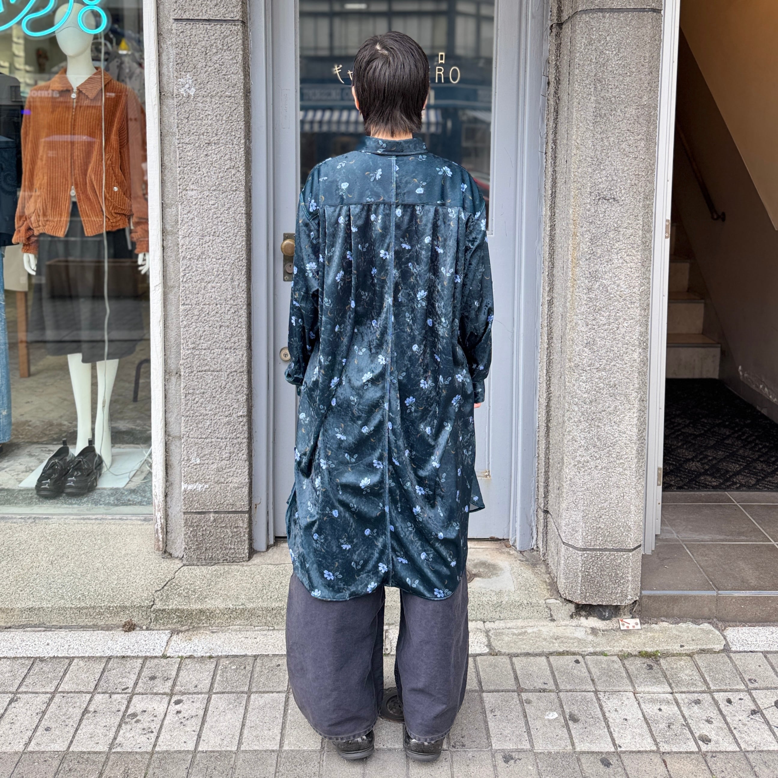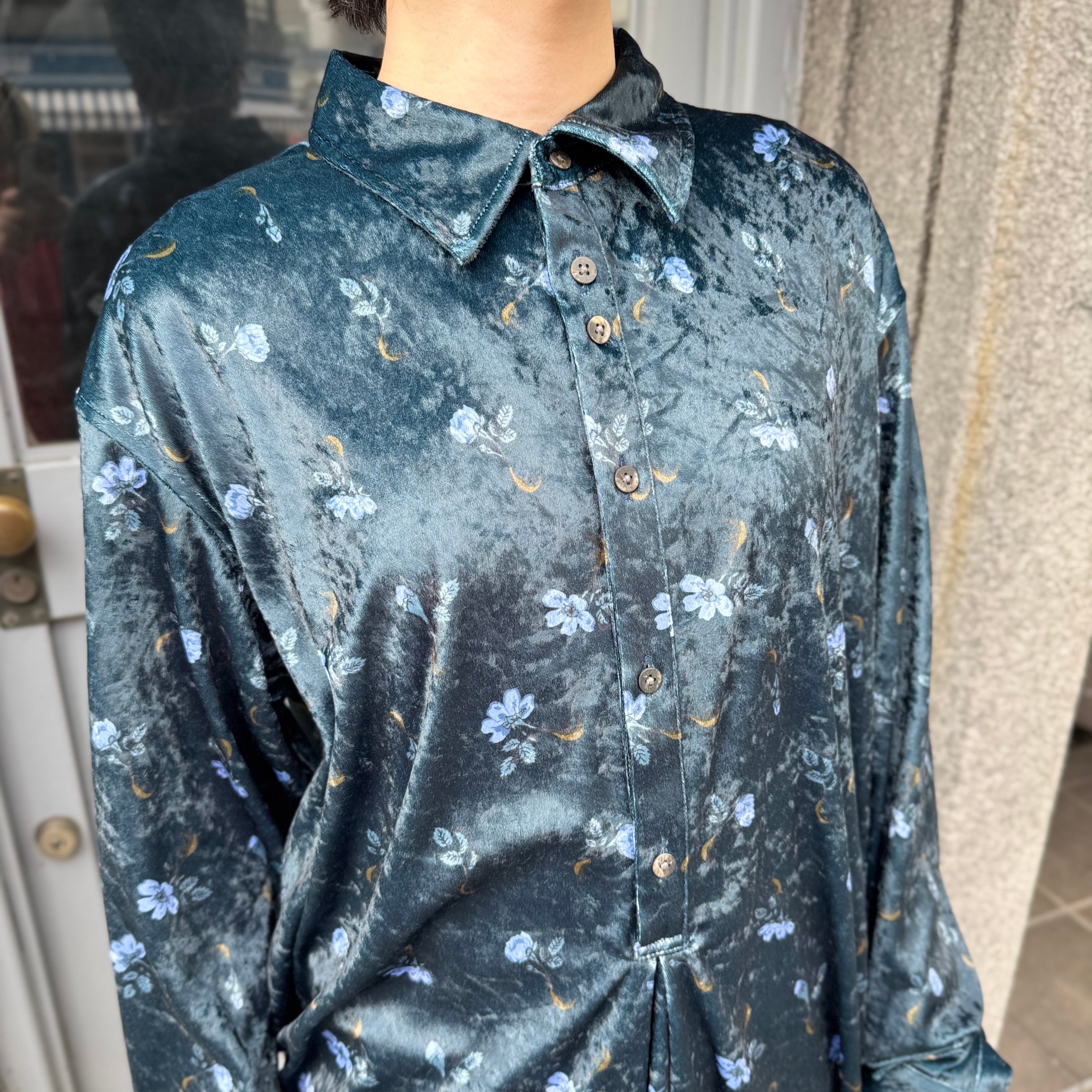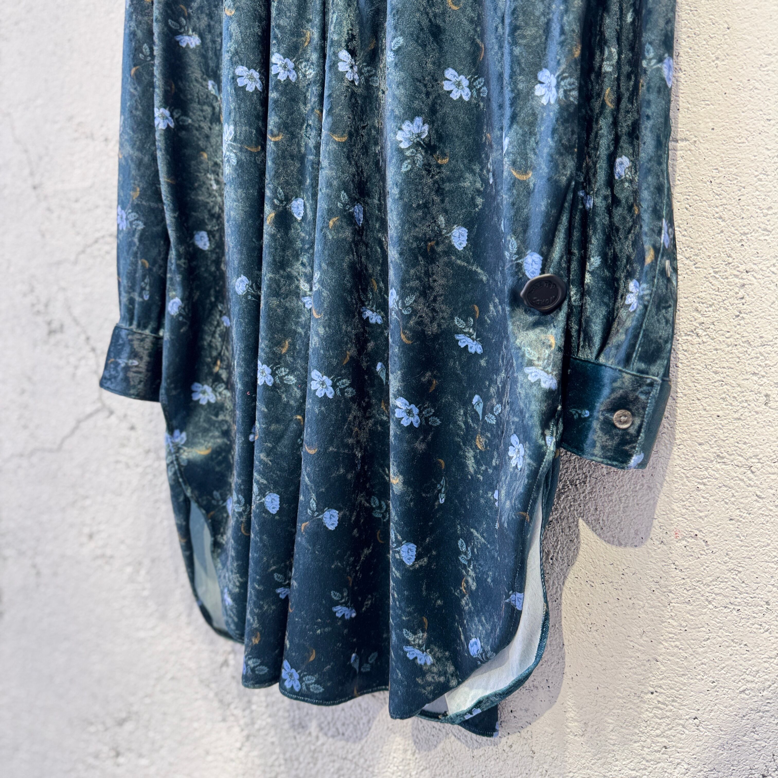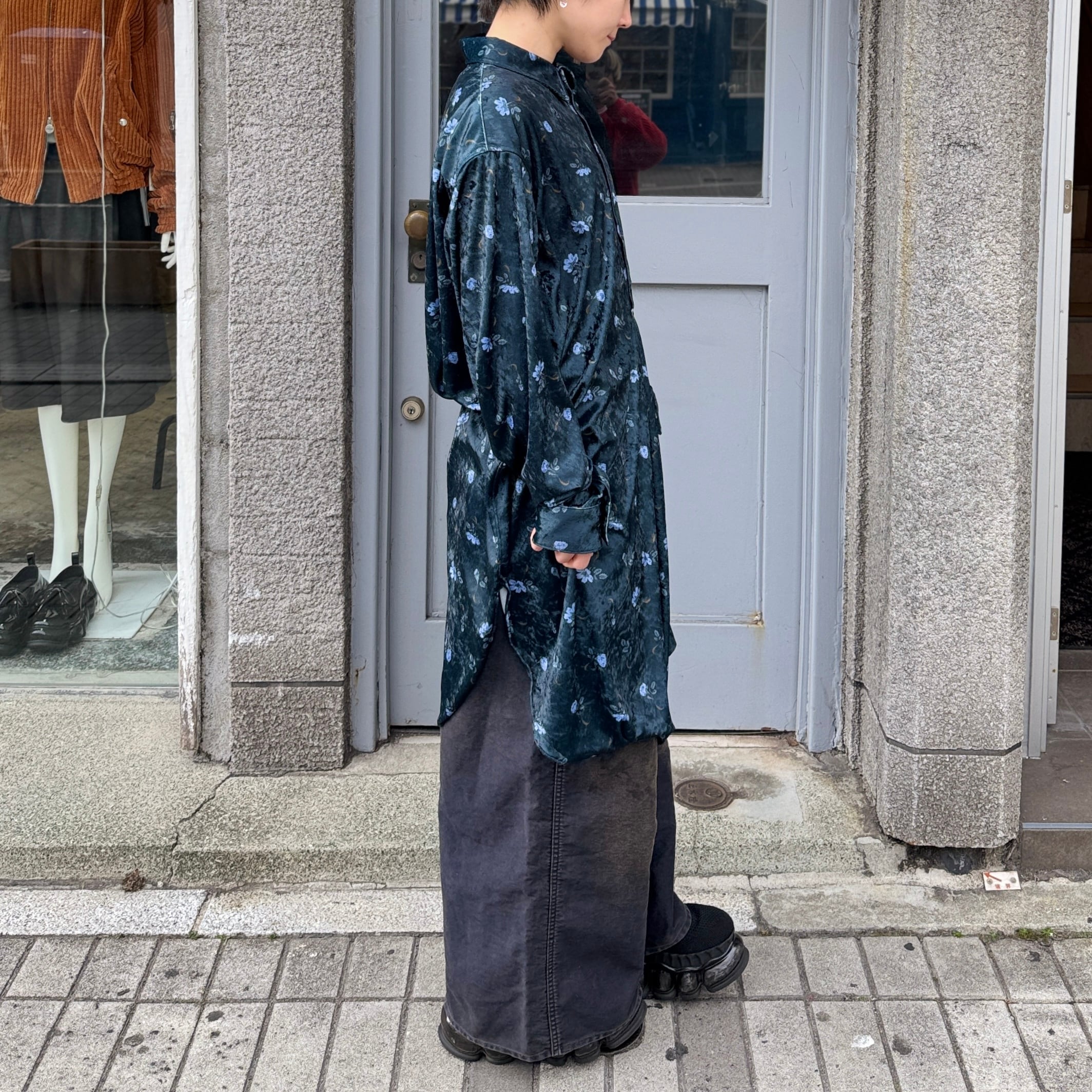 毛の向きがランダムなクラッシュベルベットの生地を使用した花柄のロングシャツ