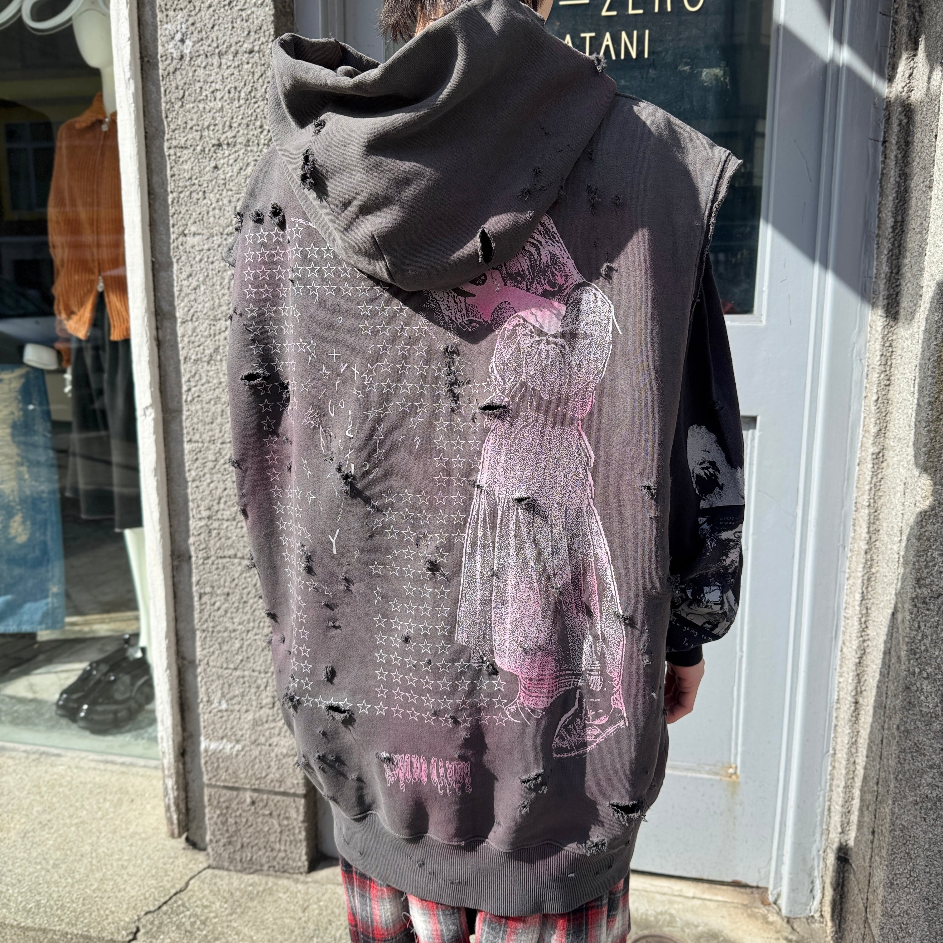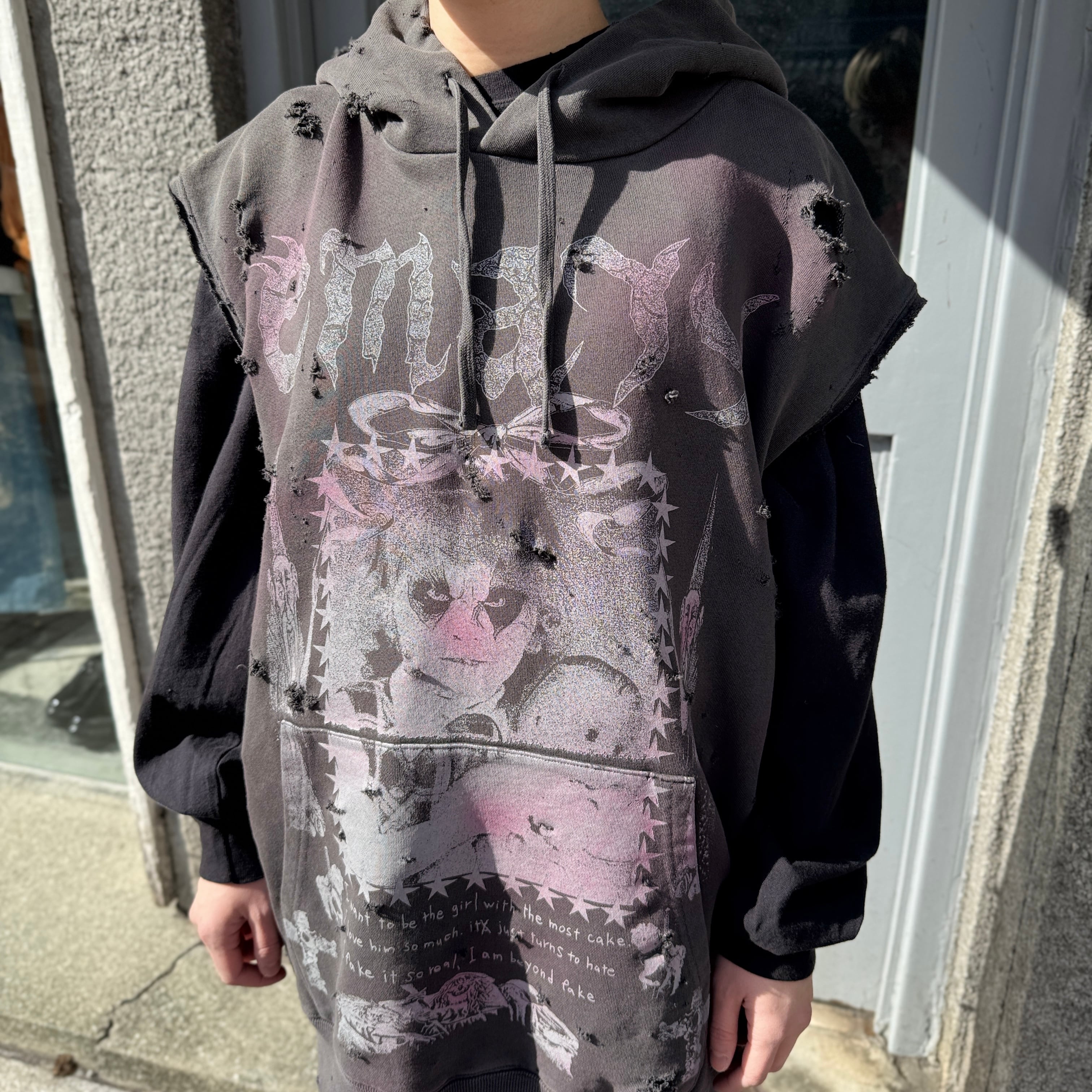 コラージュアーティストOhiana氏によるグラフィックをプリントしたノースリーブのフーディー