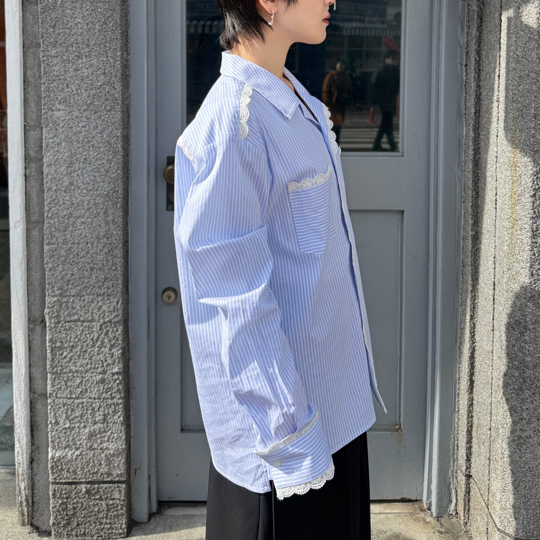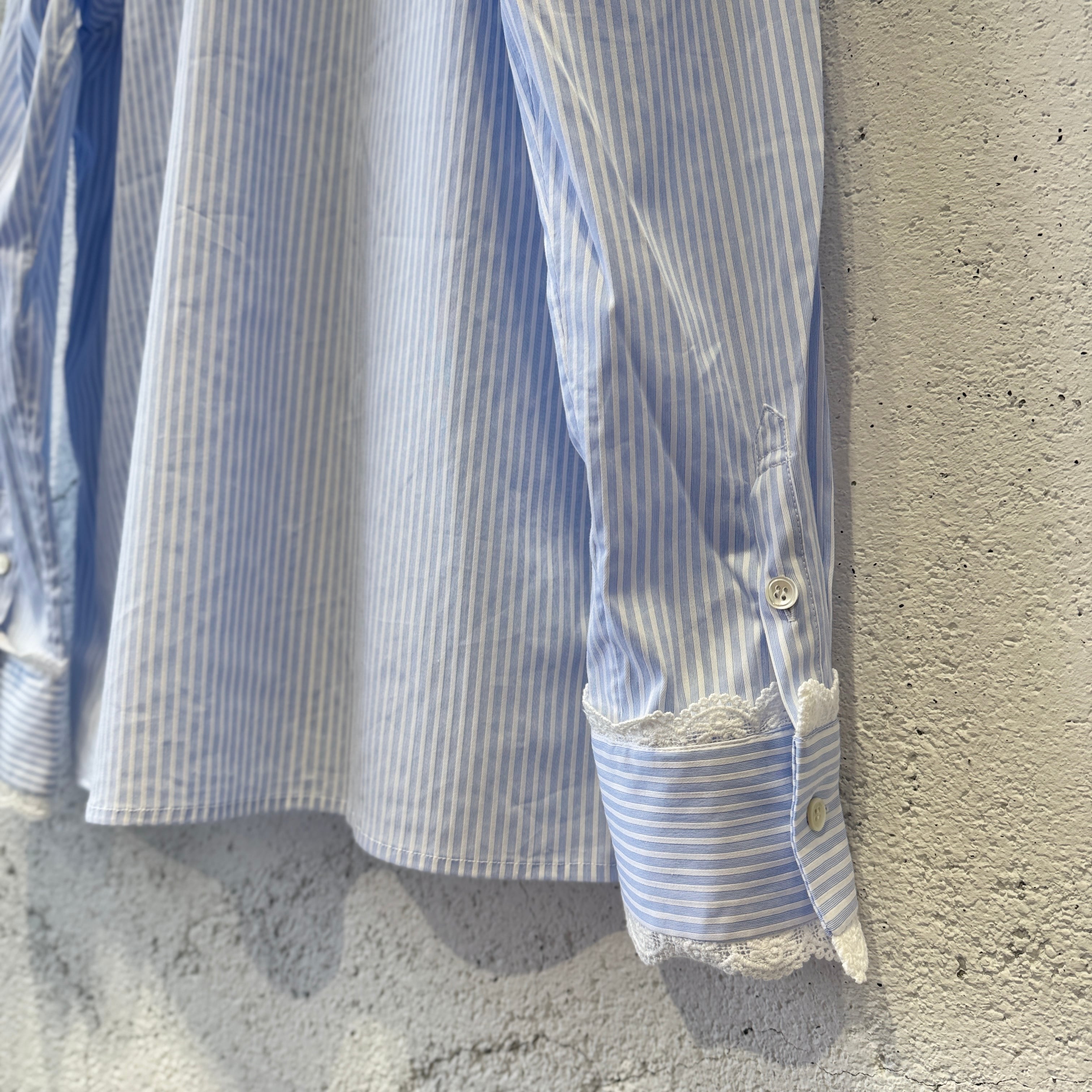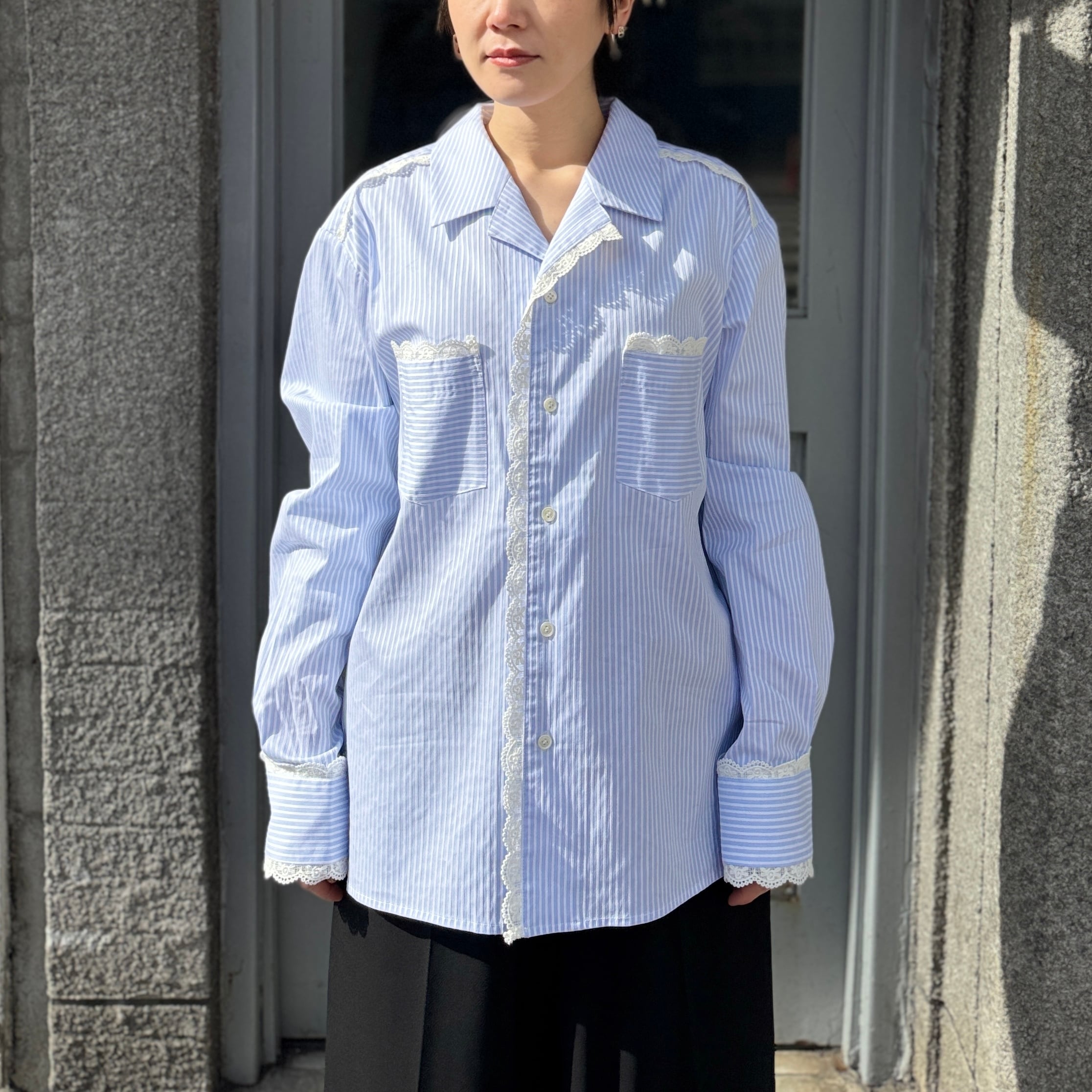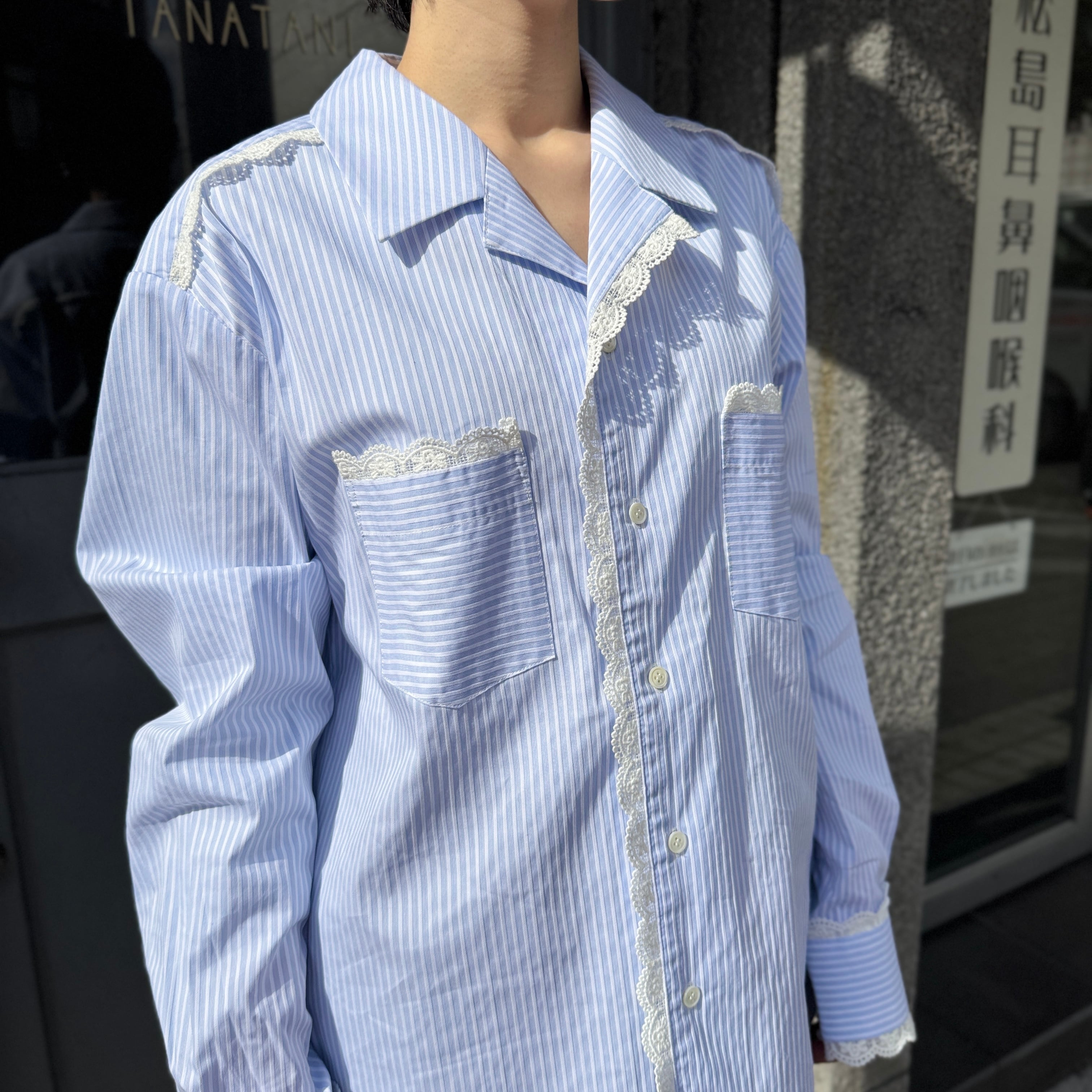 襟や袖にレースが施されたストライプのオープンカラーシャツ