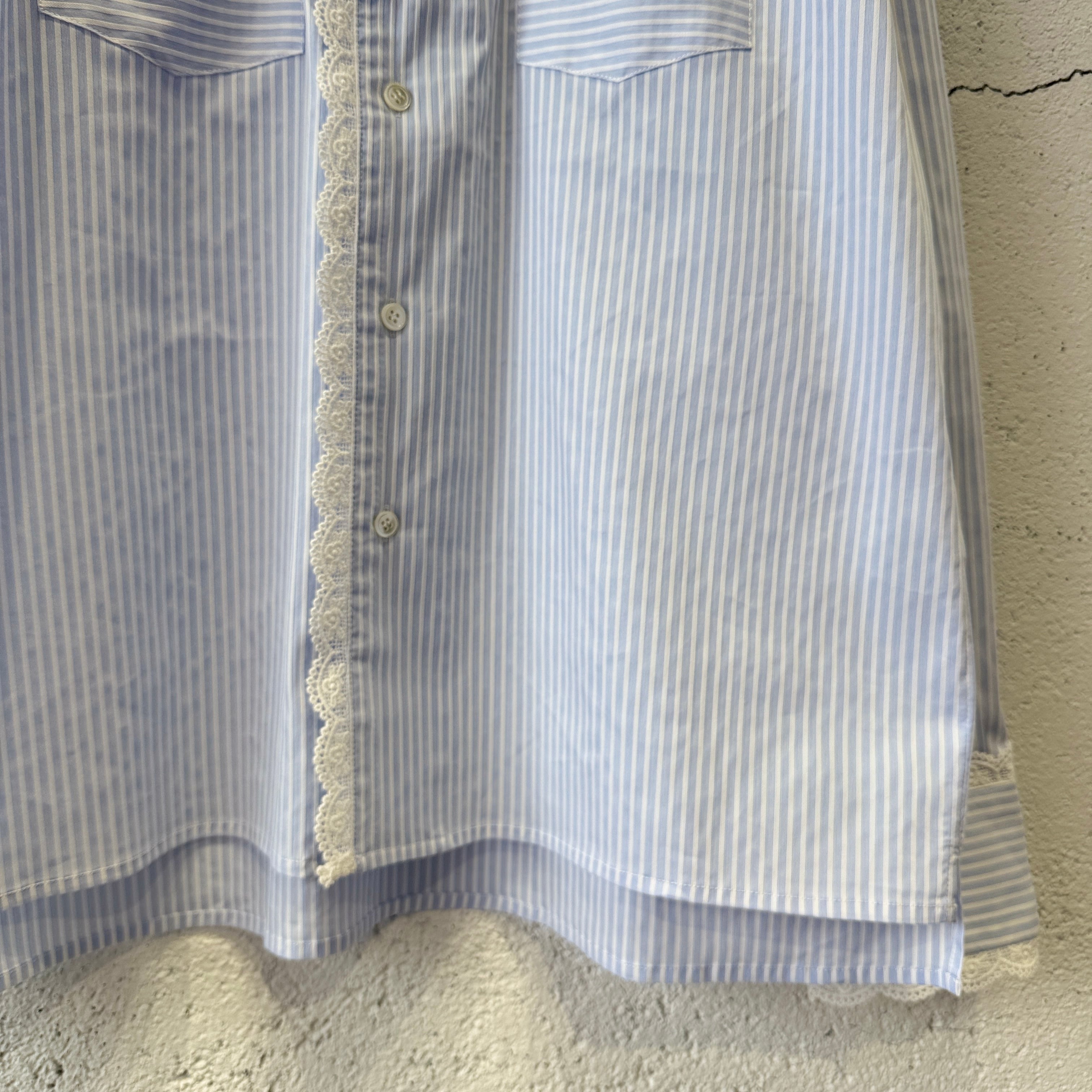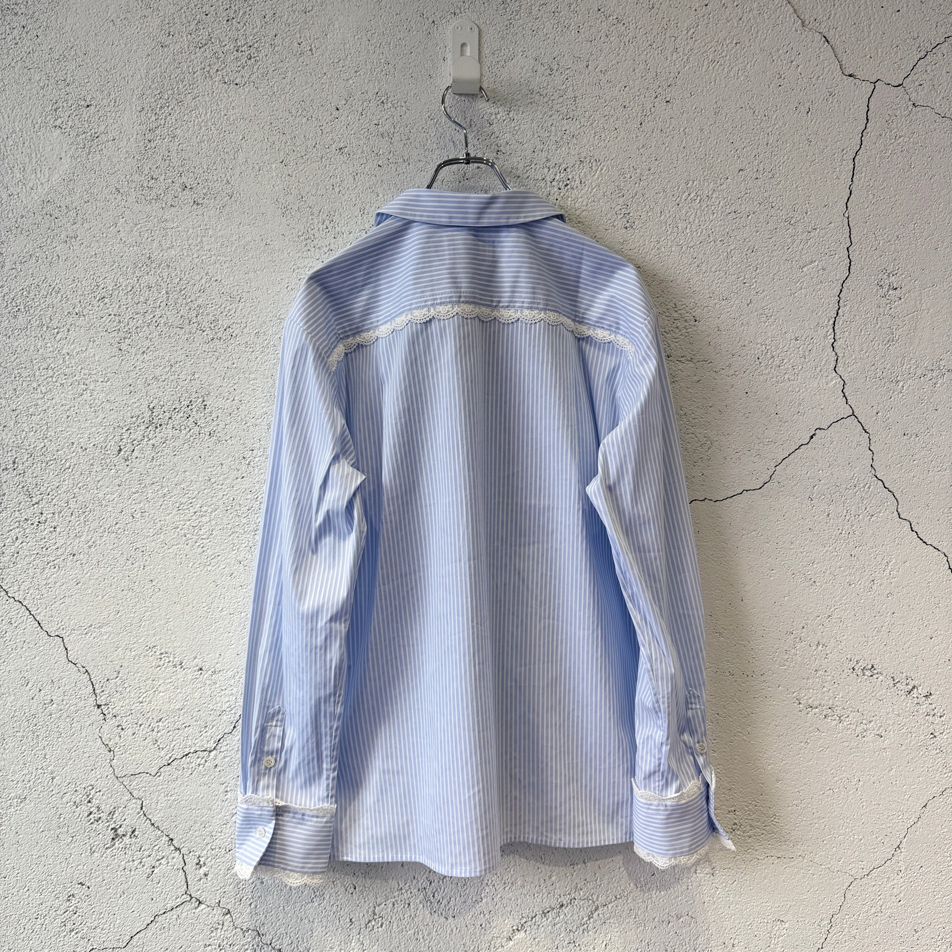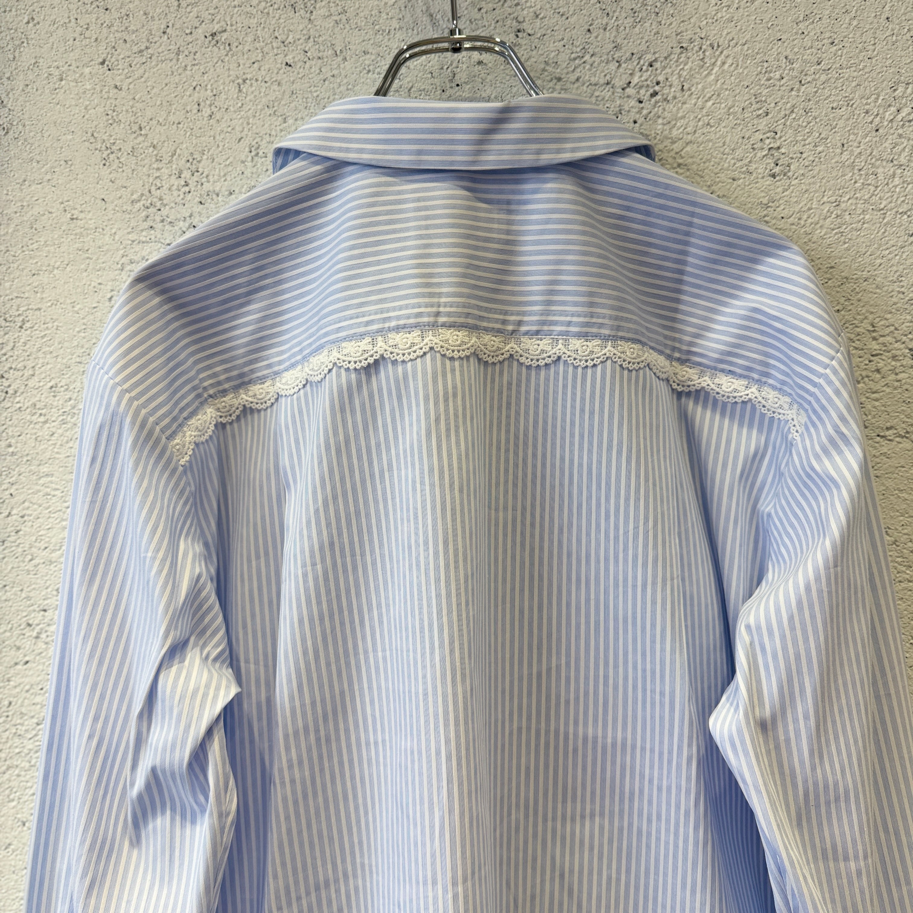 襟や袖にレースが施されたストライプのオープンカラーシャツ