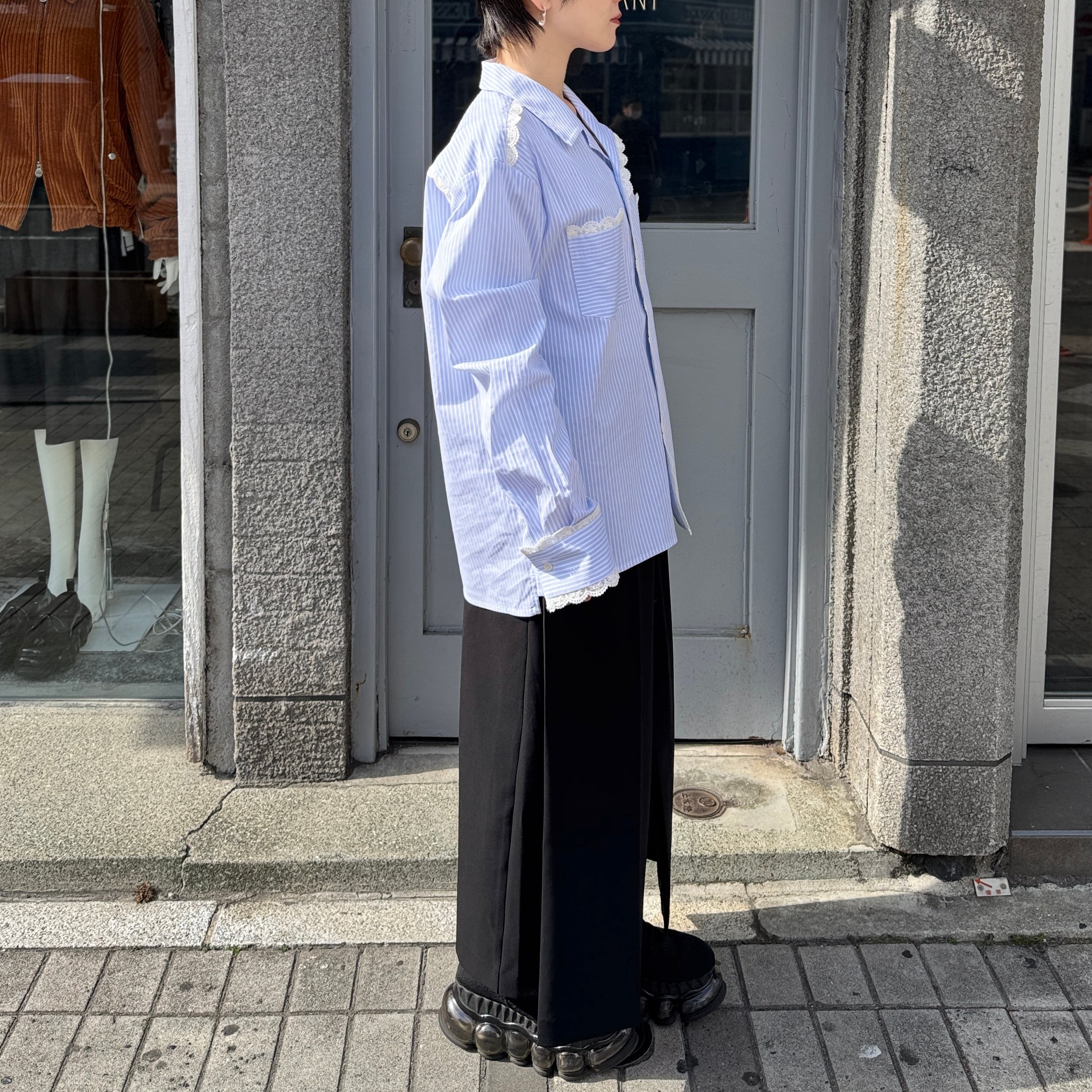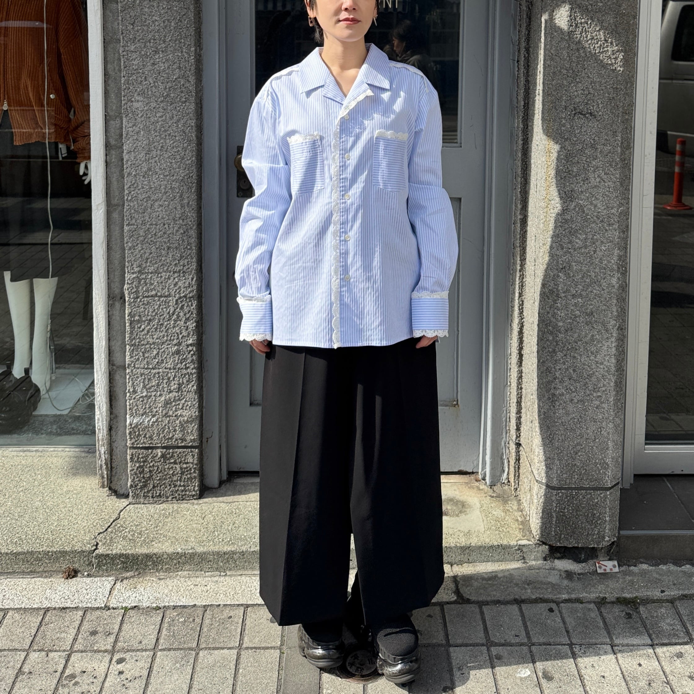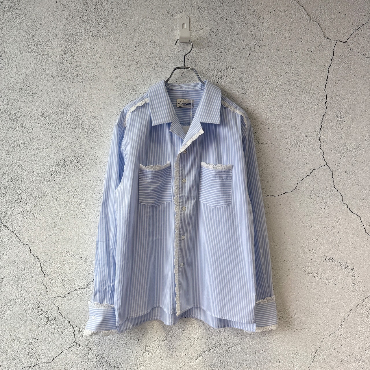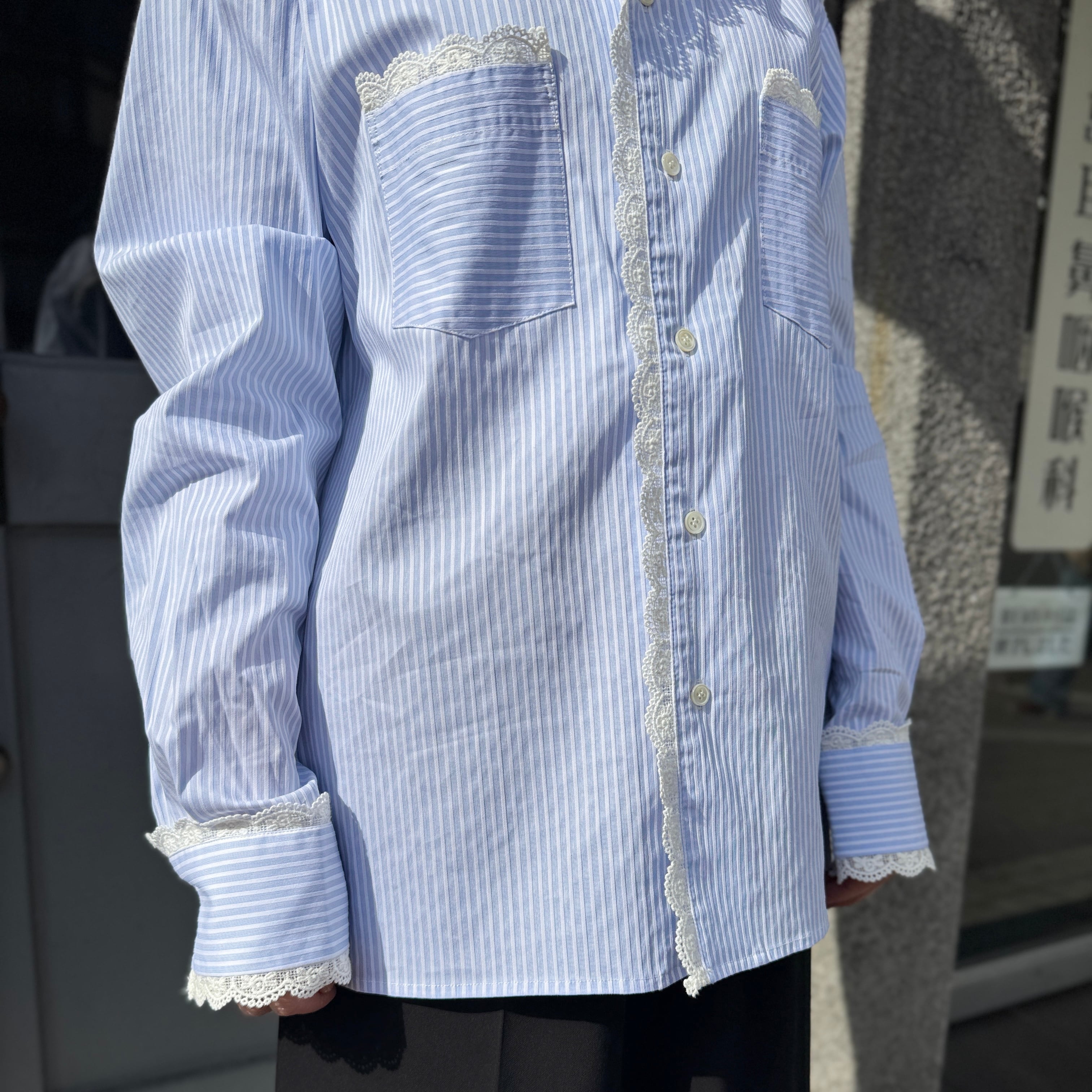 襟や袖にレースが施されたストライプのオープンカラーシャツ