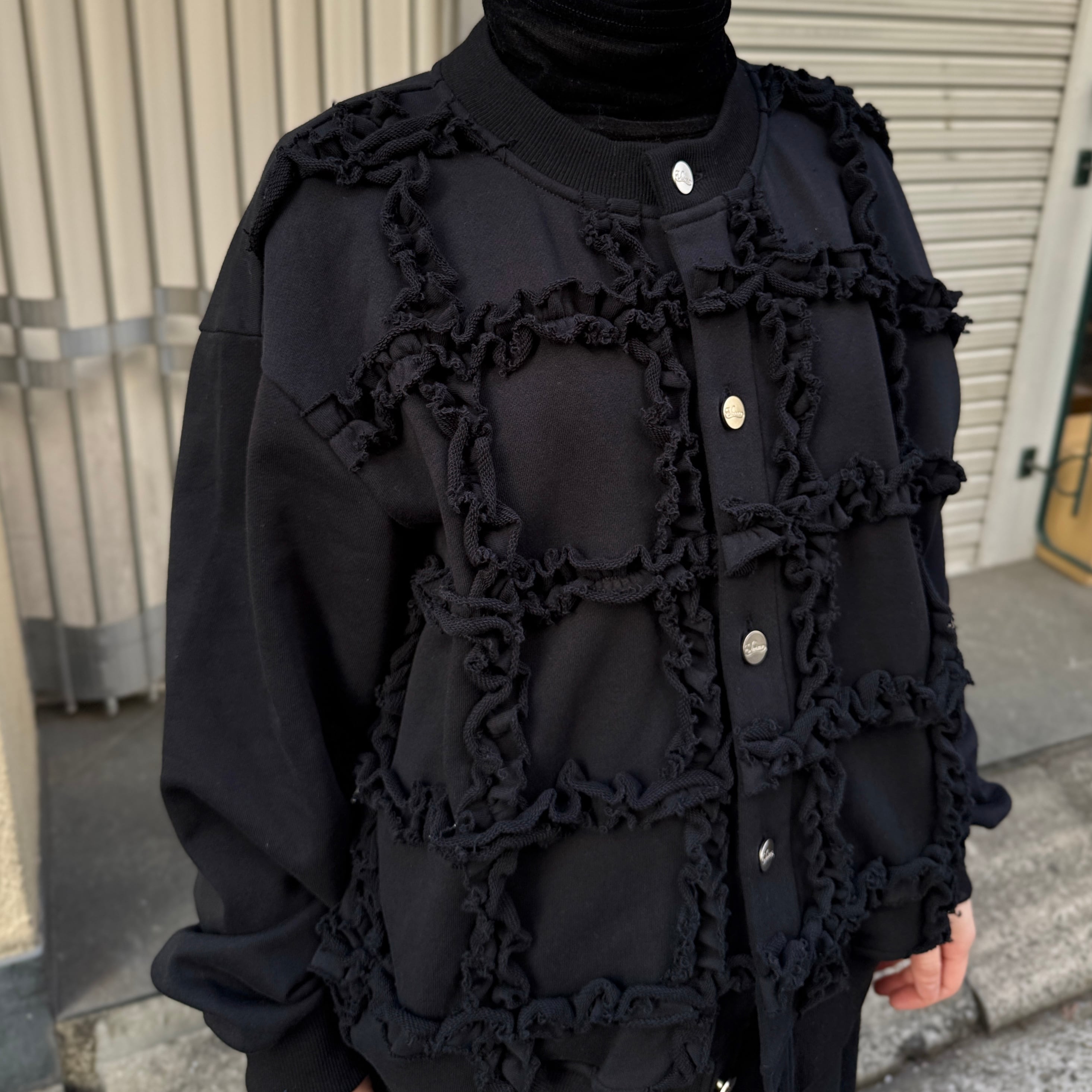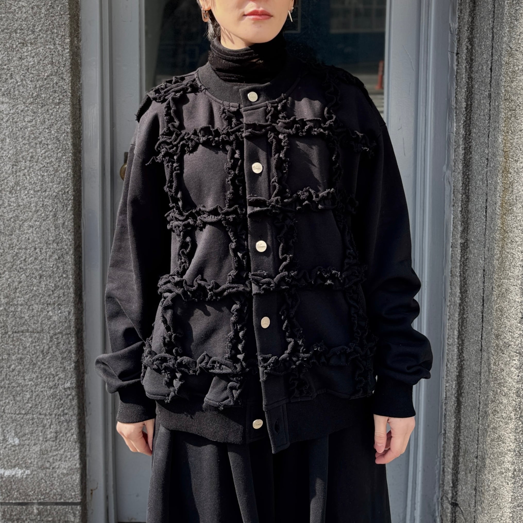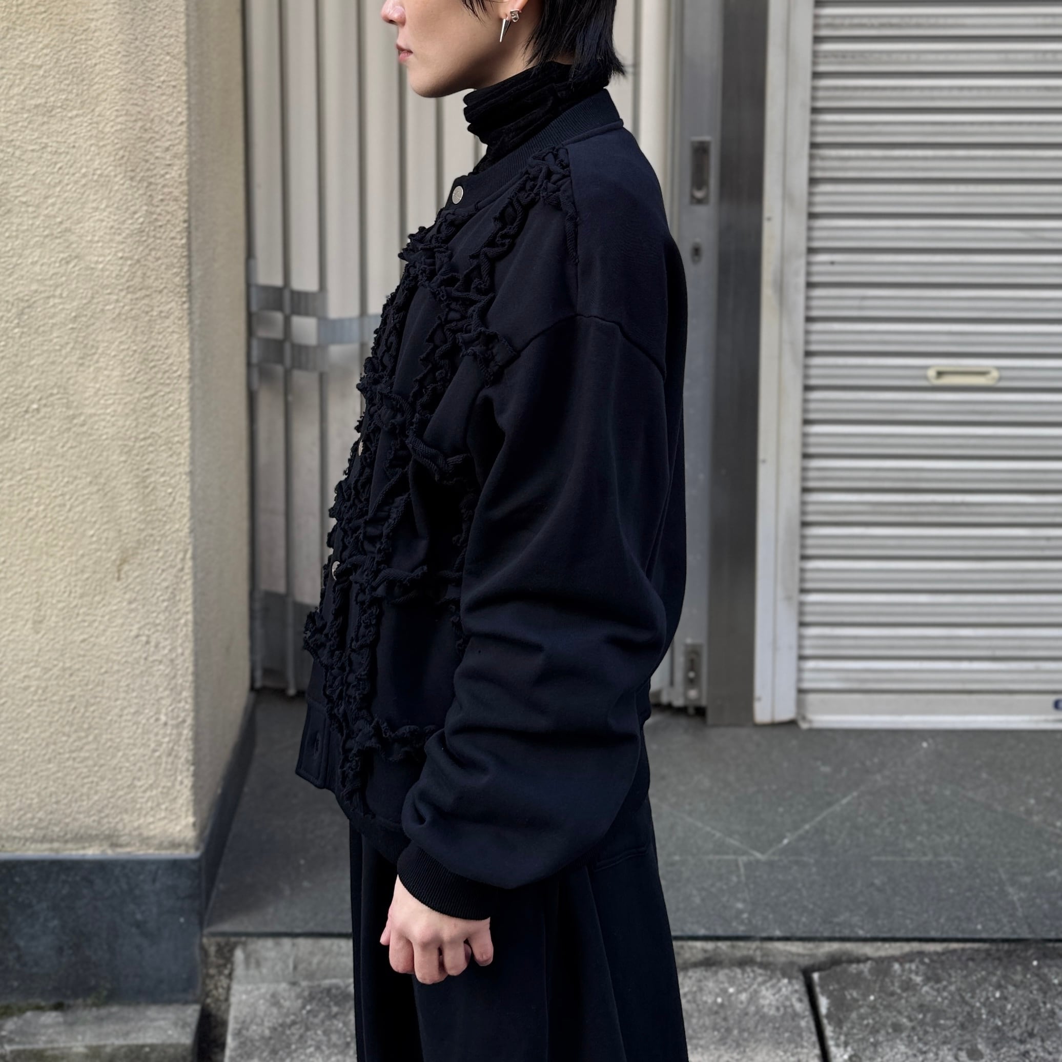 ラッフルを大胆に施したスウェット生地のカーディガン
