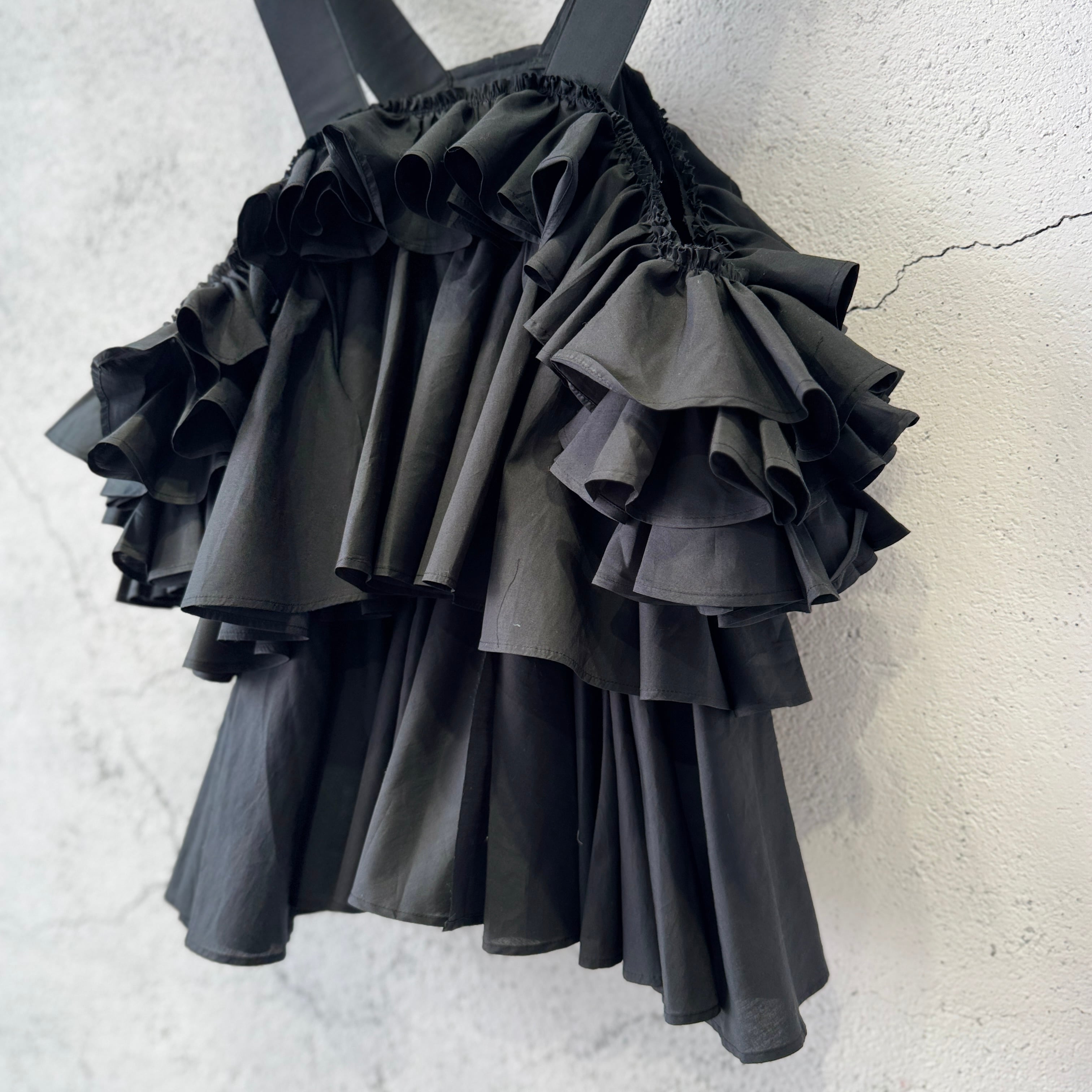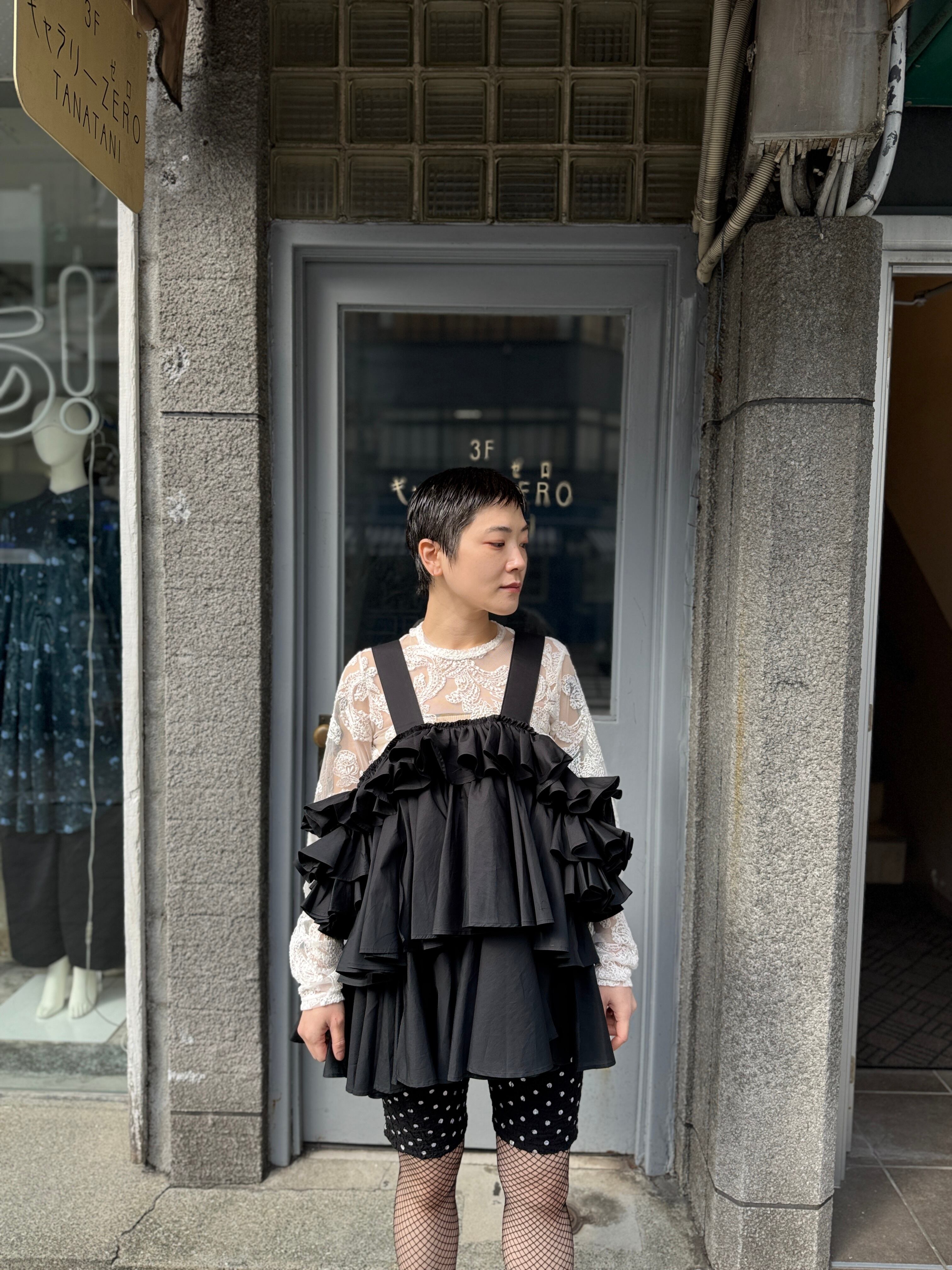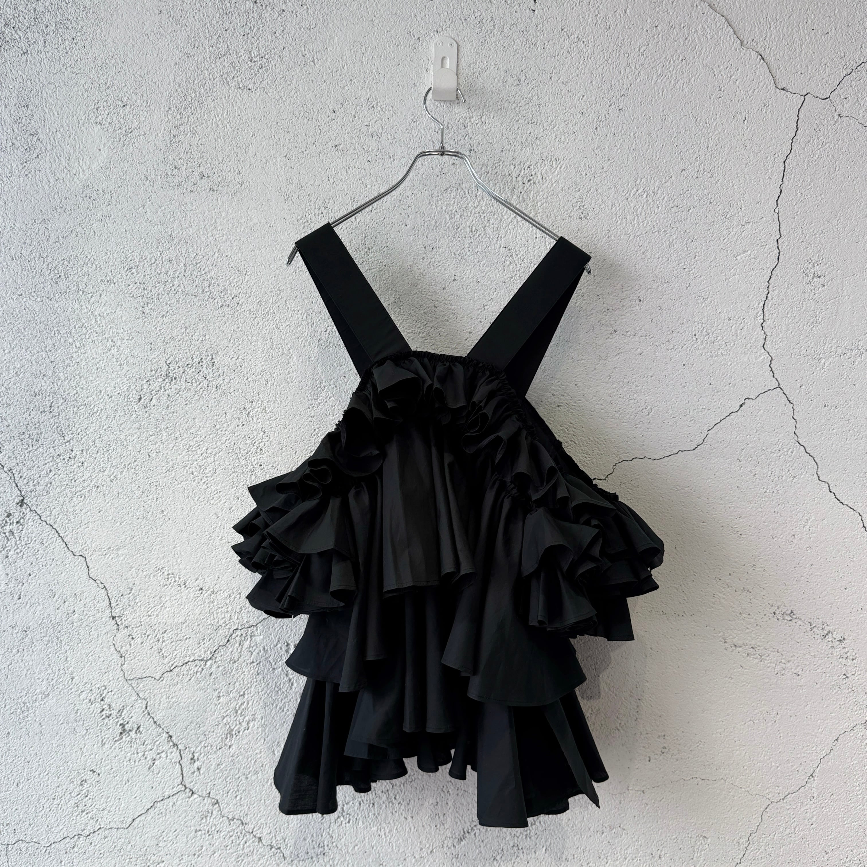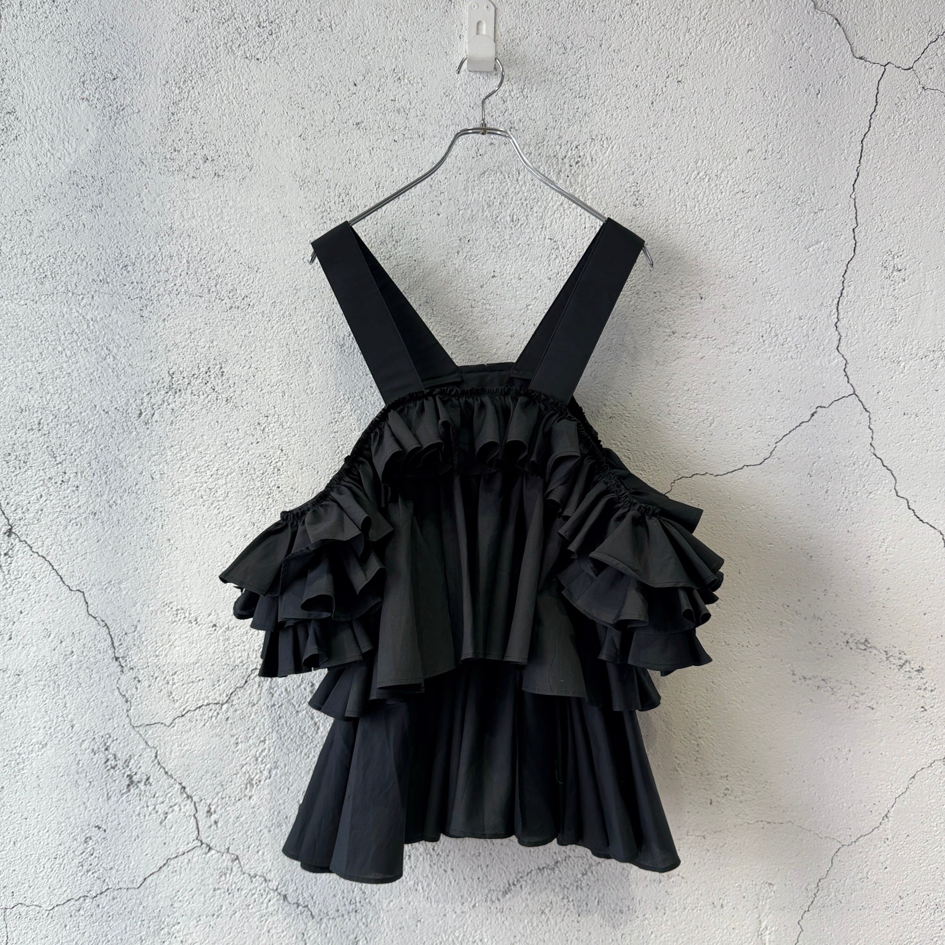 シャツ地のラッフルを段々にして構成したキャミブラウス。