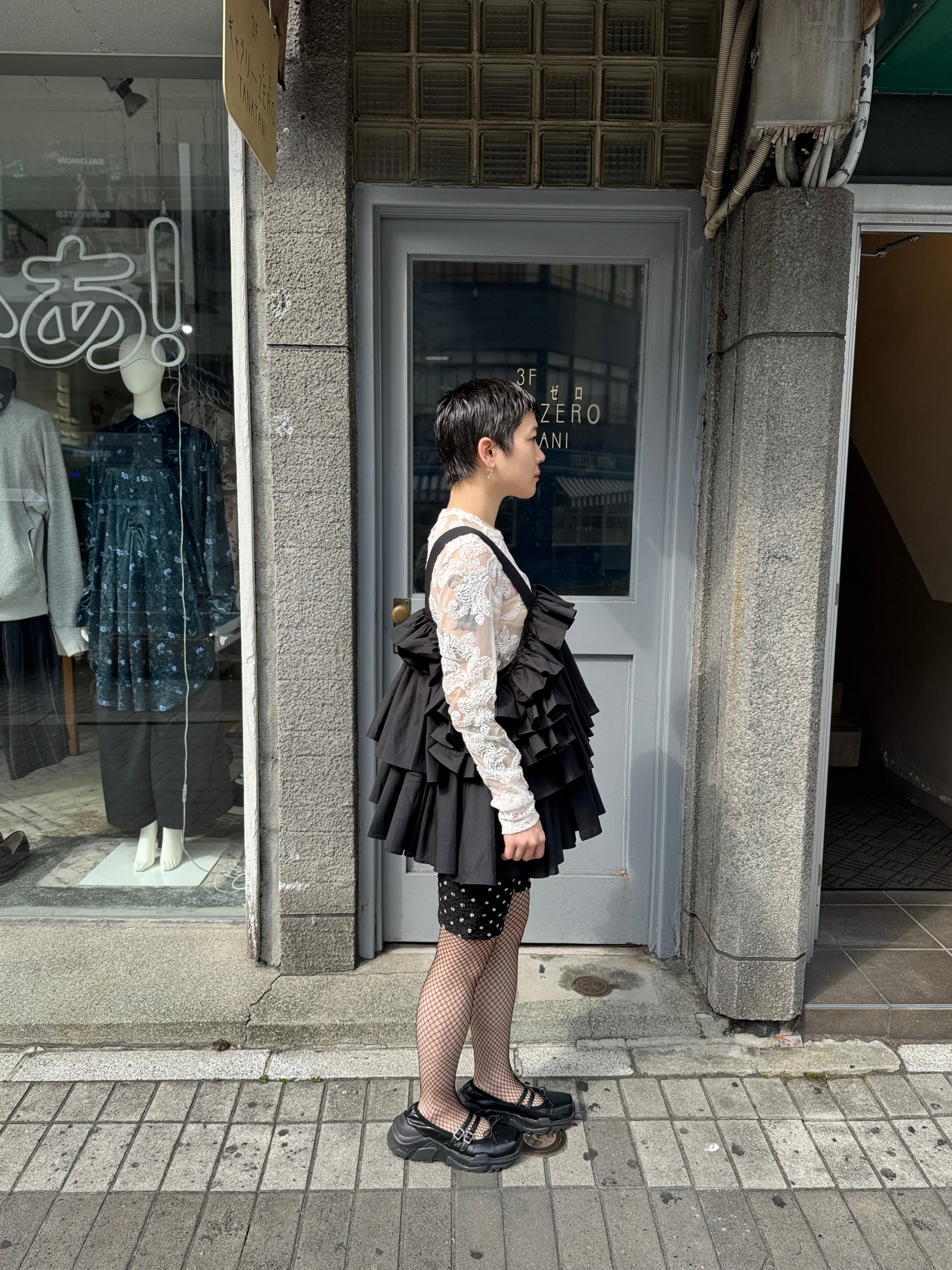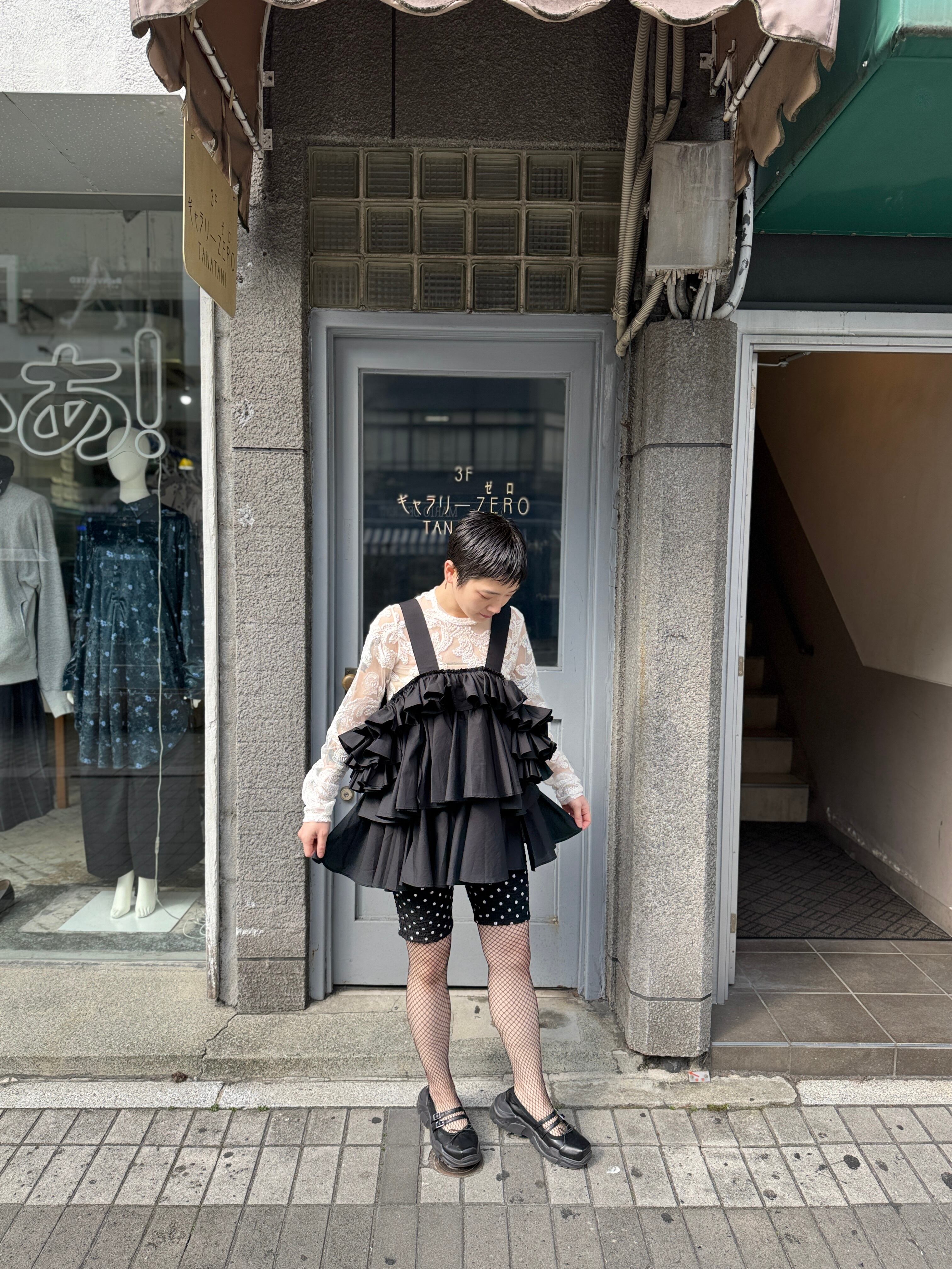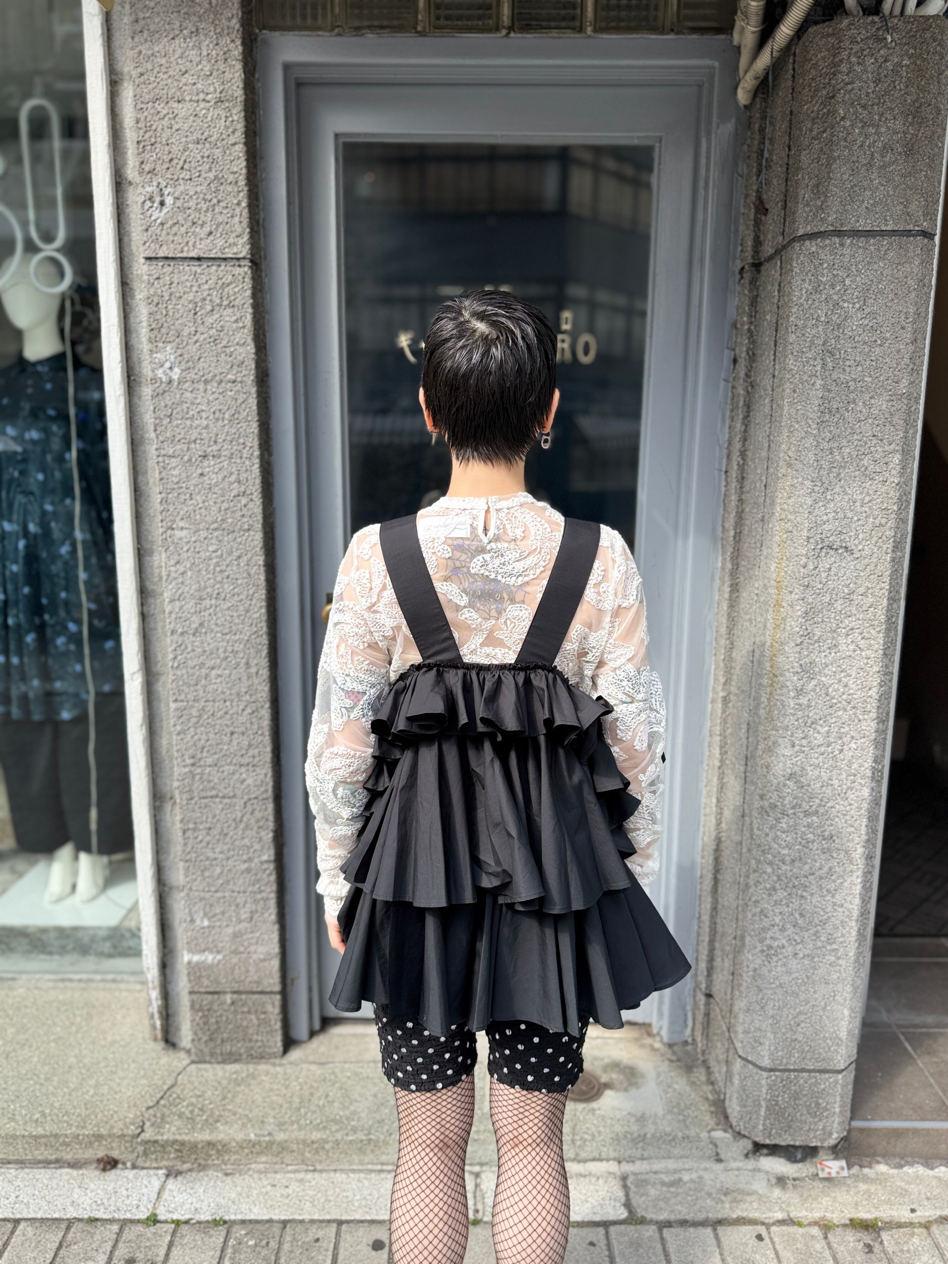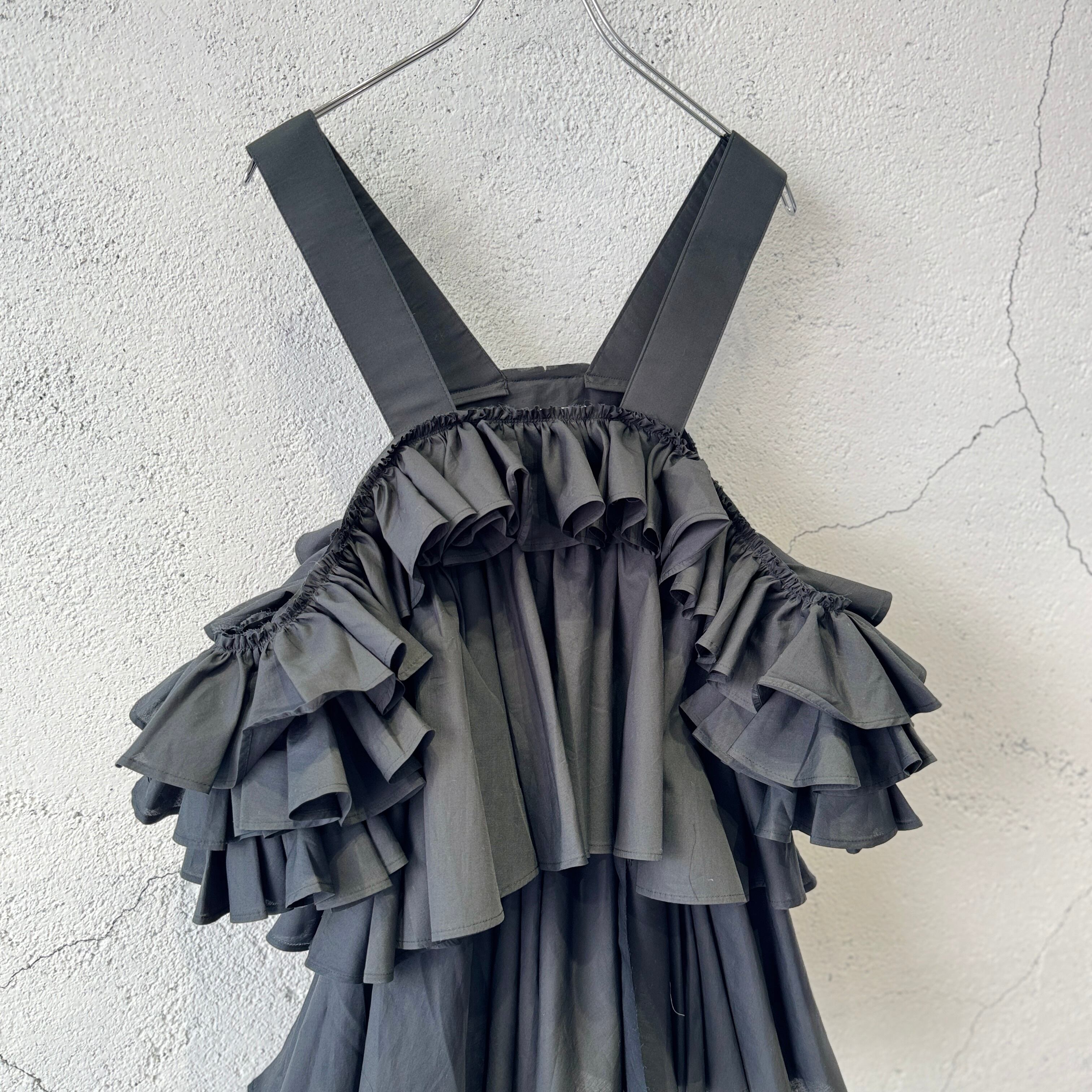 シャツ地のラッフルを段々にして構成したキャミブラウス。