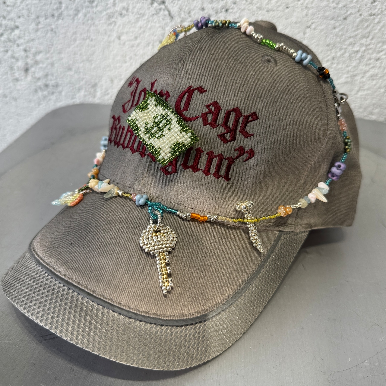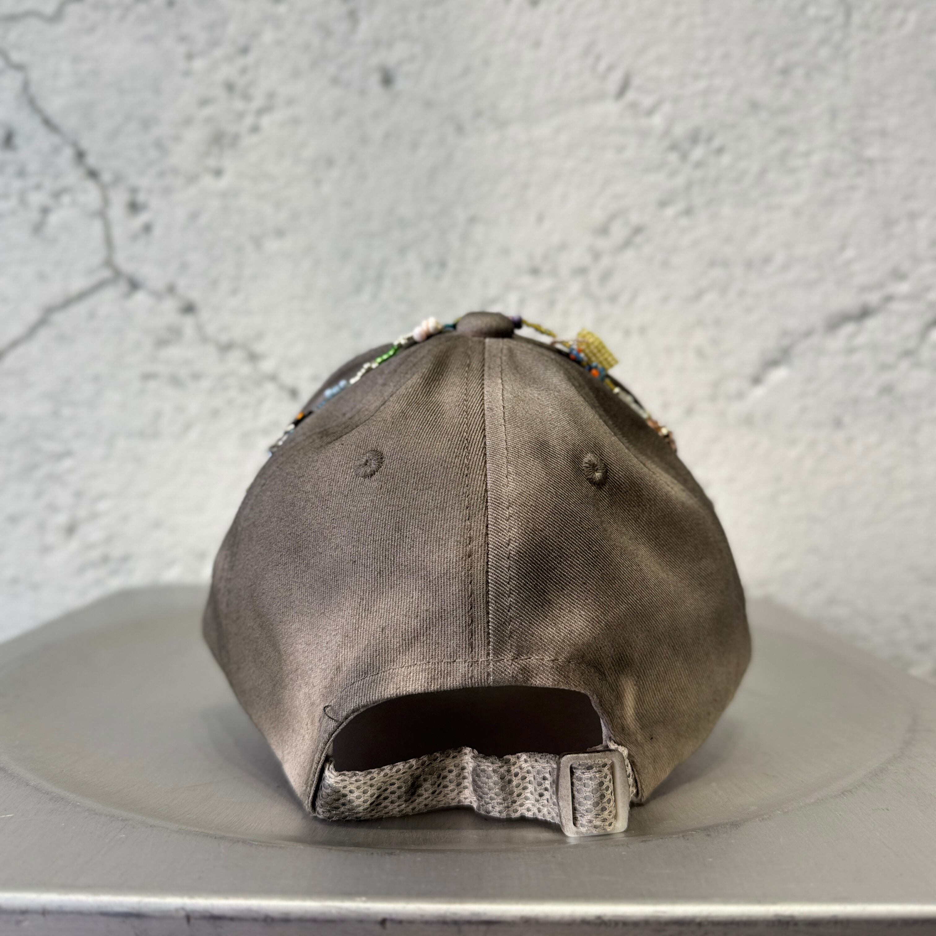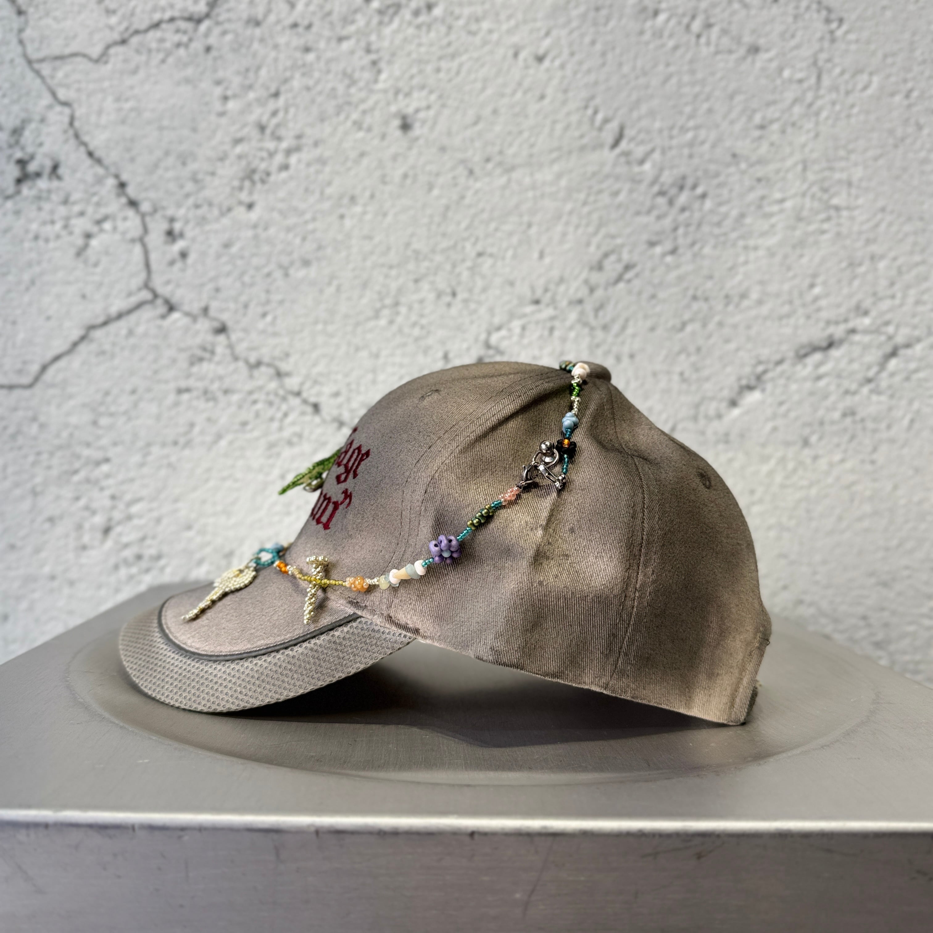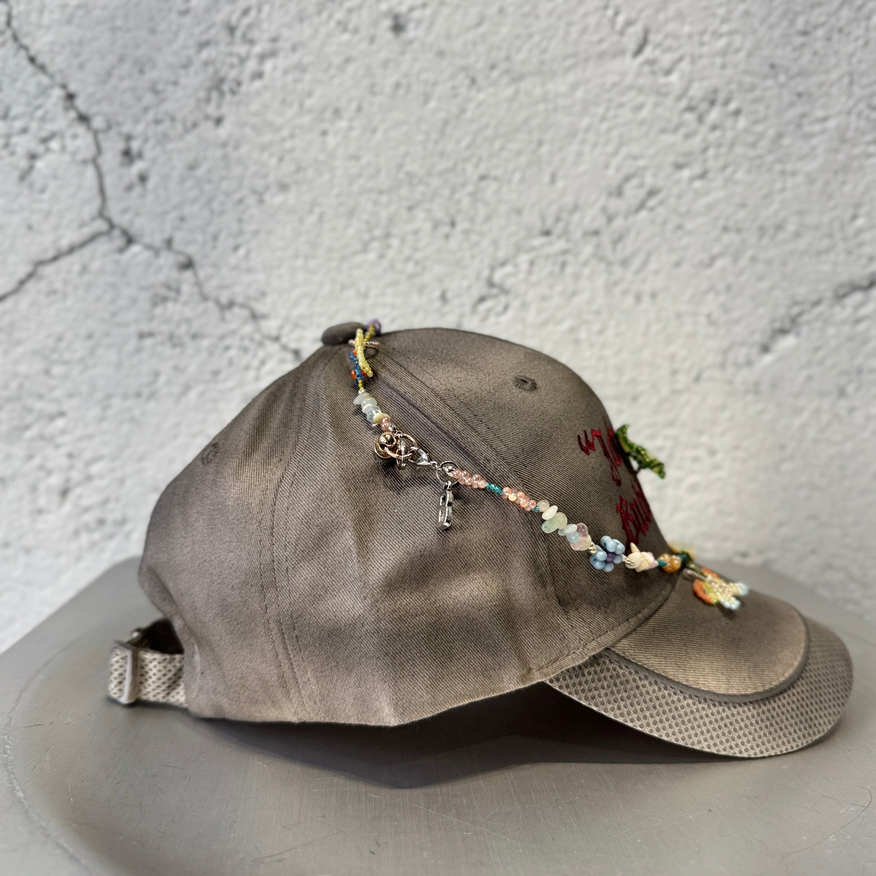 大胆なスプレーペイントを施したキャップにハンドクラフトビーズネックレスをチェーンのように取り付けた、他にはないスペシャルなキャップ