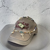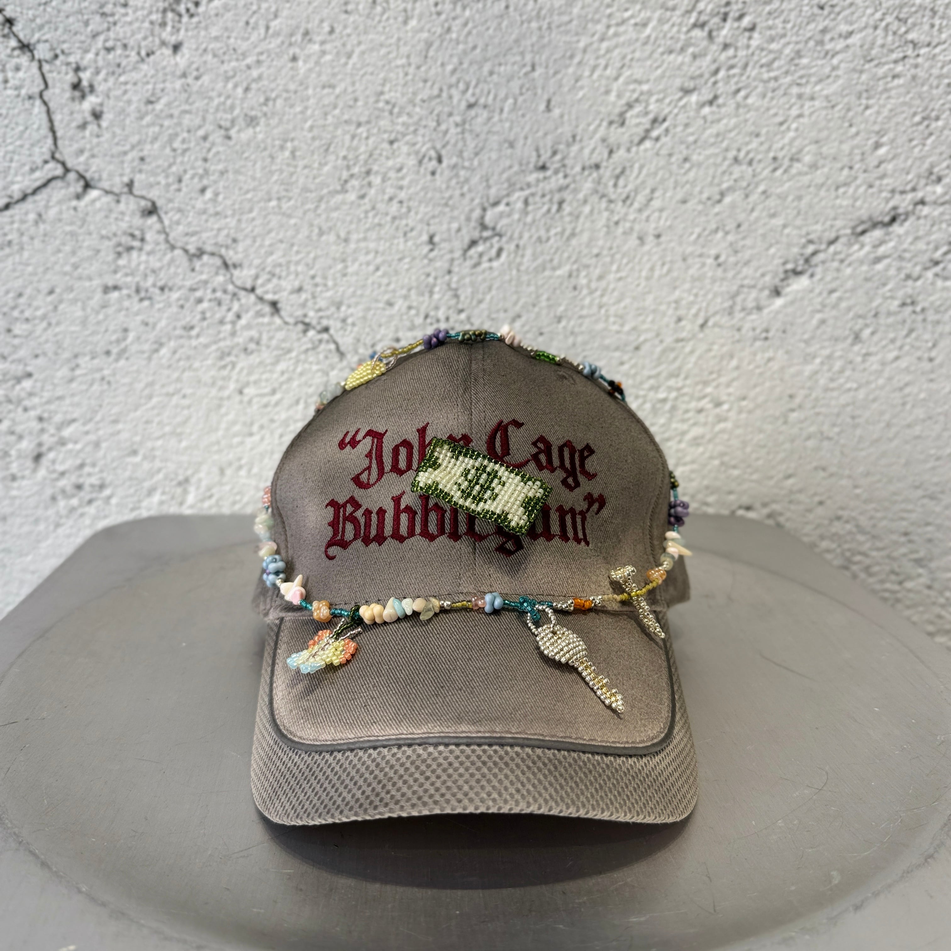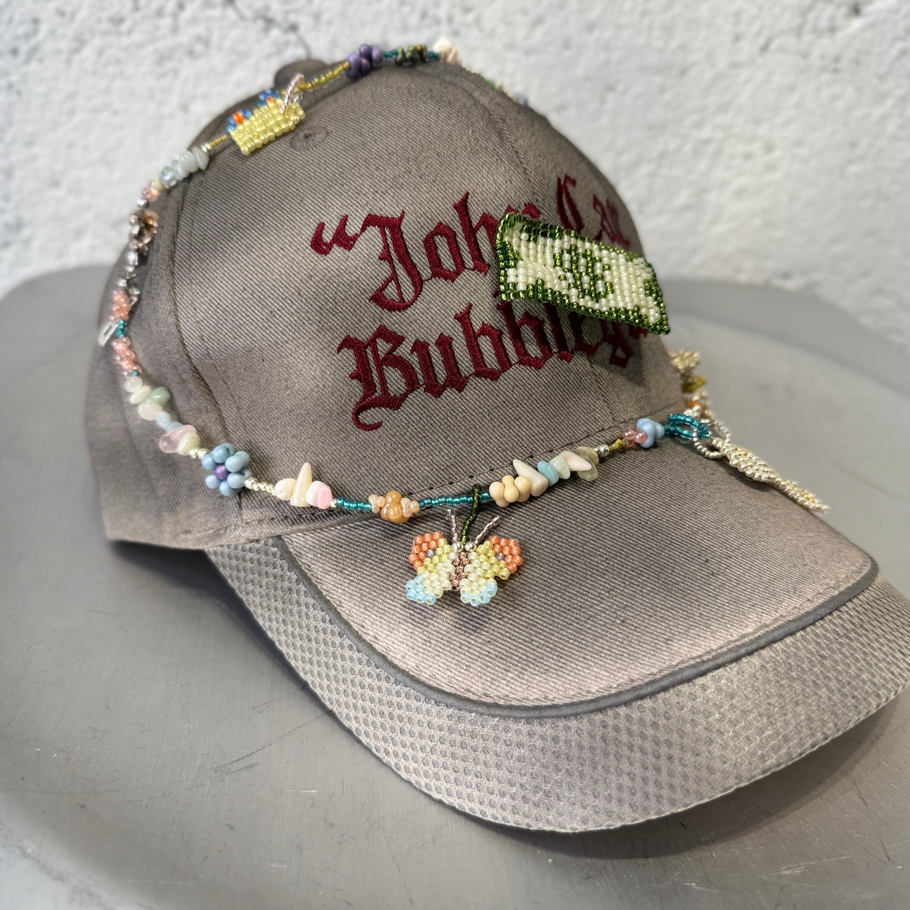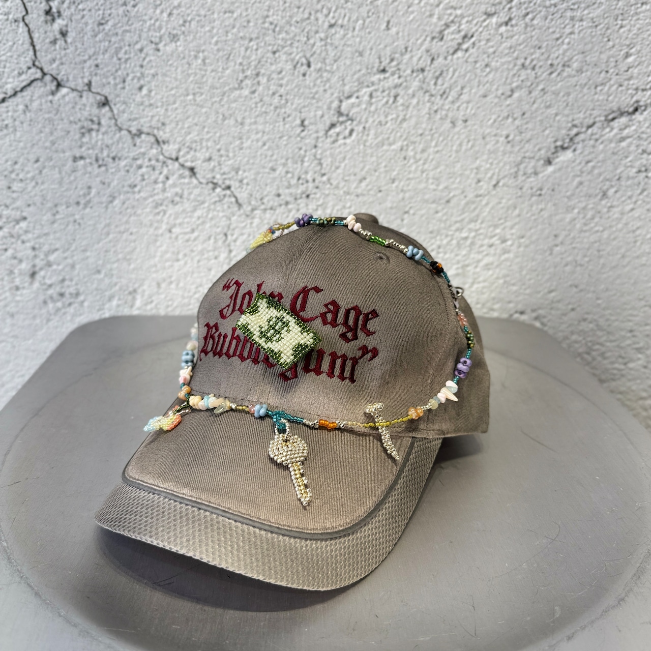 大胆なスプレーペイントを施したキャップにハンドクラフトビーズネックレスをチェーンのように取り付けた、他にはないスペシャルなキャップ