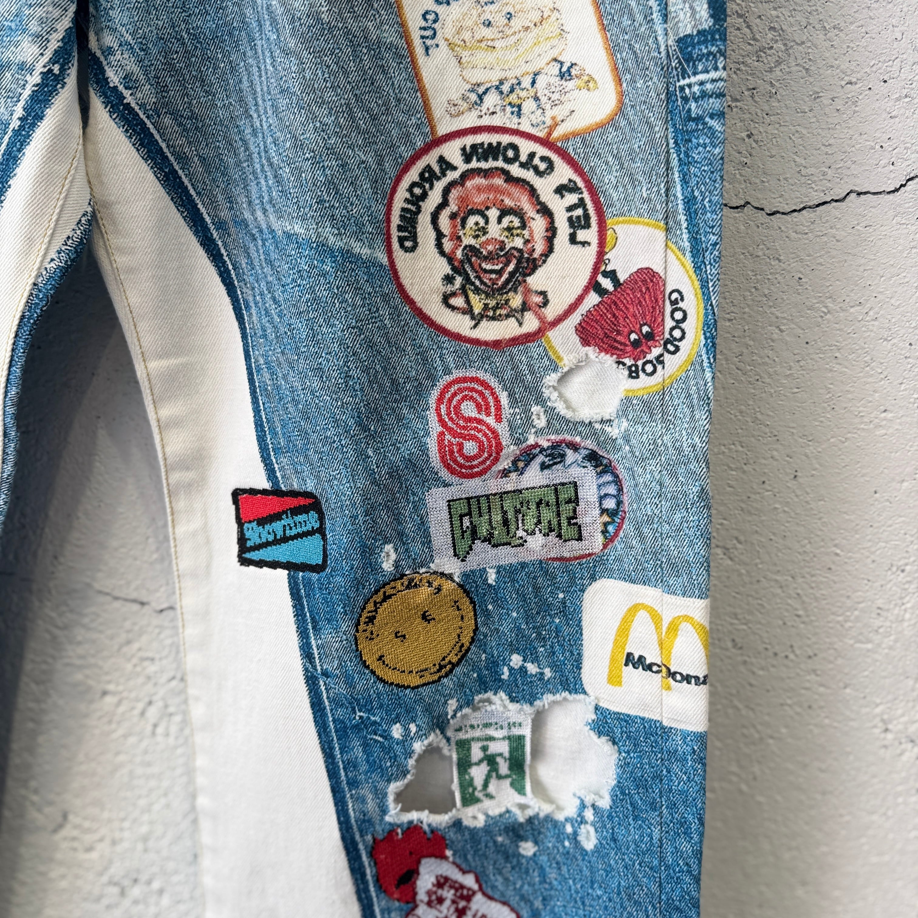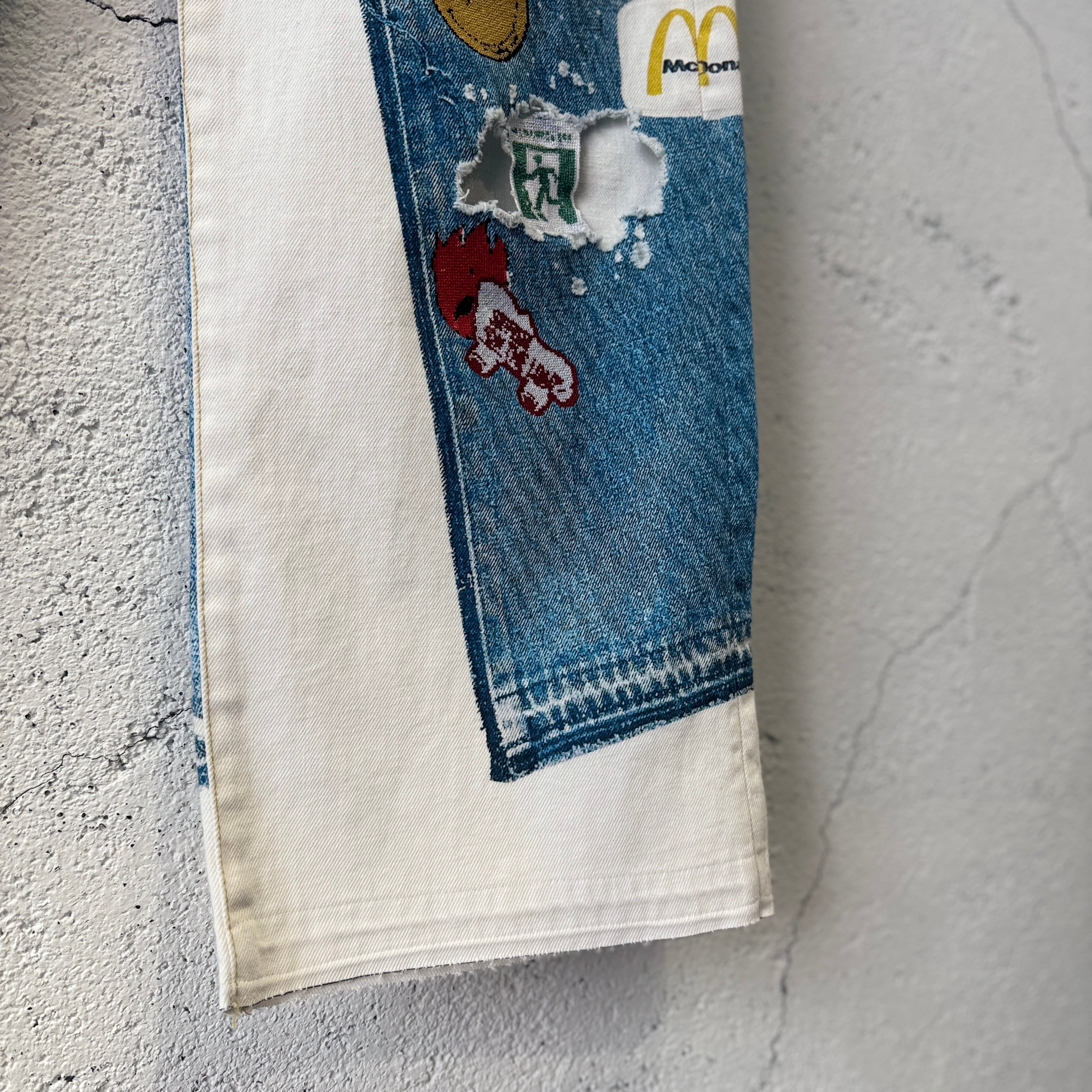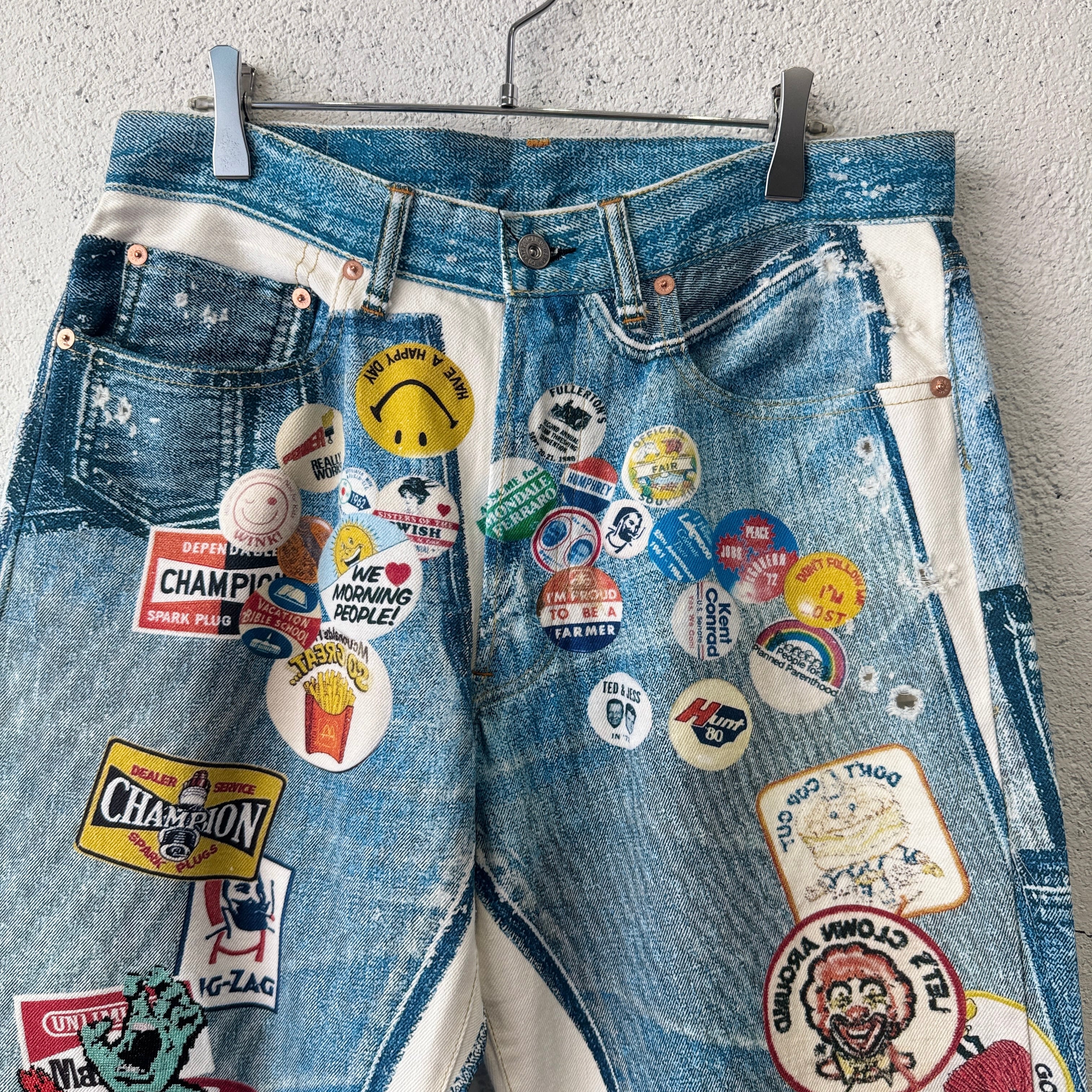 デザイナー自身が15,6歳の頃に着ていた古着のデニムパンツや当時所有していたヴィンテージのバッジなどをホワイトデニムに転写した、だまし絵のようなデニムパンツ