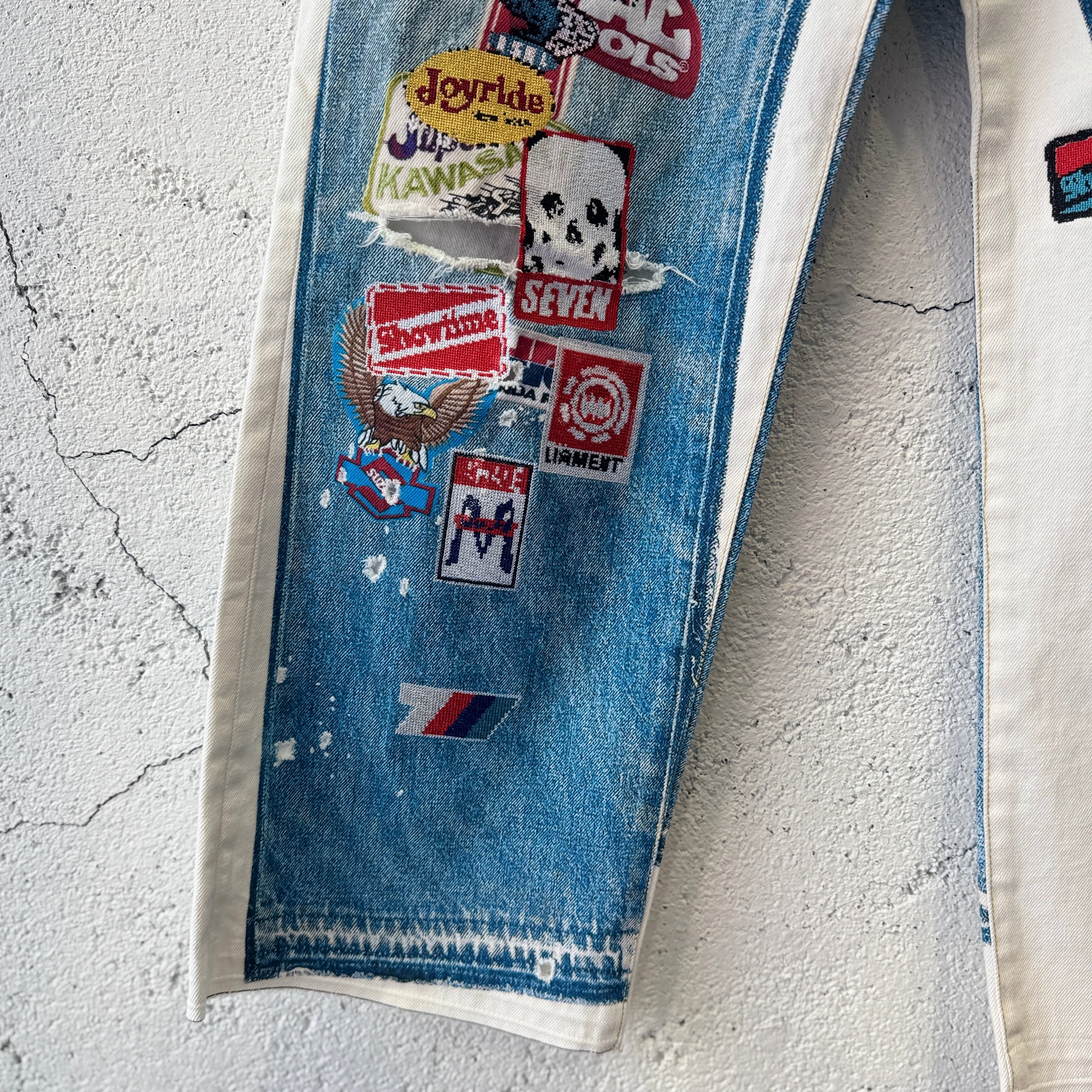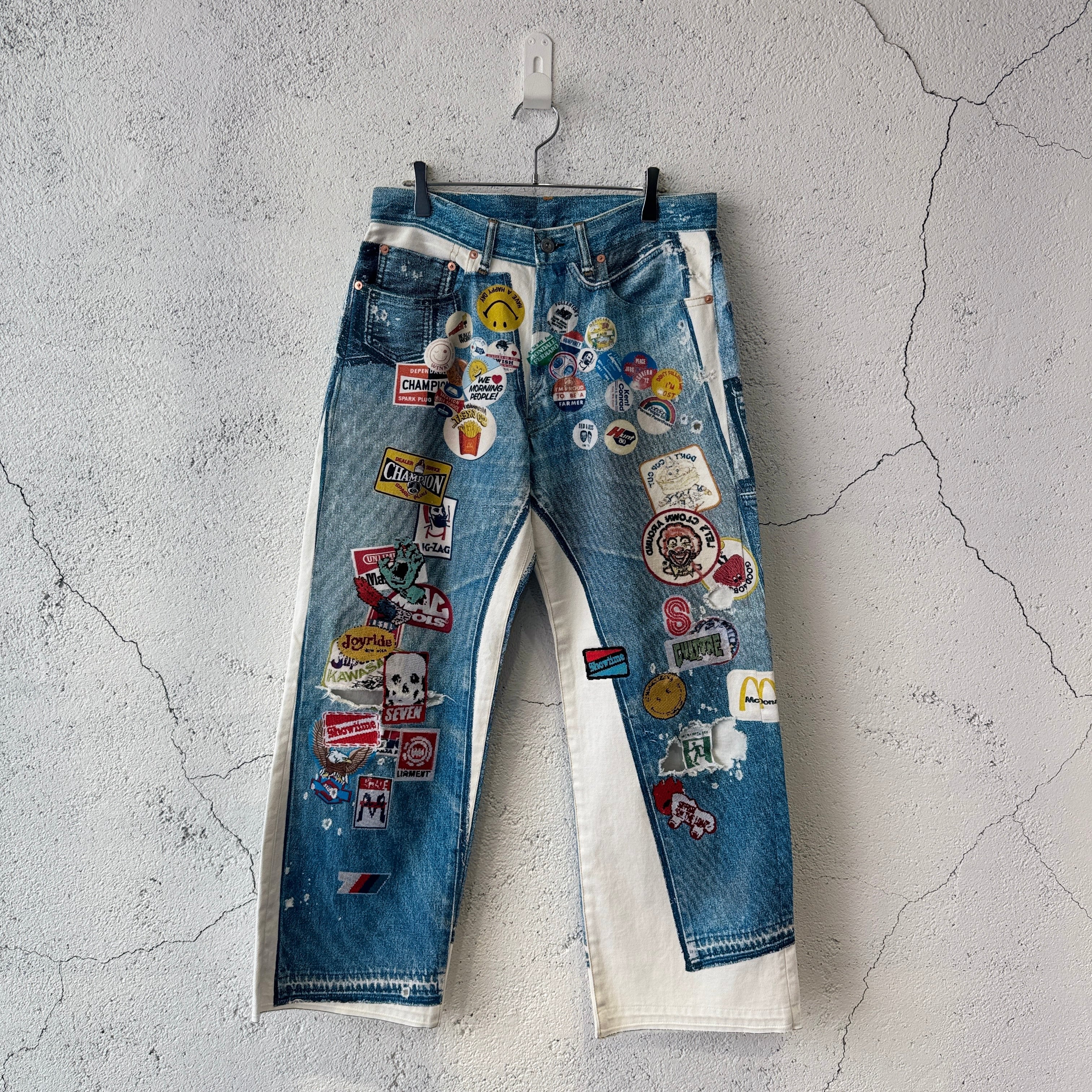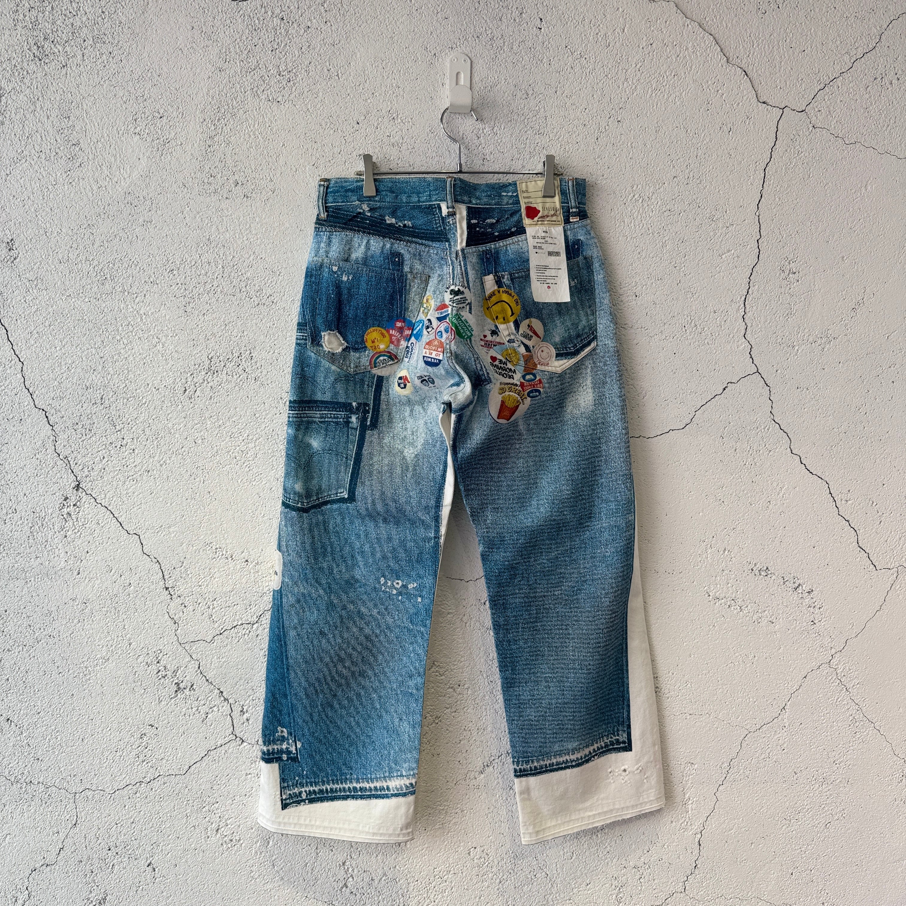 デザイナー自身が15,6歳の頃に着ていた古着のデニムパンツや当時所有していたヴィンテージのバッジなどをホワイトデニムに転写した、だまし絵のようなデニムパンツ